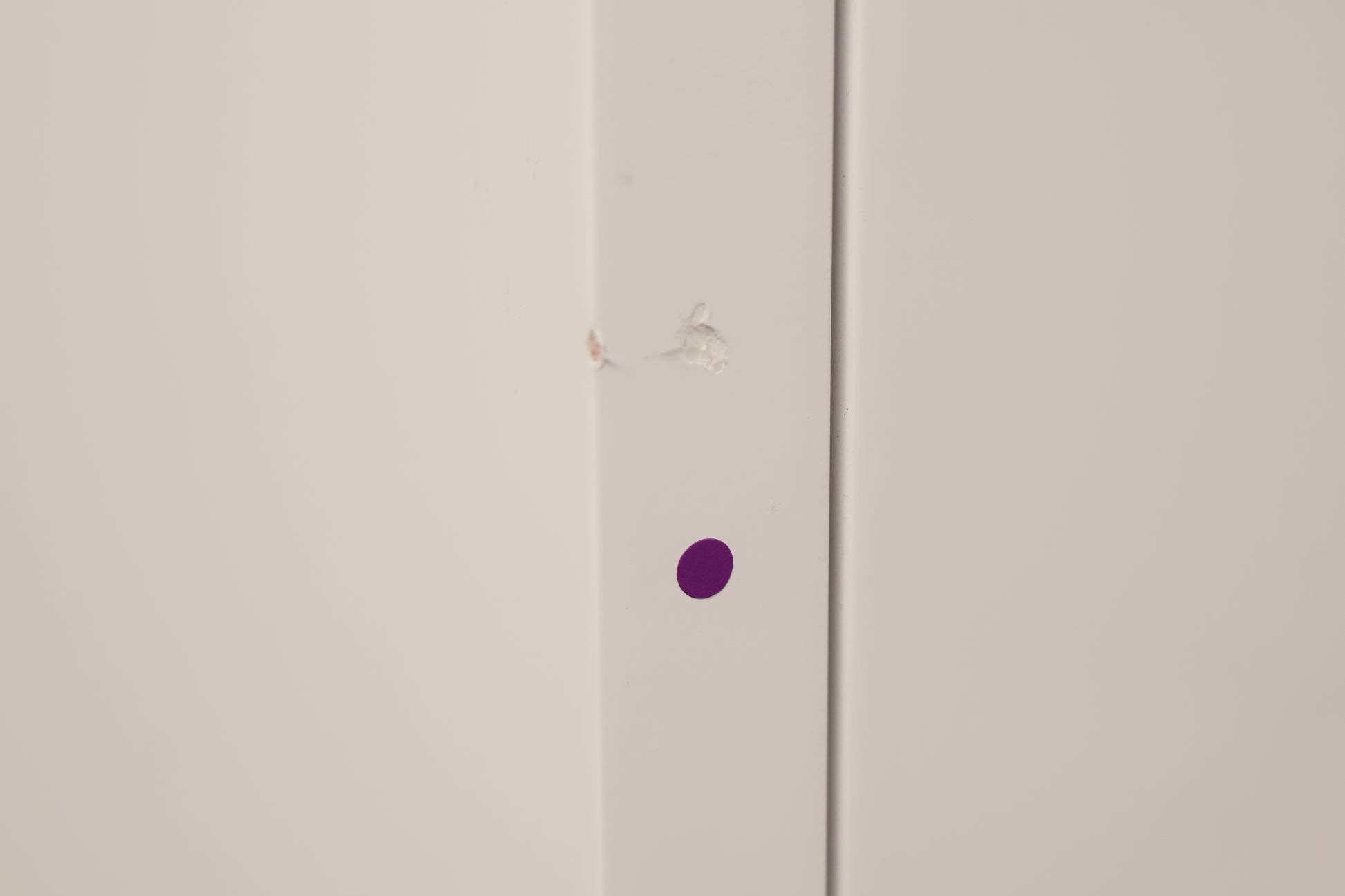 Tall, white bathroom unit which could serve many purposes including additional freestanding storage in a garage or kitchen.