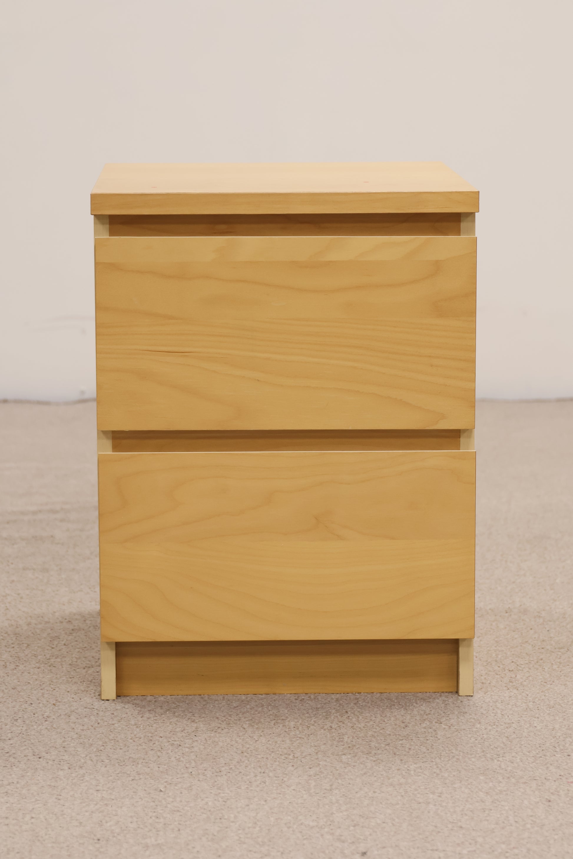 Sleek and functional, this modern bedside table features two spacious drawers for storing essentials within arm's reach.