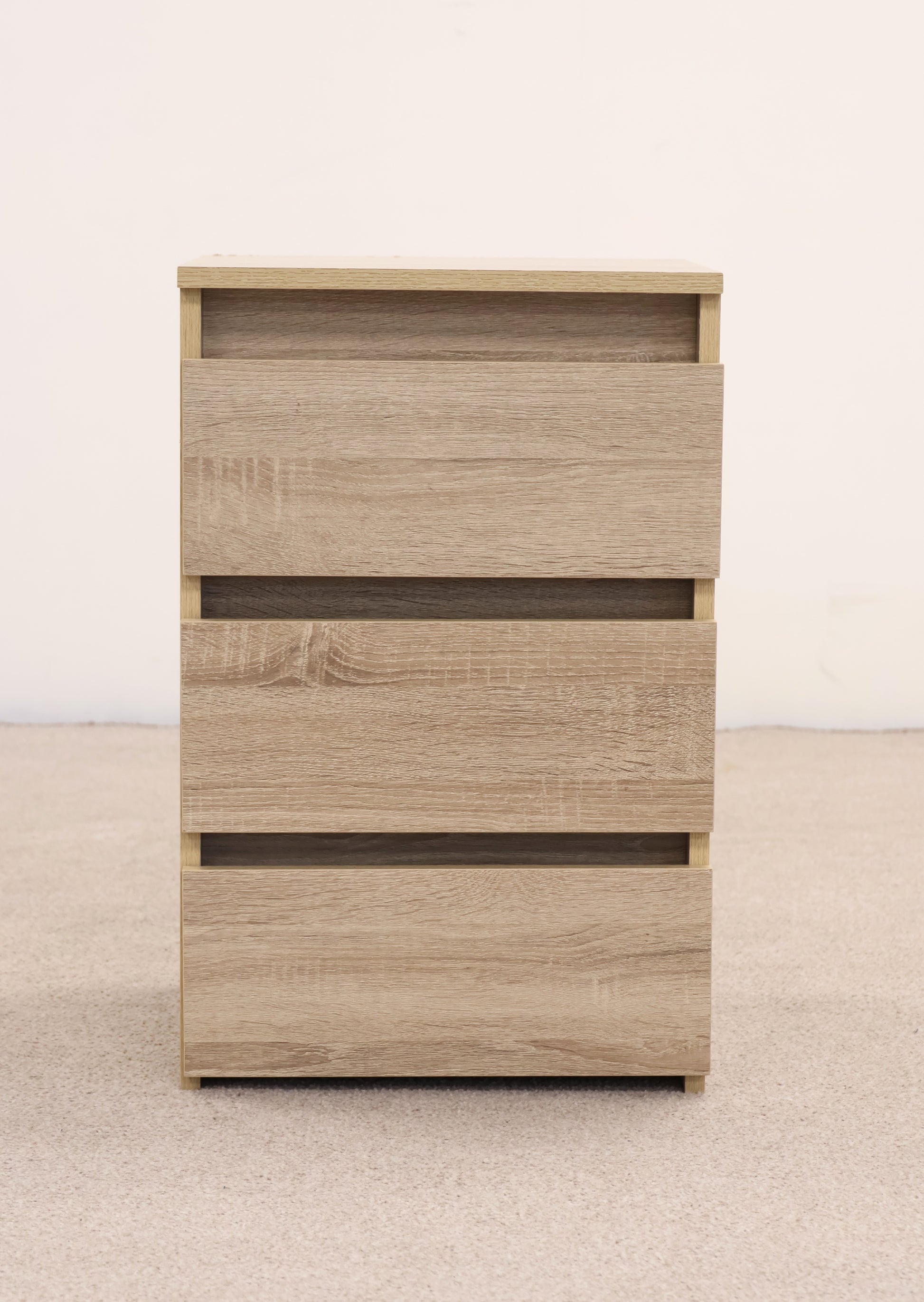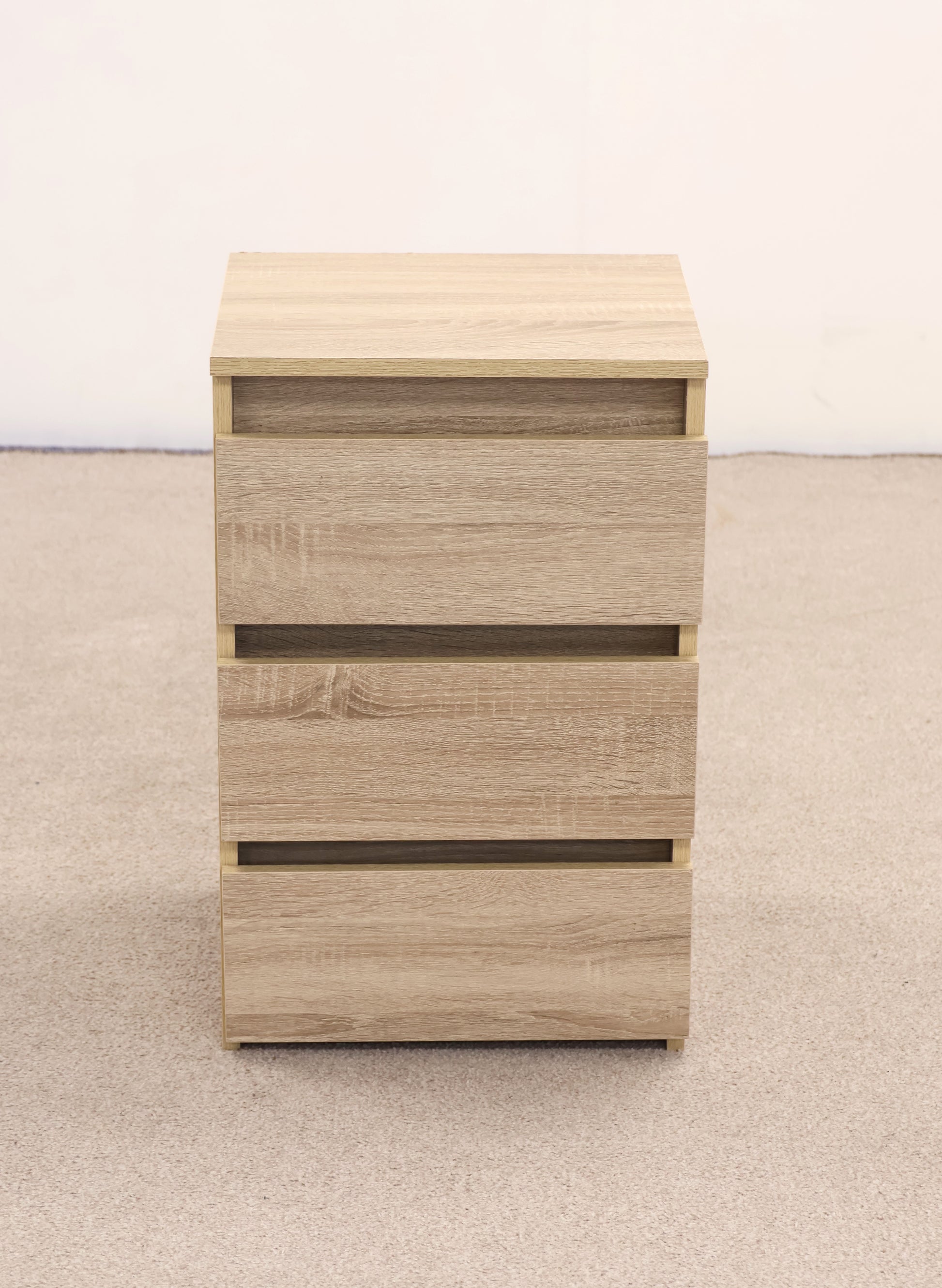 Neat bedside unit with three storage drawers with a blend of brown and grey in colour.