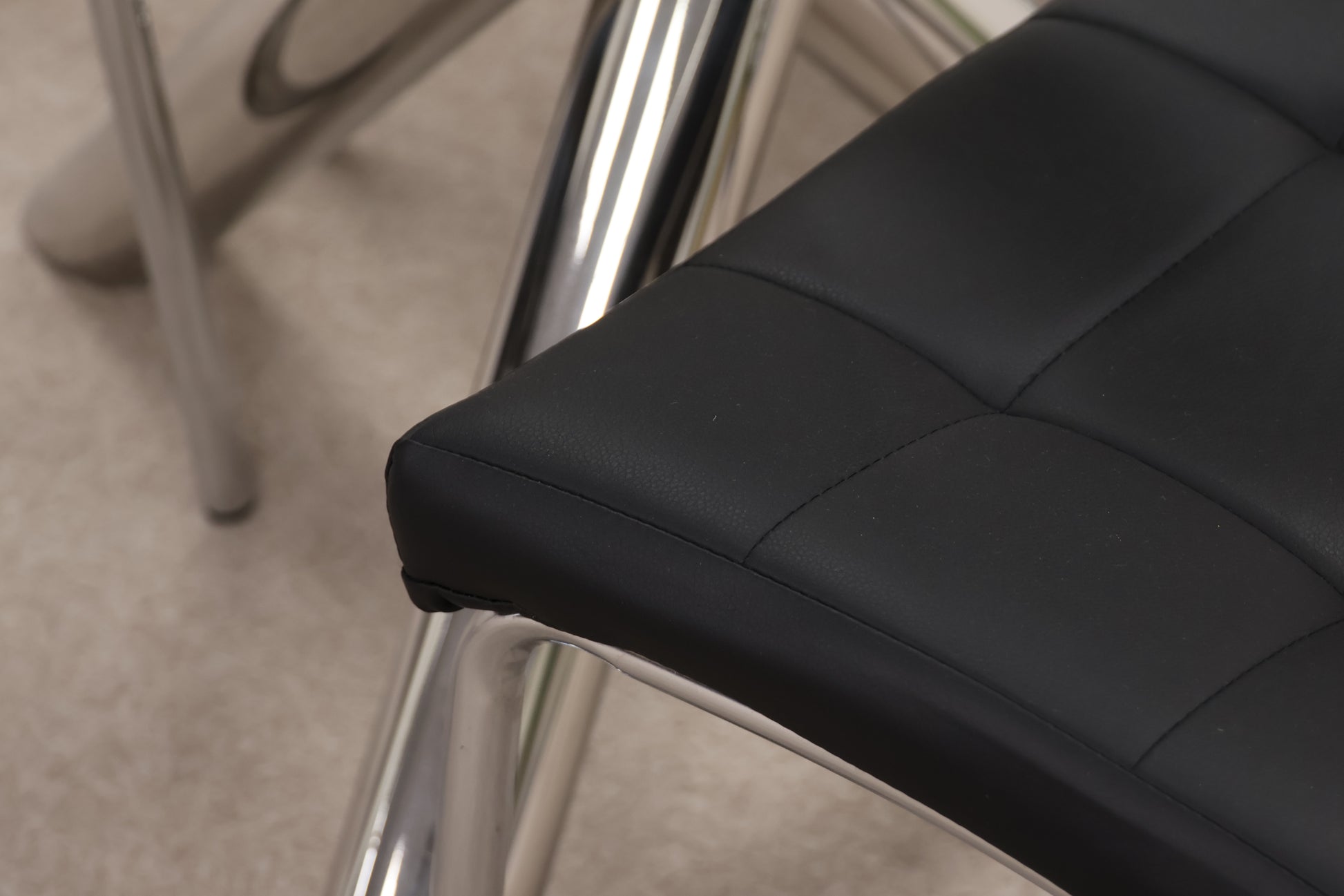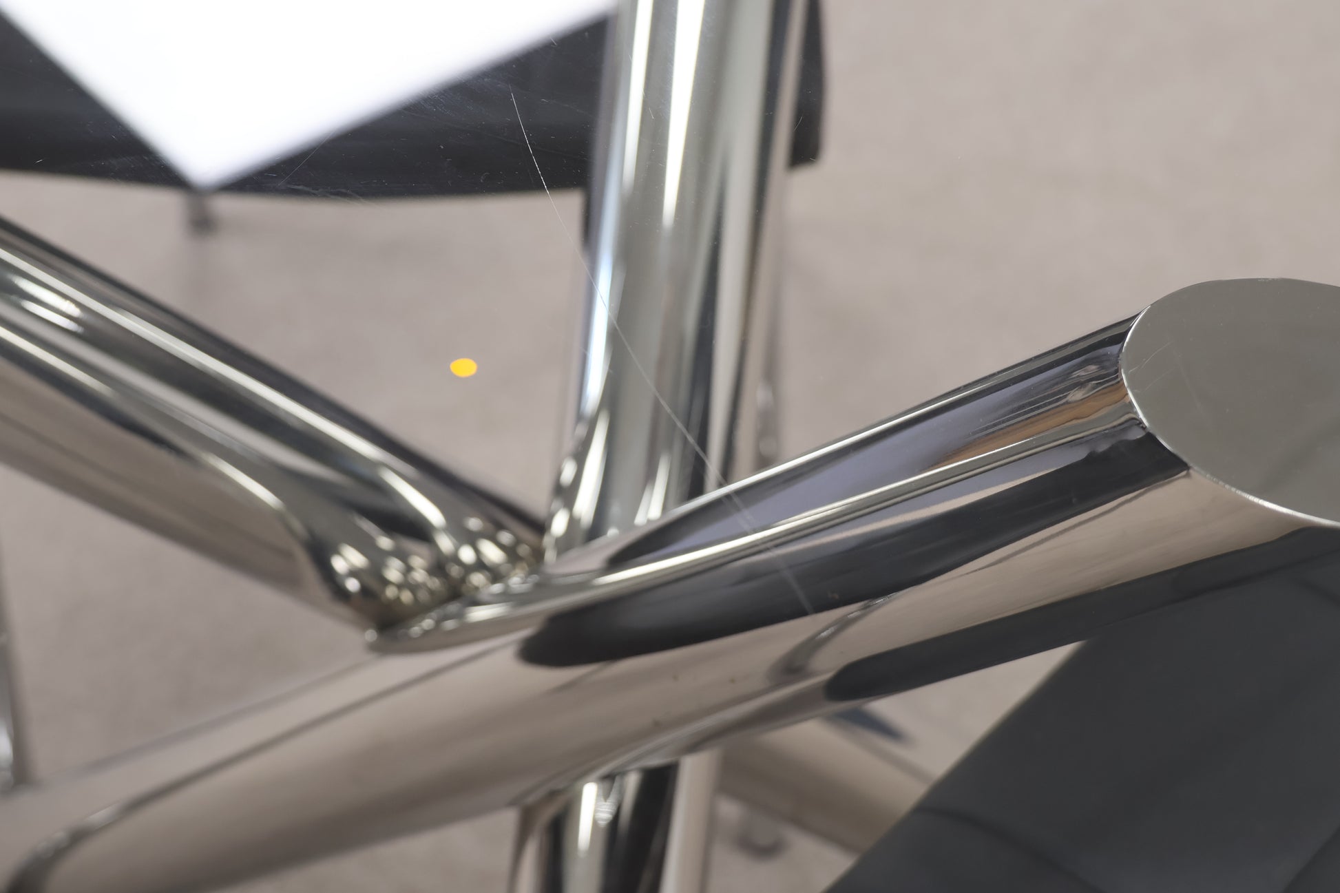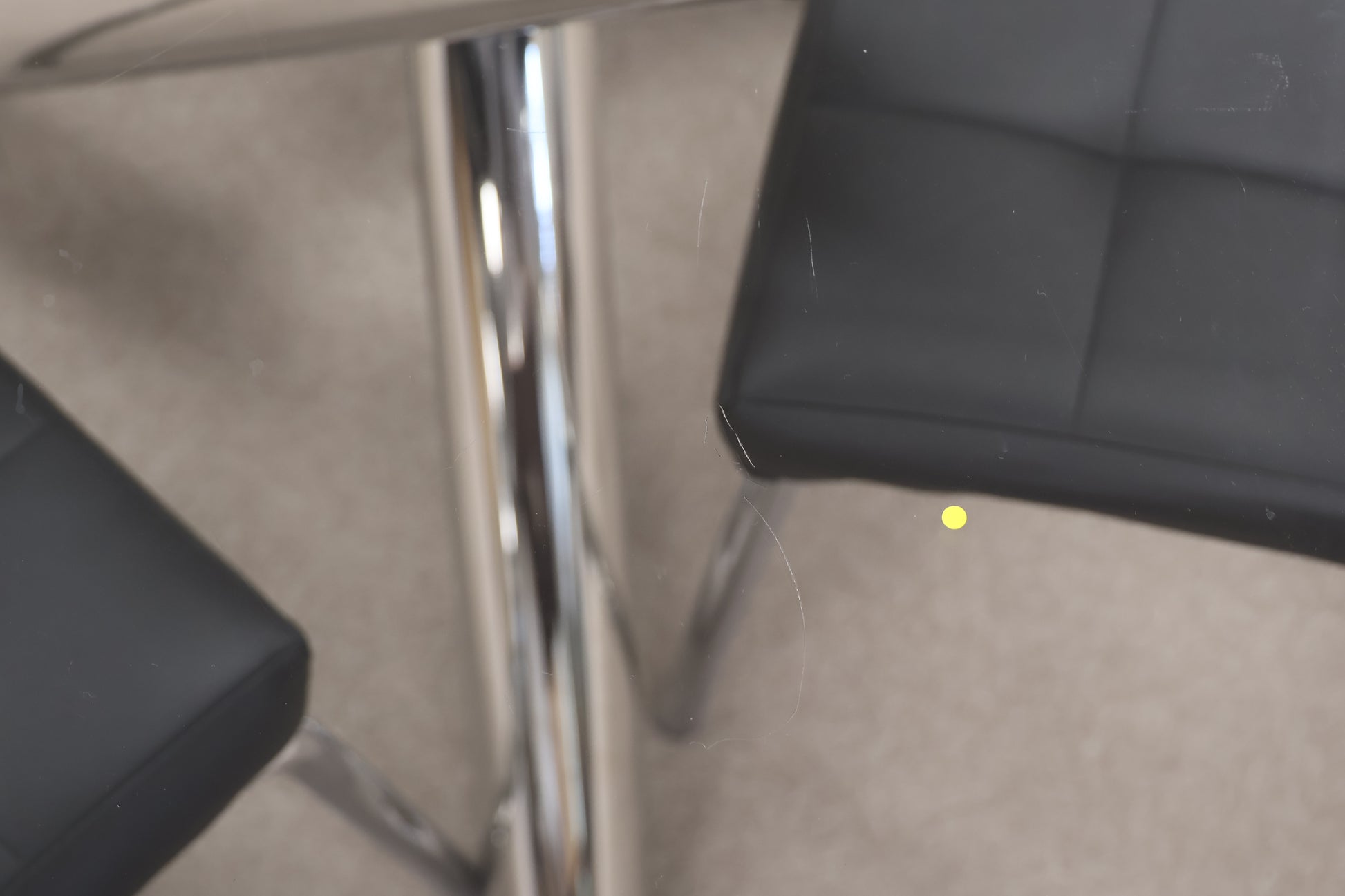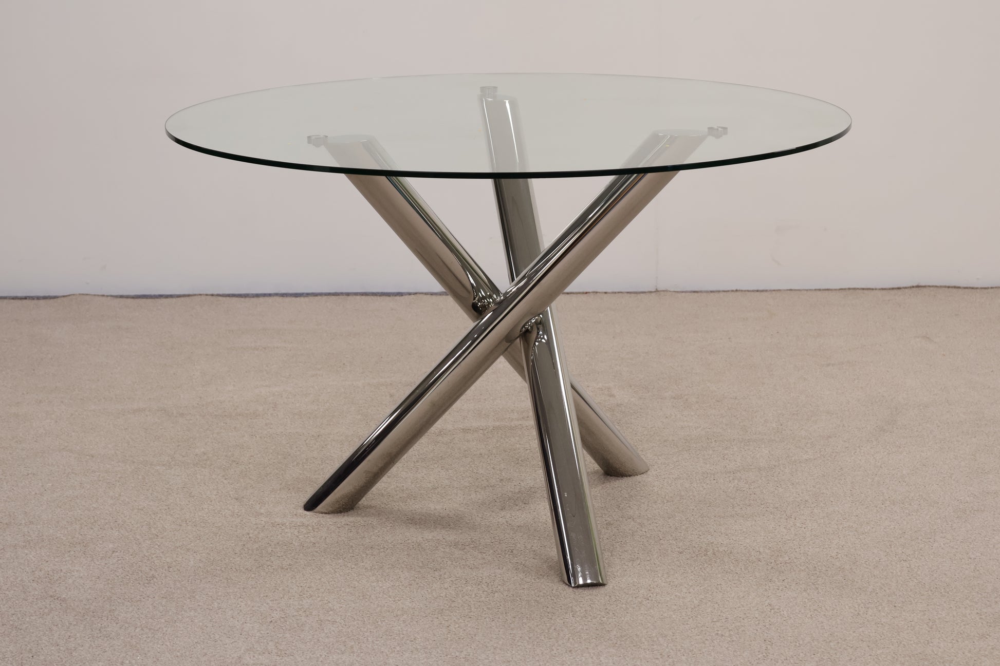 It features a stunning chrome pedestal base that supports a clear circular glass top, creating an airy, open look ideal for kitchens or cosy apartments.