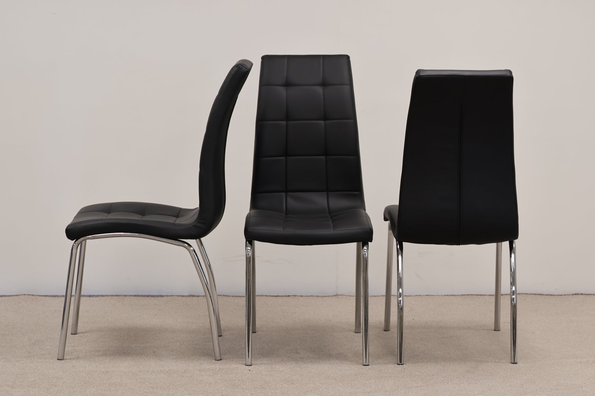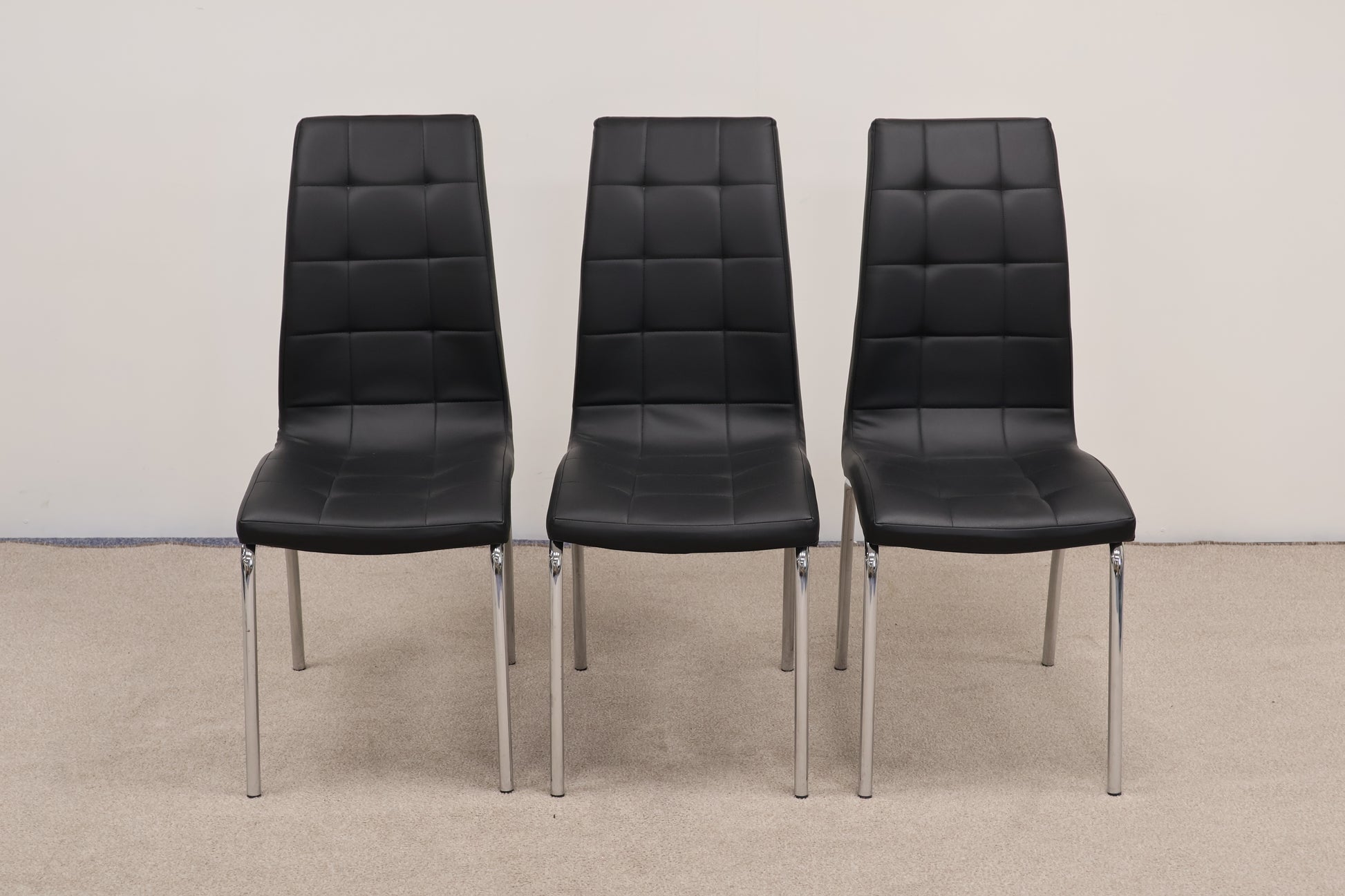 The set includes three black faux leather chairs, offering a sleek, modern contrast. In great preloved condition, this bundle is a sustainable and affordable way to furnish your home with character.