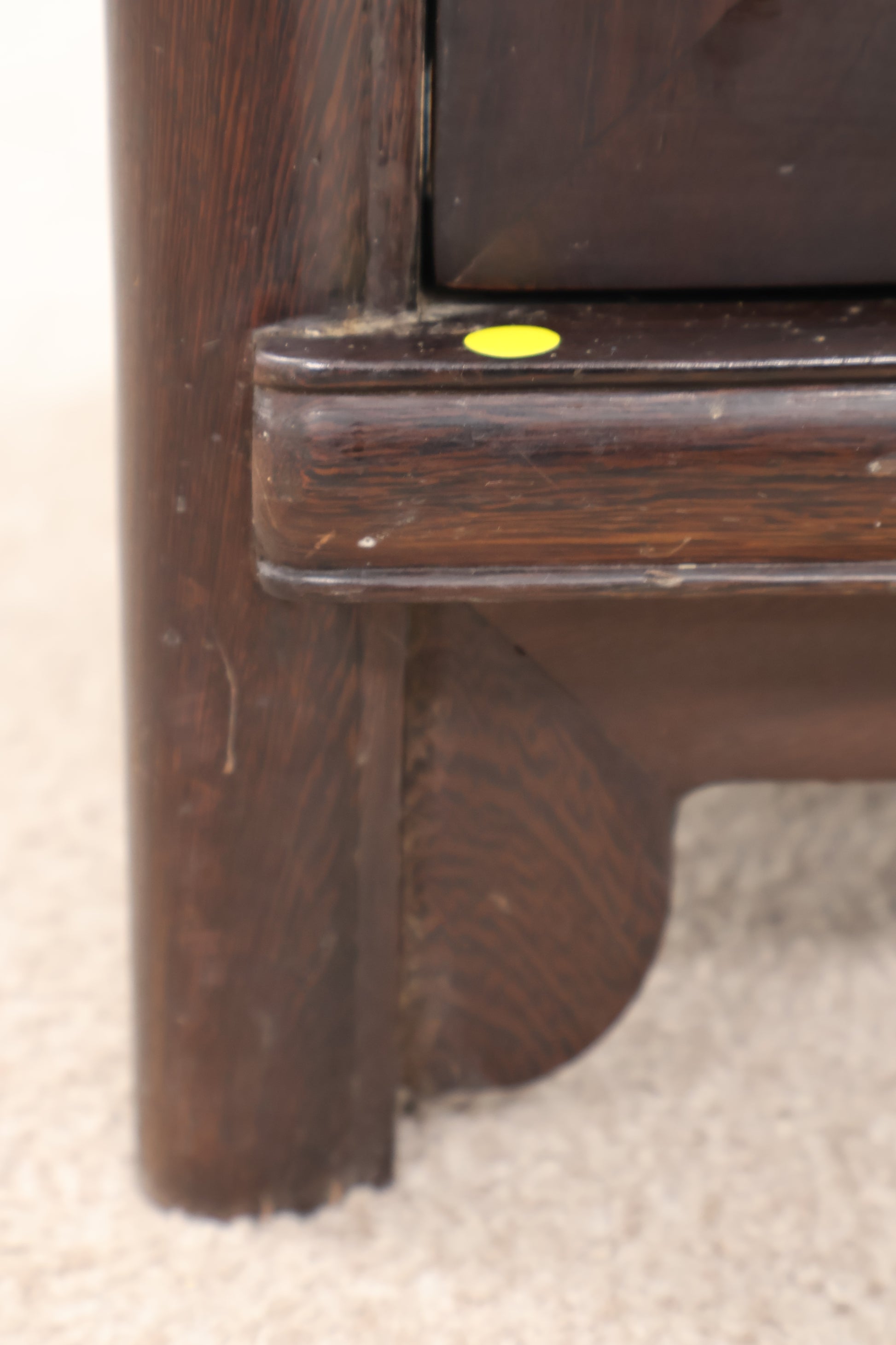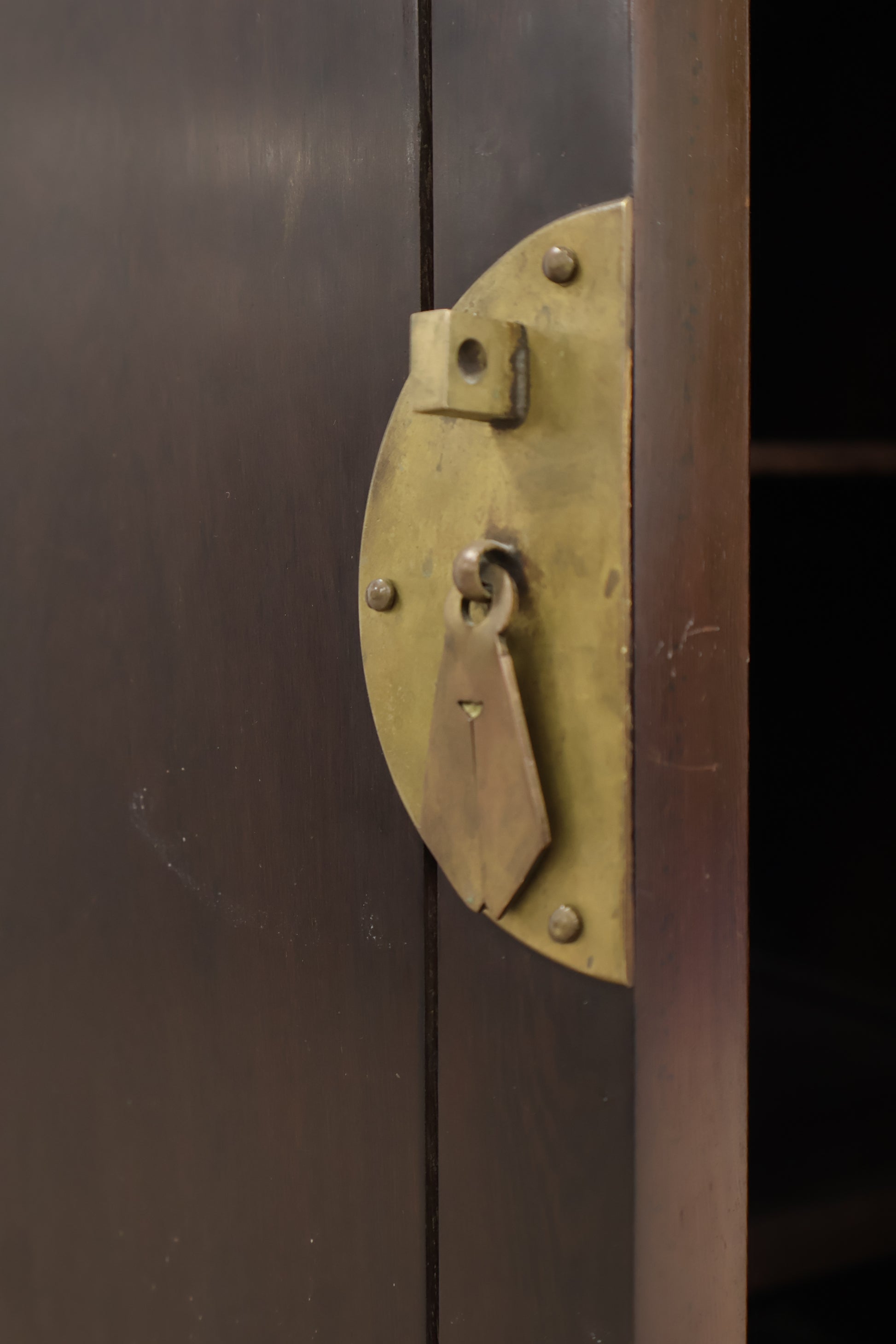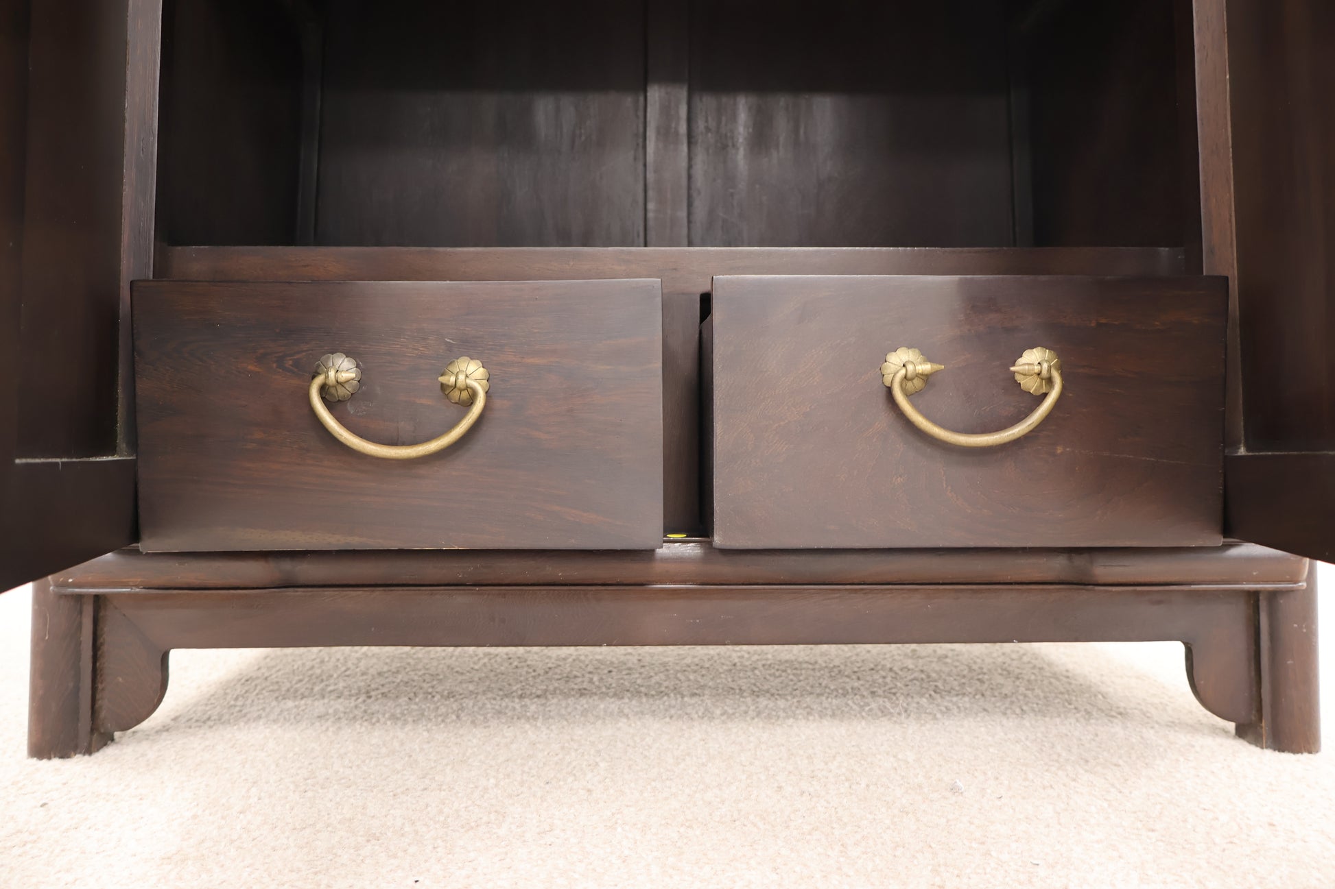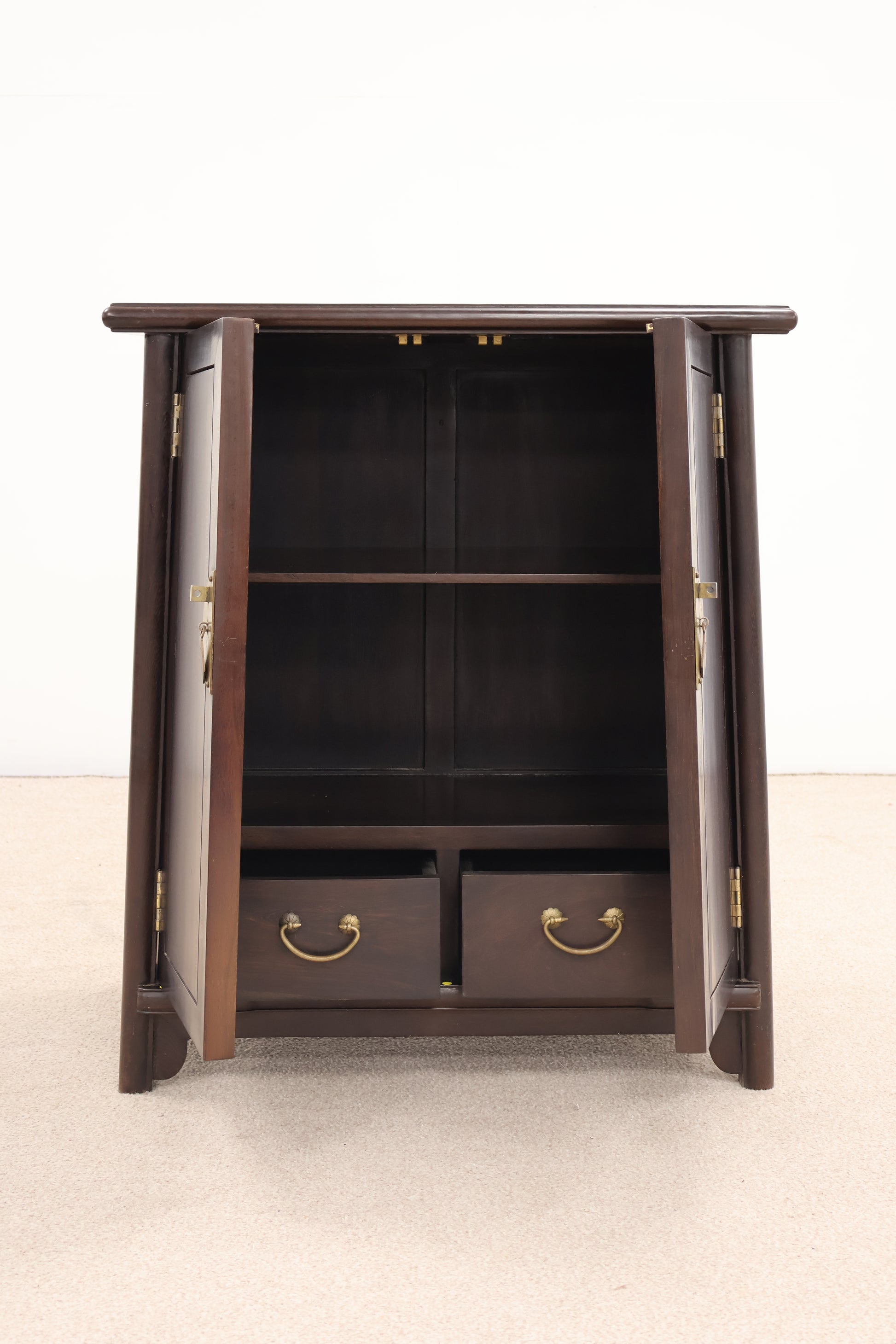 This dark teakwood cabinet offers a distinctive blend of style and practicality. Featuring internal drawers and shelving, it provides versatile storage options while showcasing a unique design. A standout piece that can enhance any room with both function and character.