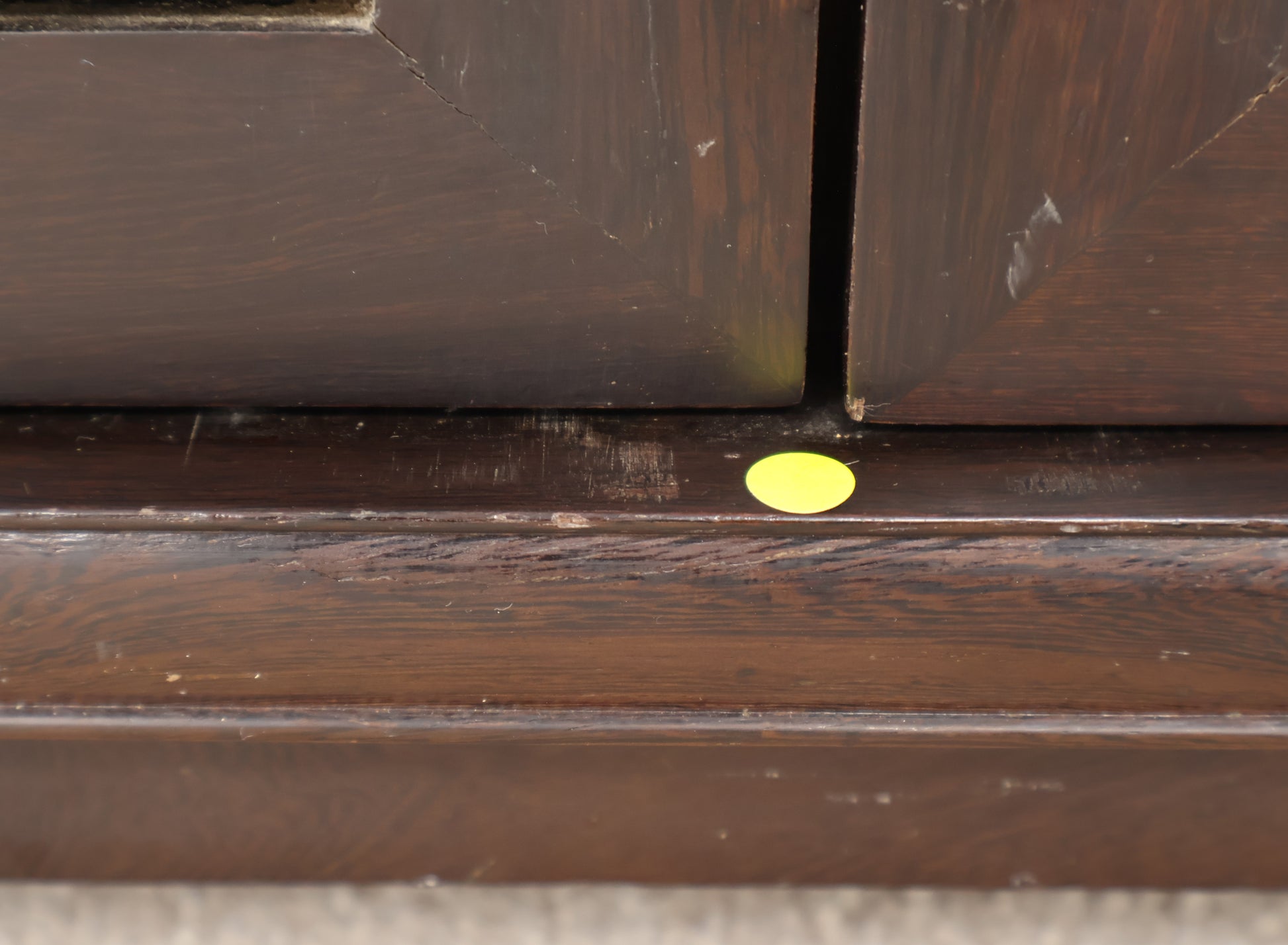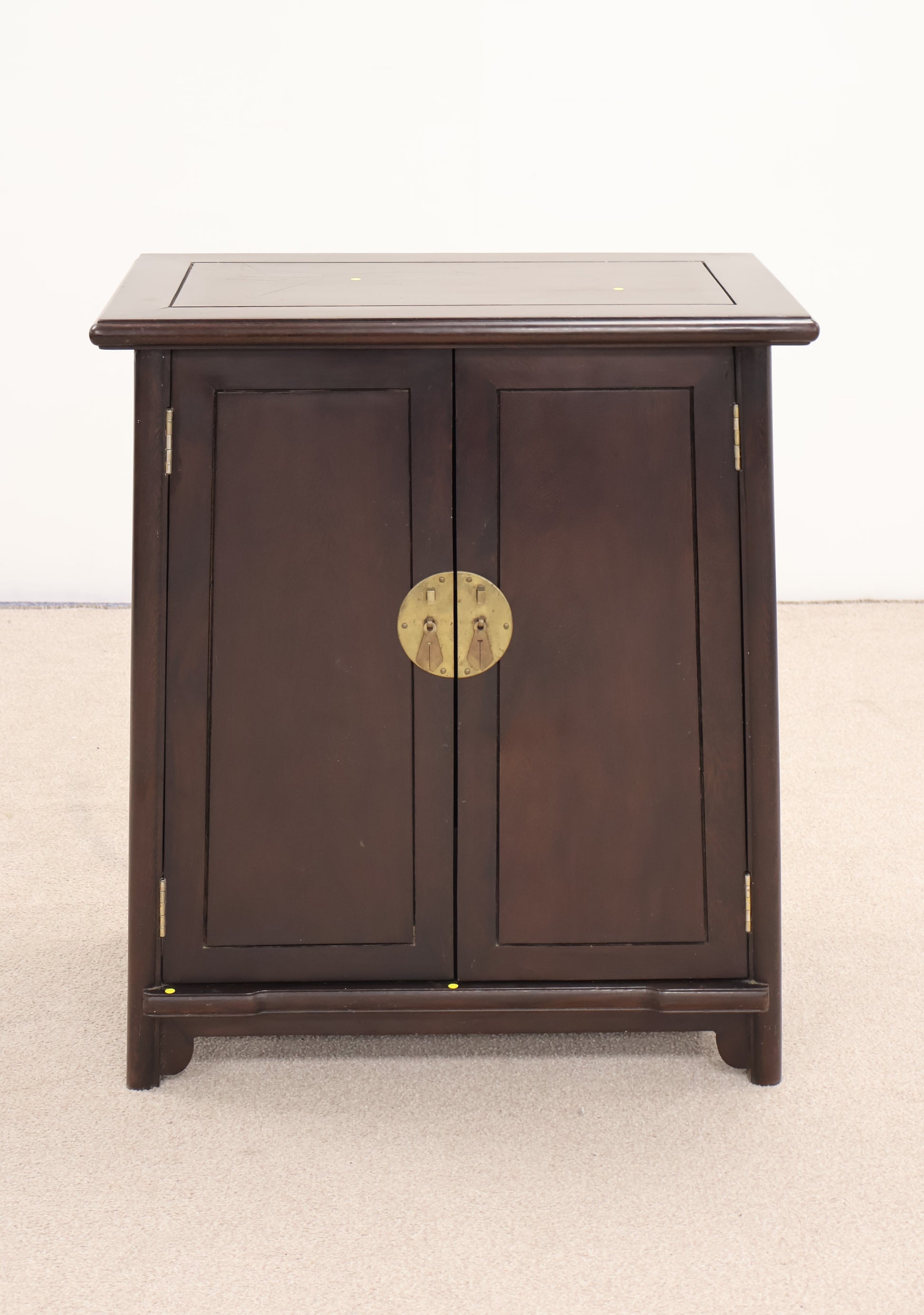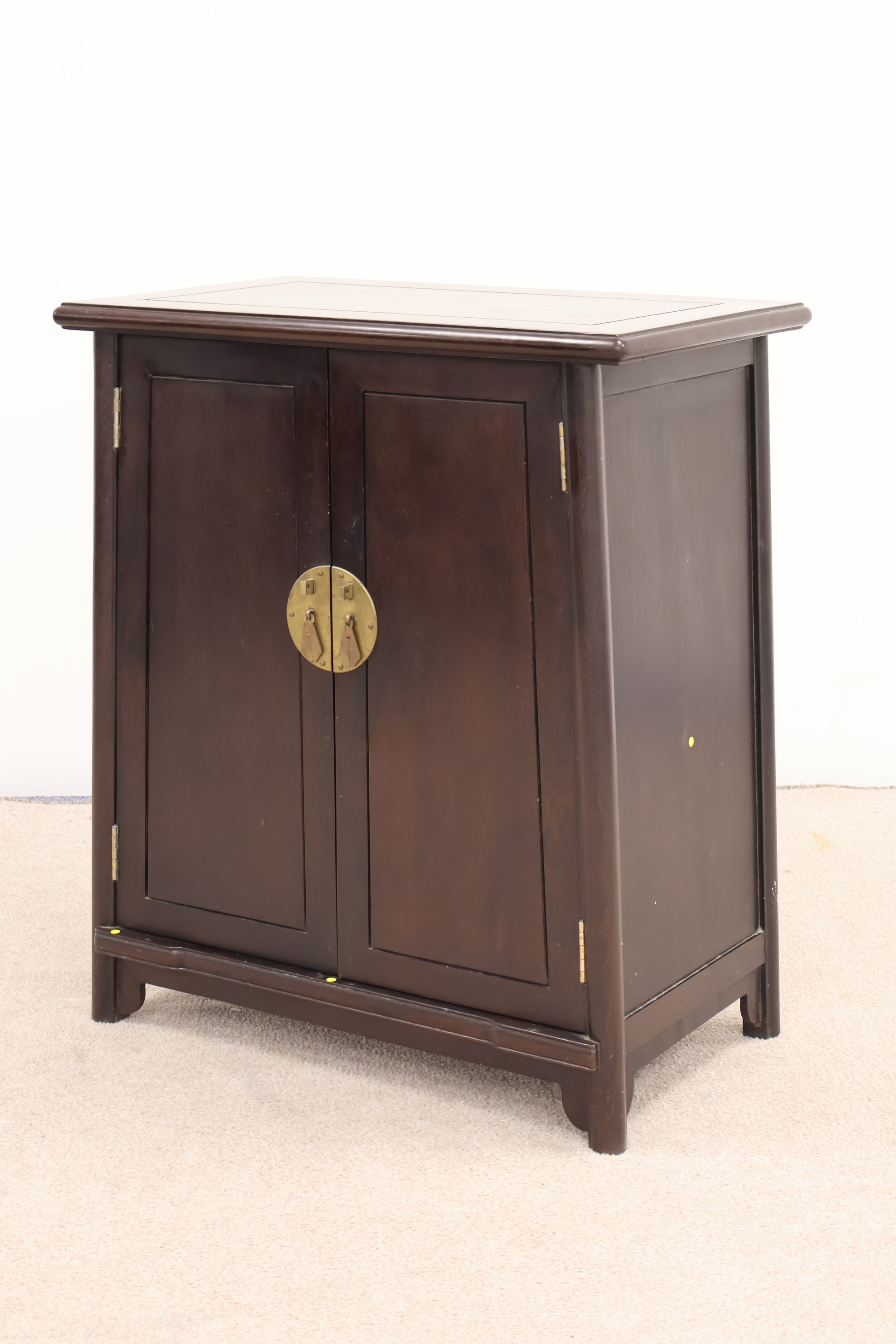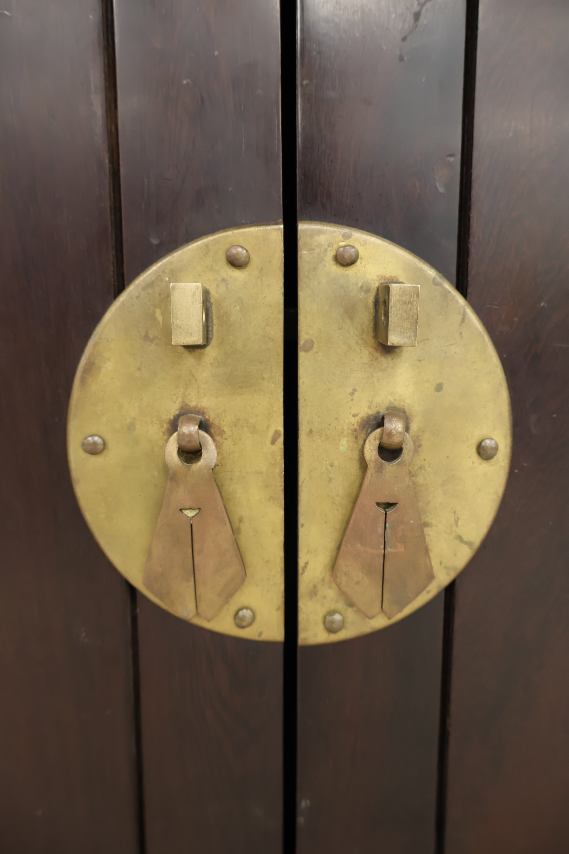 This dark teakwood cabinet offers a distinctive blend of style and practicality. Featuring internal drawers and shelving, it provides versatile storage options while showcasing a unique design. A standout piece that can enhance any room with both function and character.