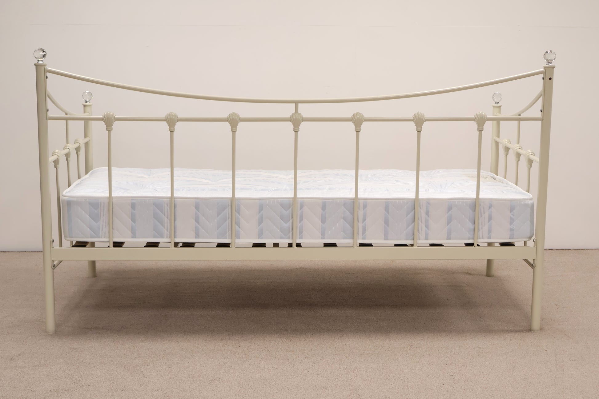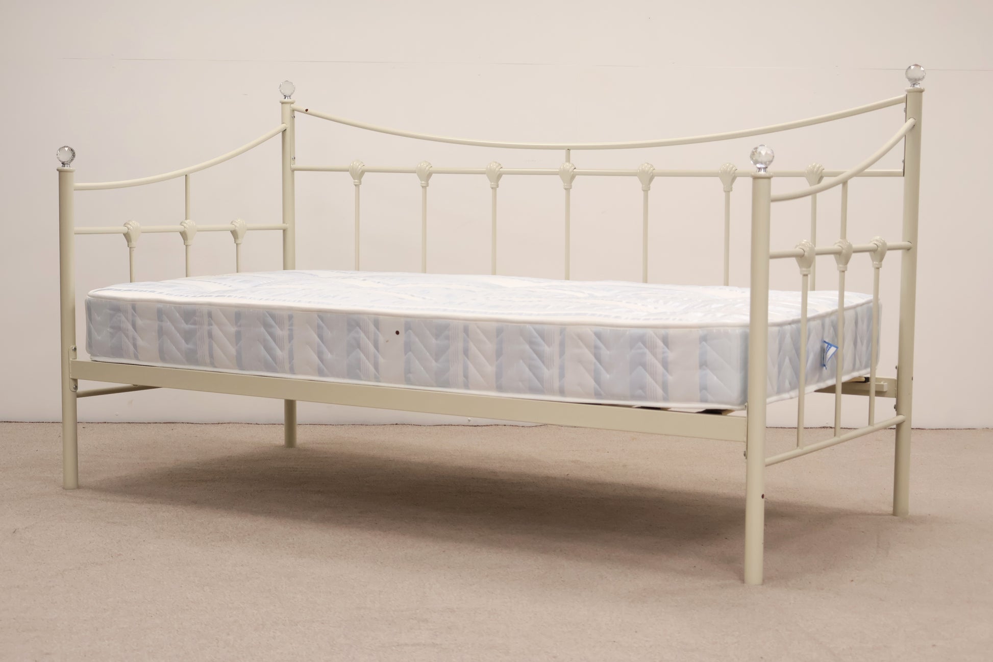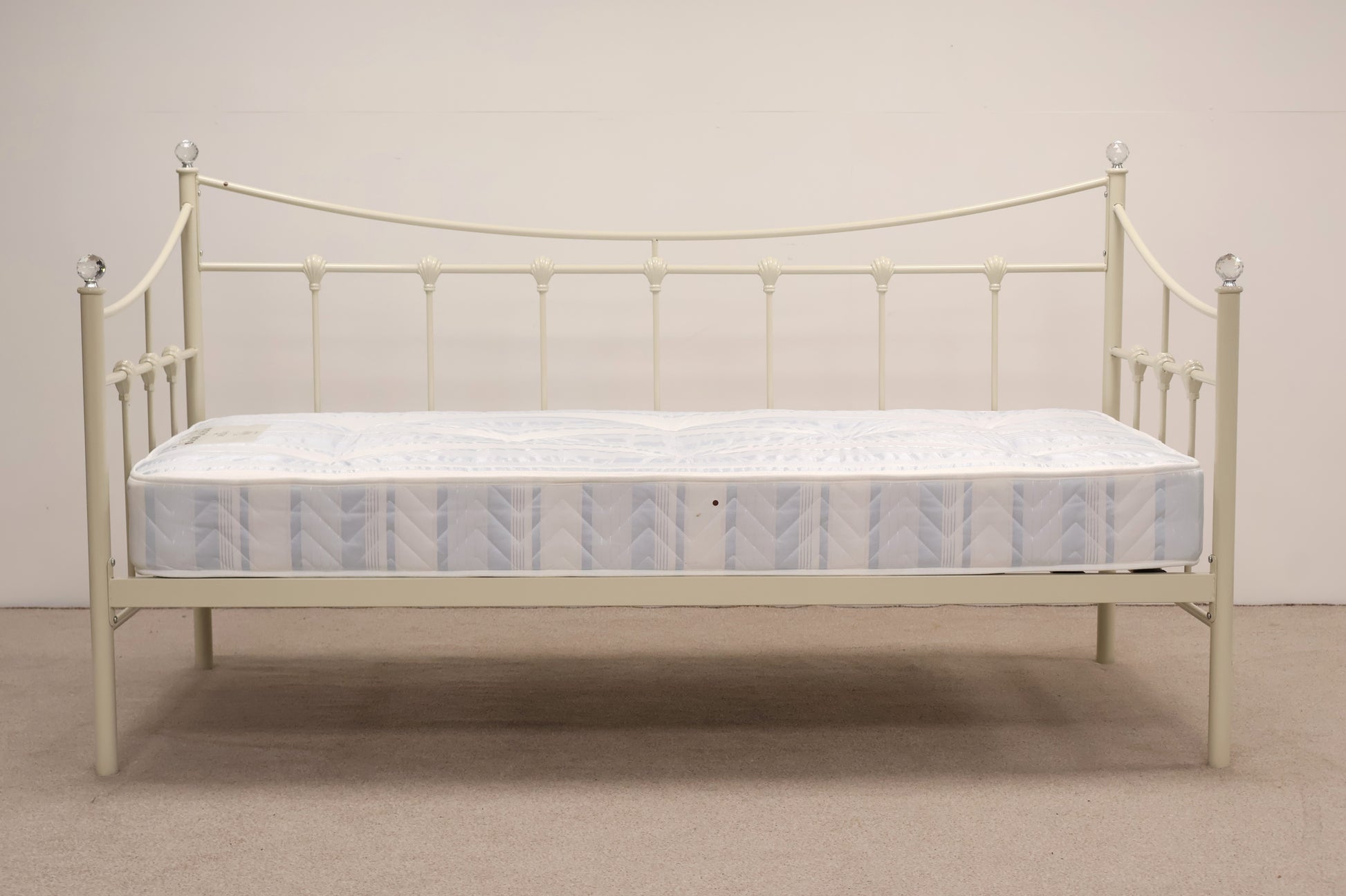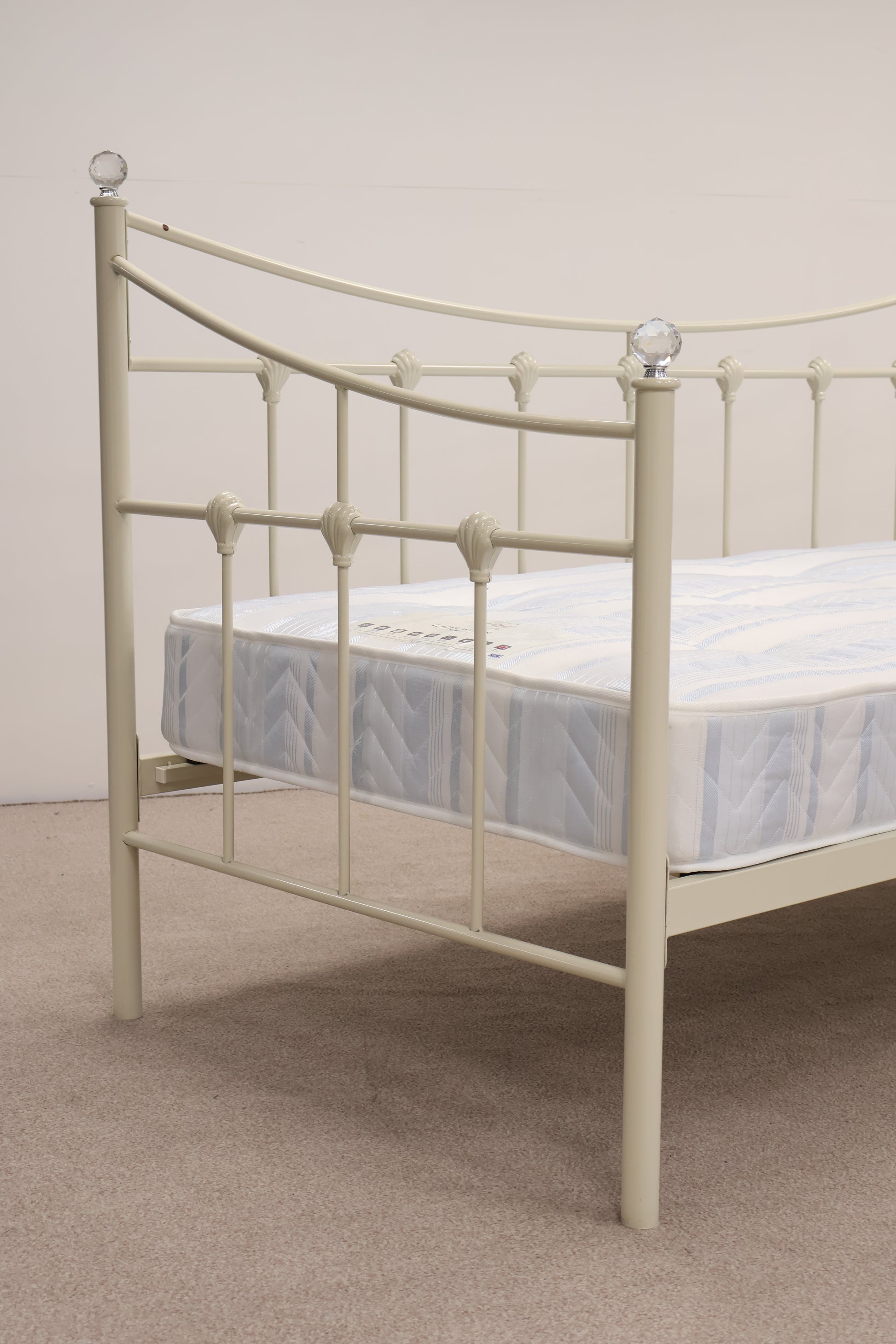 Delightful day bed made from metal with ornate detailing and faux crystal tops. This comes with a mattress, ready for use.