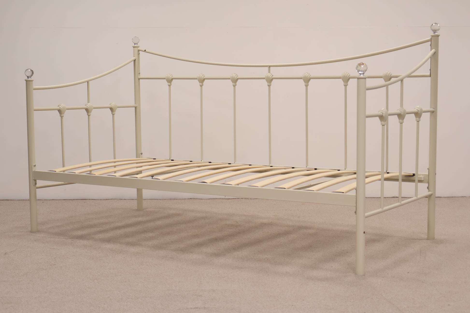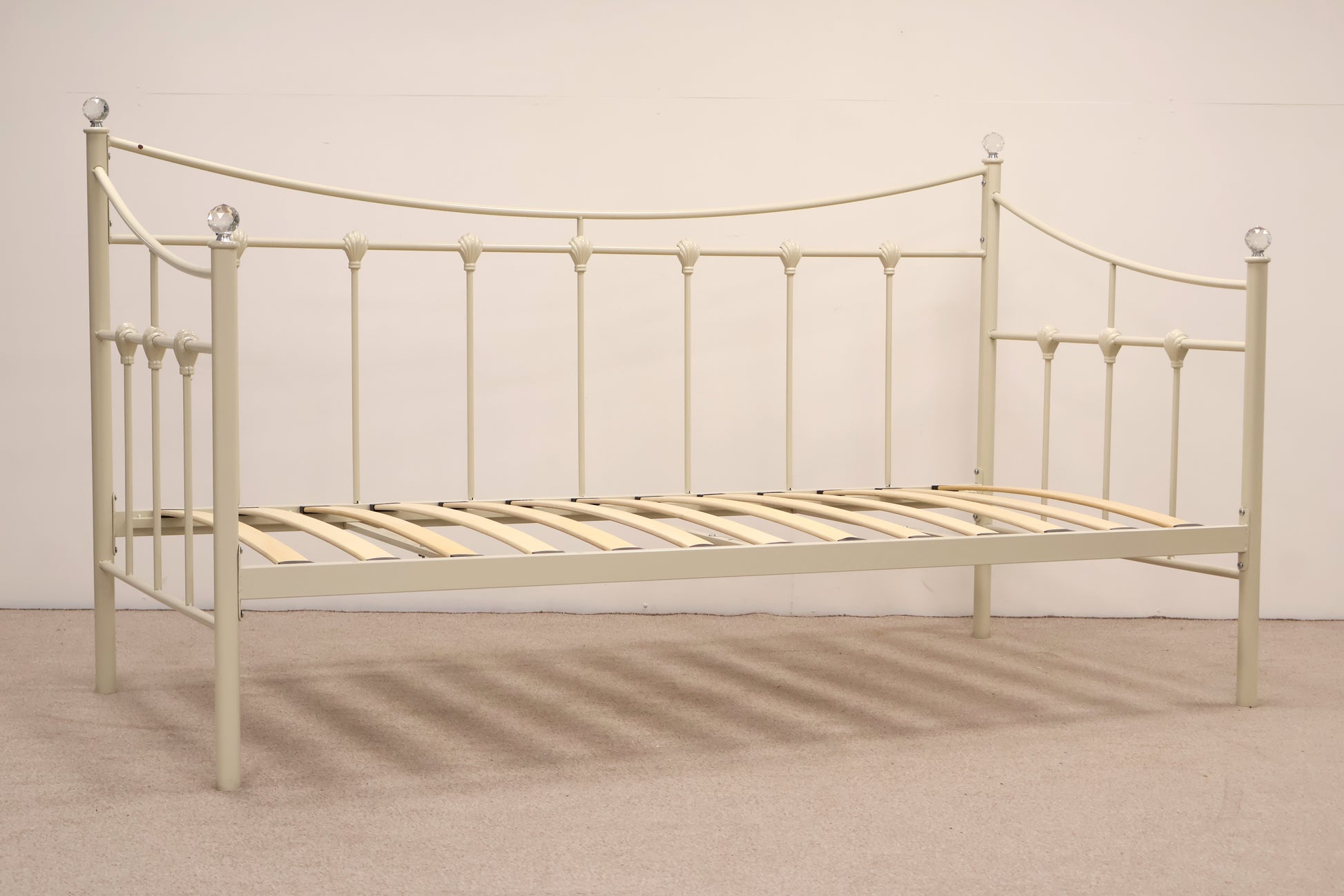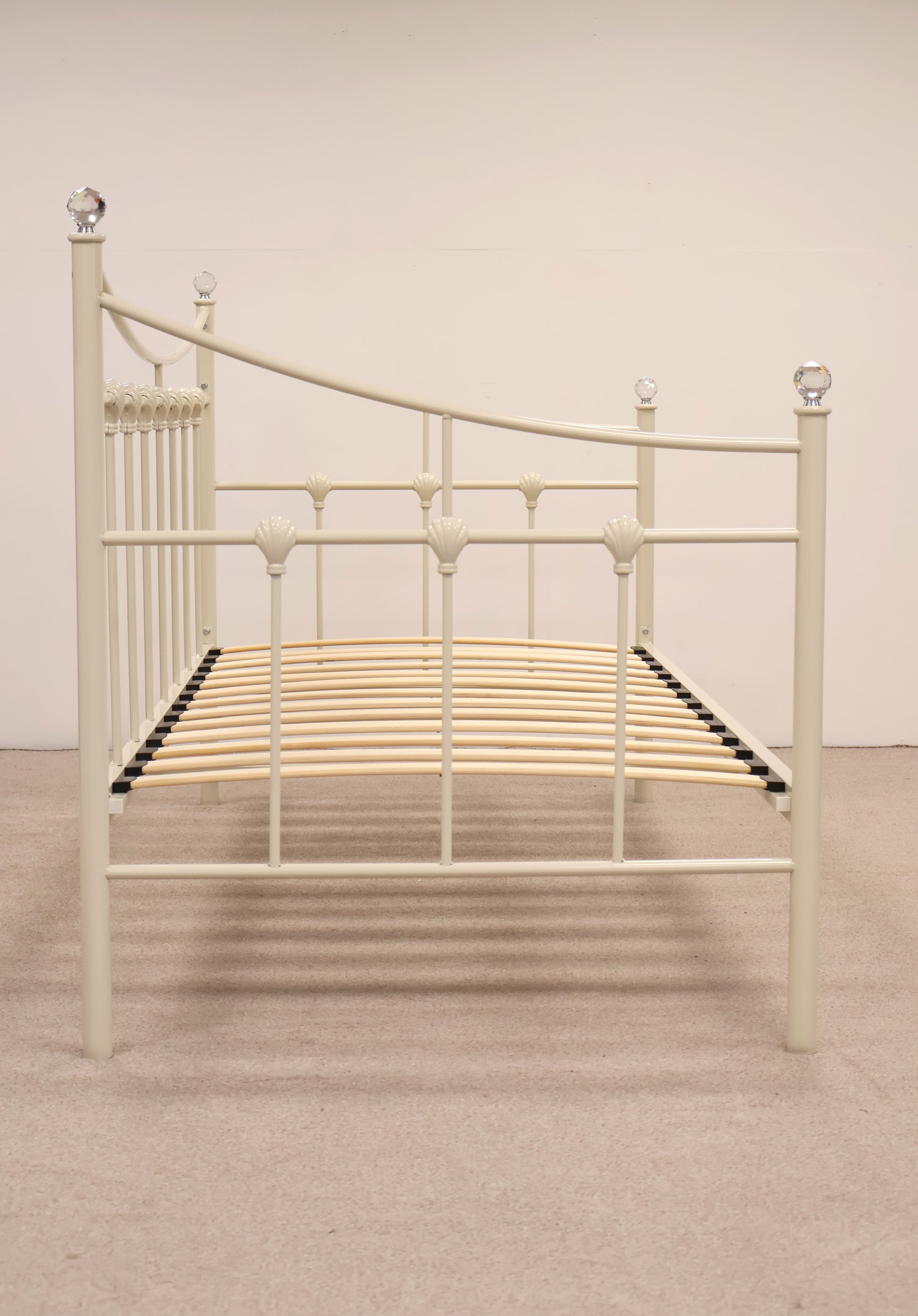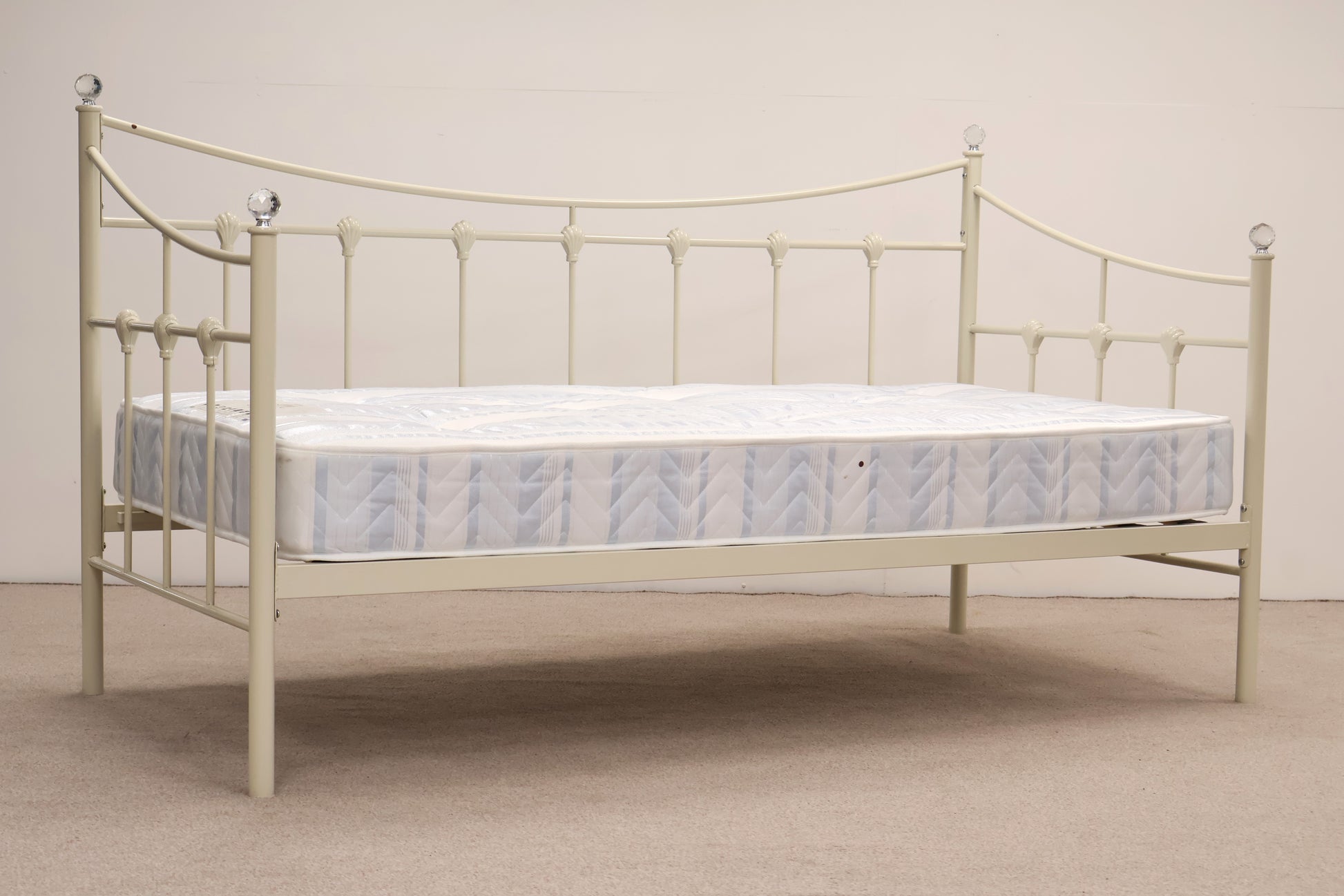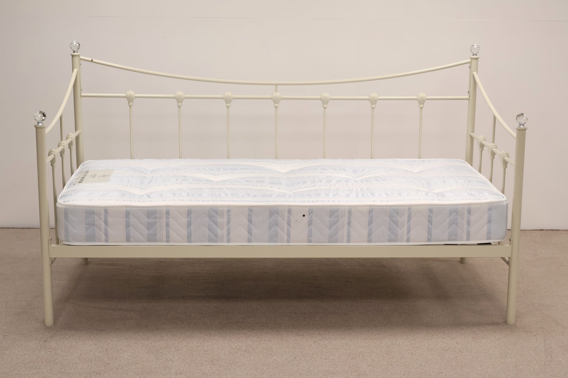 Delightful day bed made from metal with ornate detailing and faux crystal tops. This comes with a mattress, ready for use.