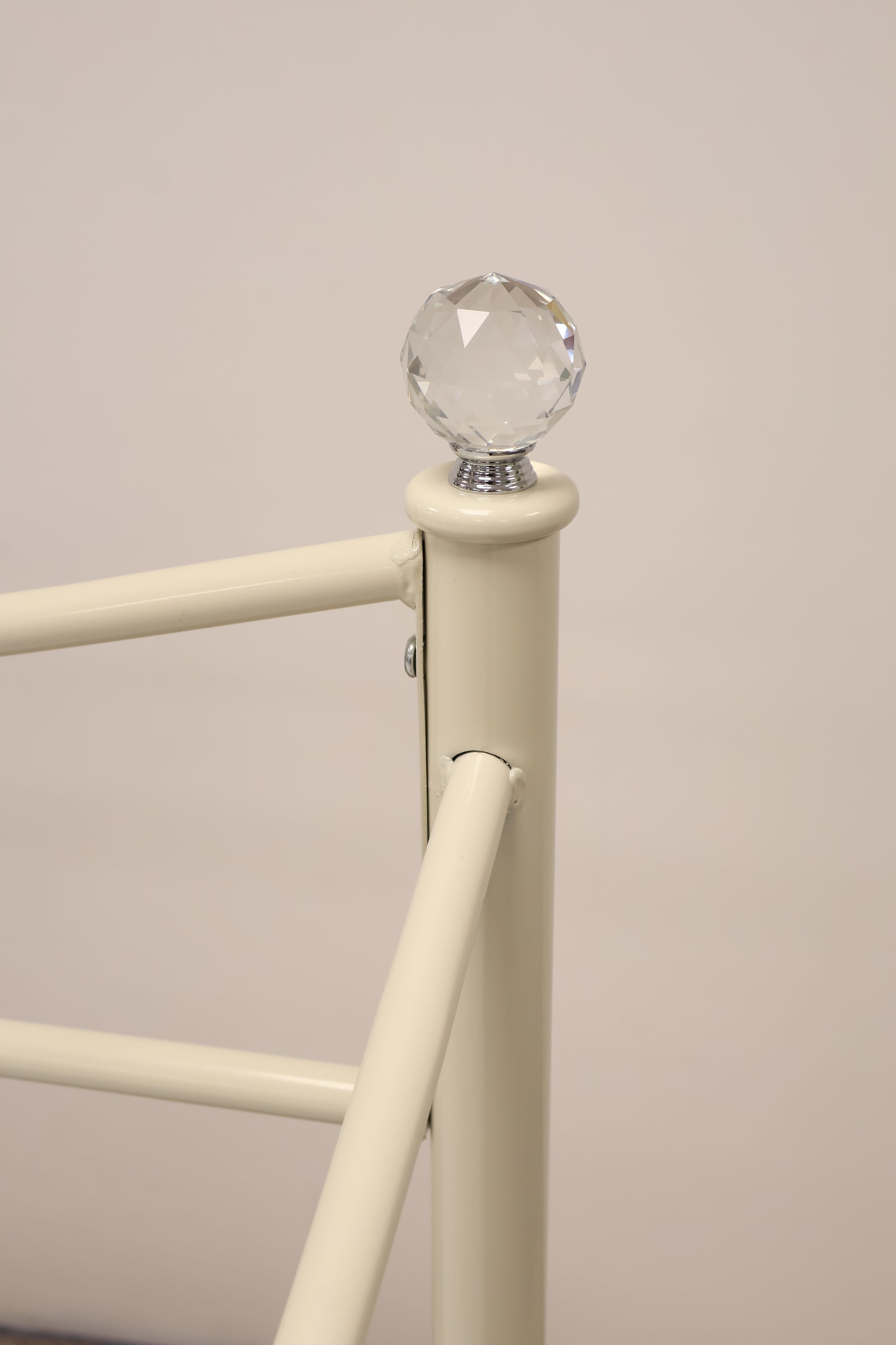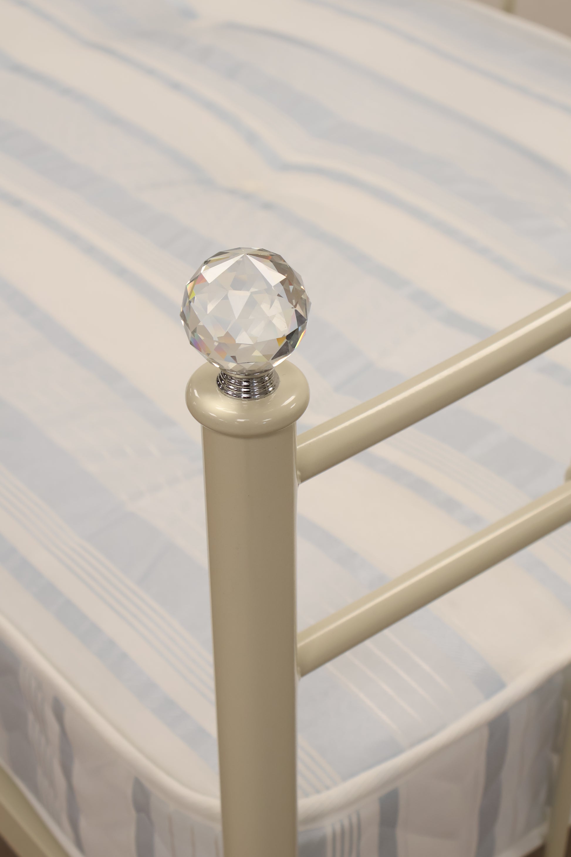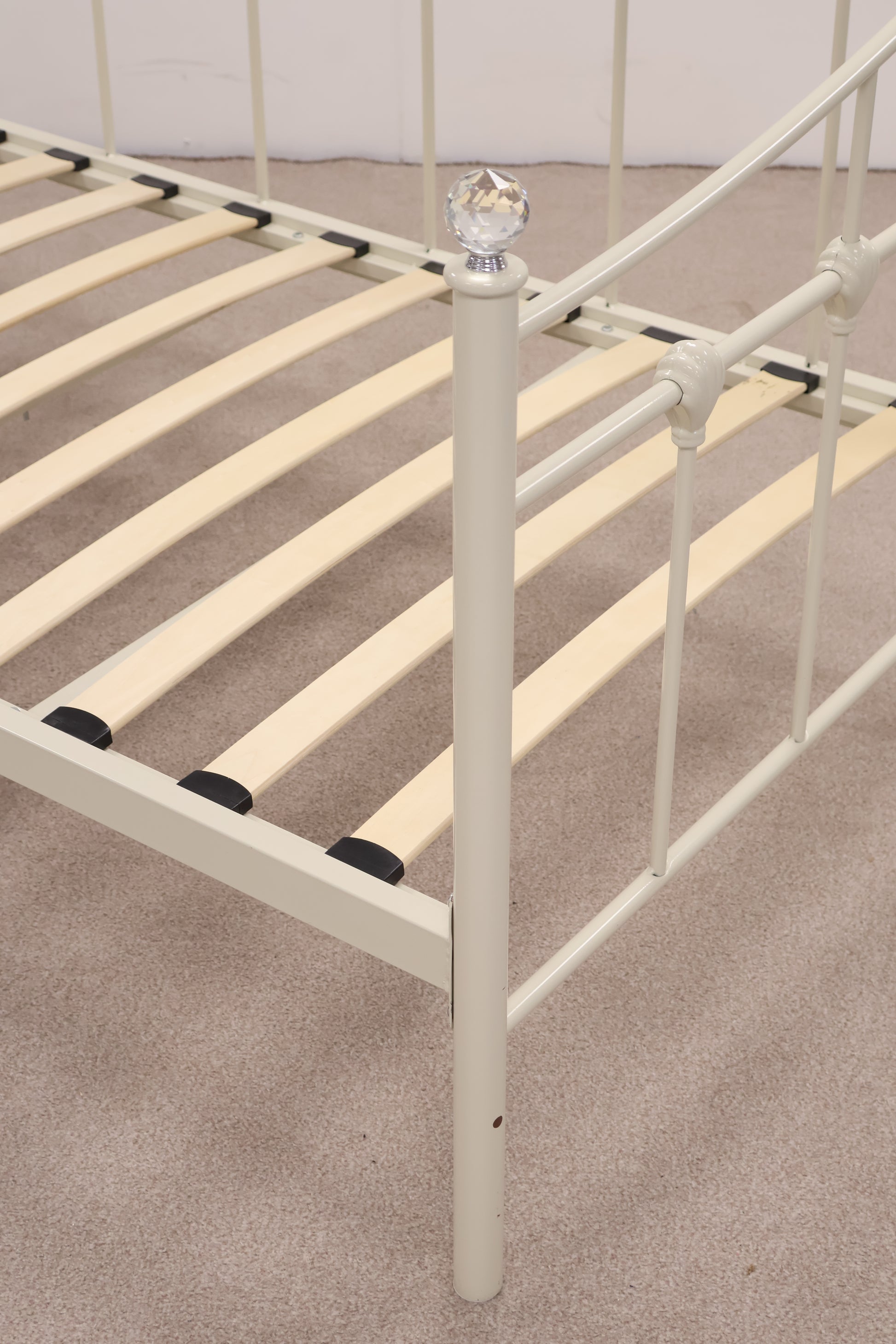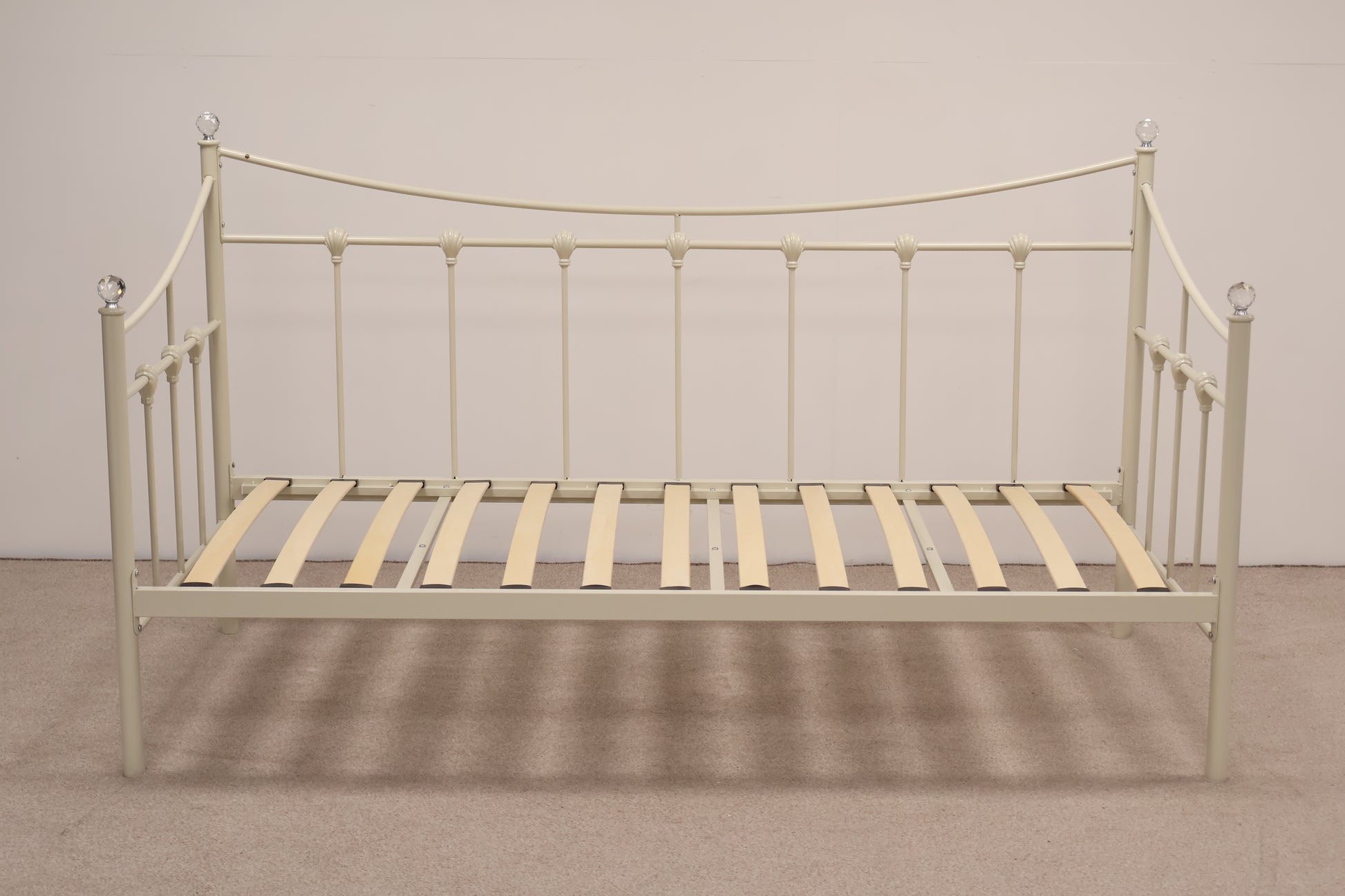 Delightful day bed made from metal with ornate detailing and faux crystal tops. This comes with a mattress, ready for use.