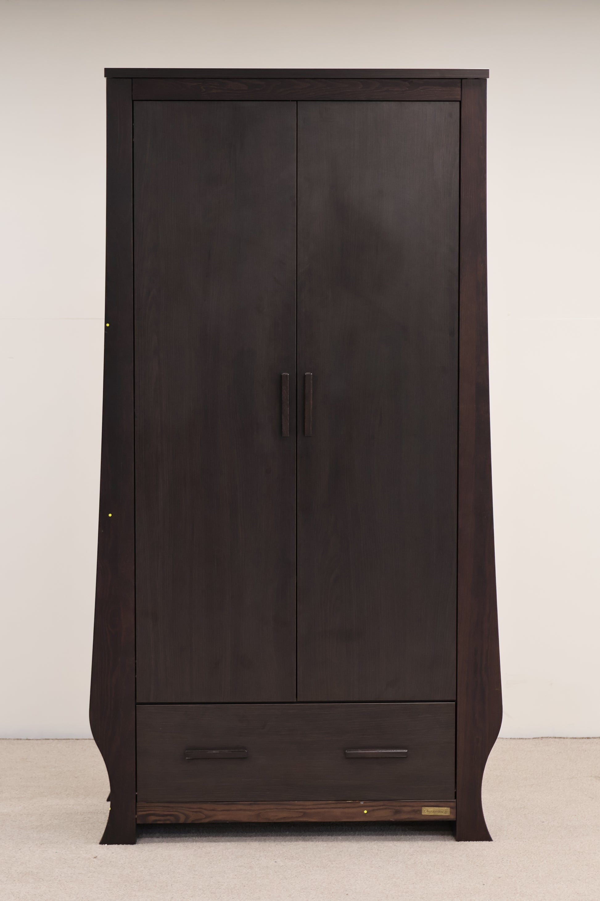 This double wardrobe by Charnwood features a classic curved design and rich walnut veneer finish. Originally intended as a nursery piece, it includes a single drawer at the bottom for extra storage, making it versatile enough for any bedroom setting.