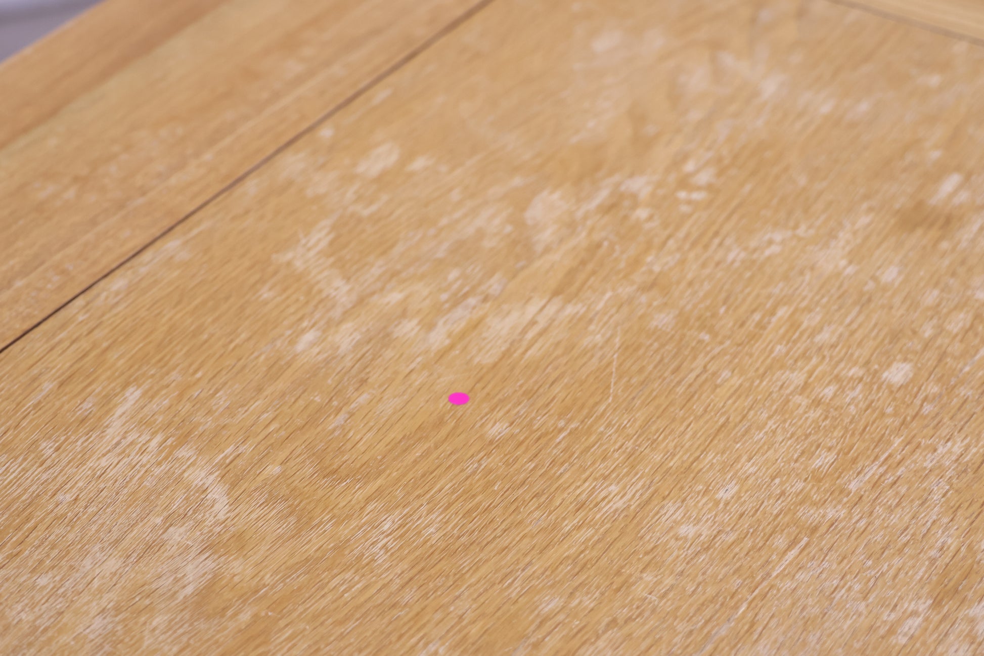 Wear and Tear: scratch marks all around the top of the table and with some discolouration. The table would benefit from some surface sanding. All blemishing reflected in the price.
