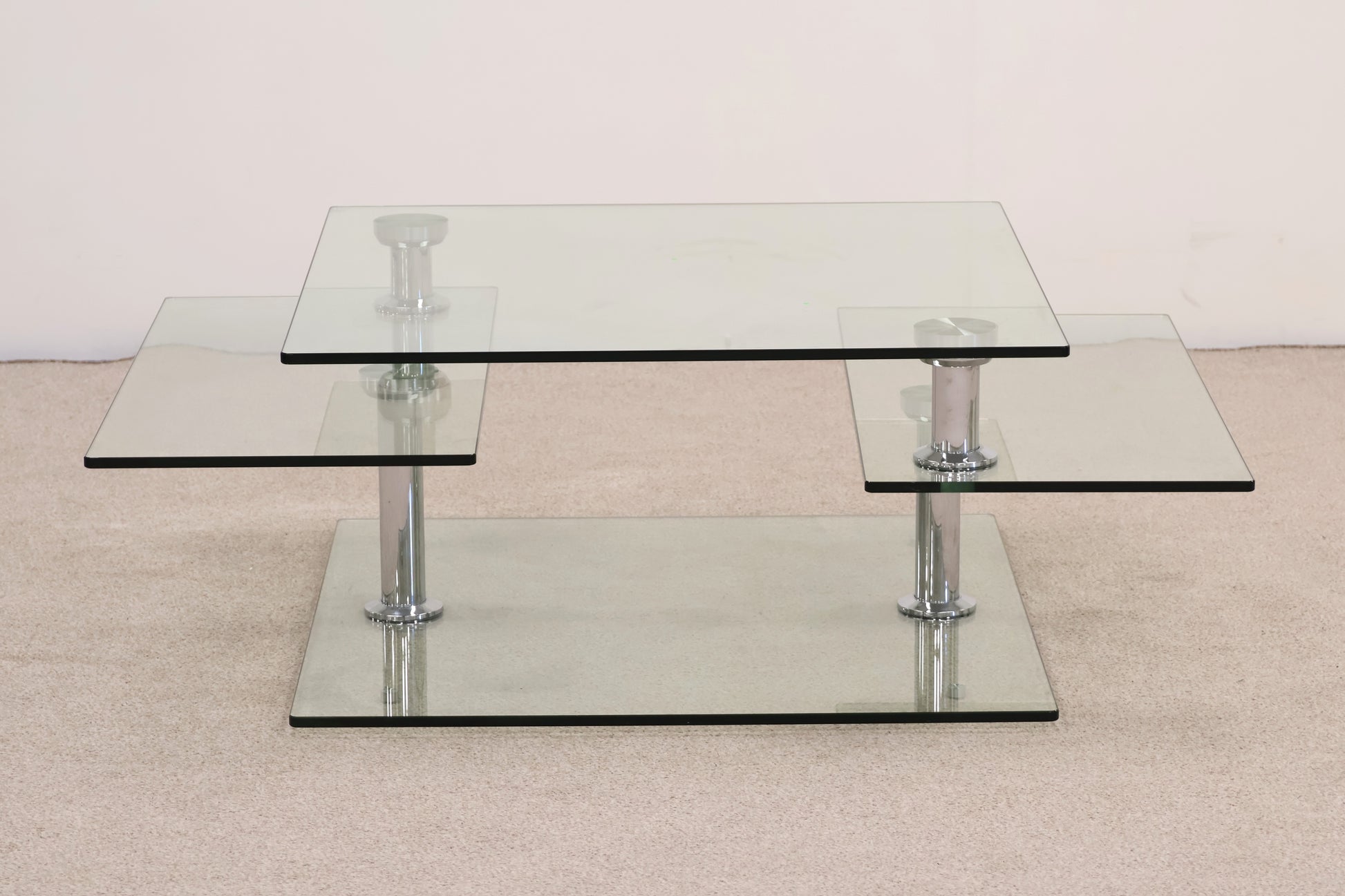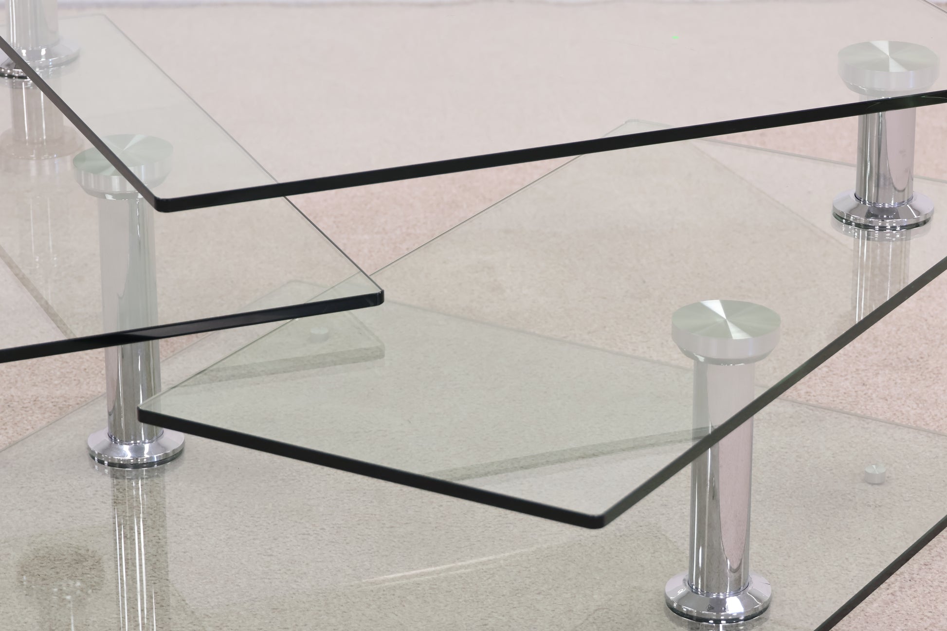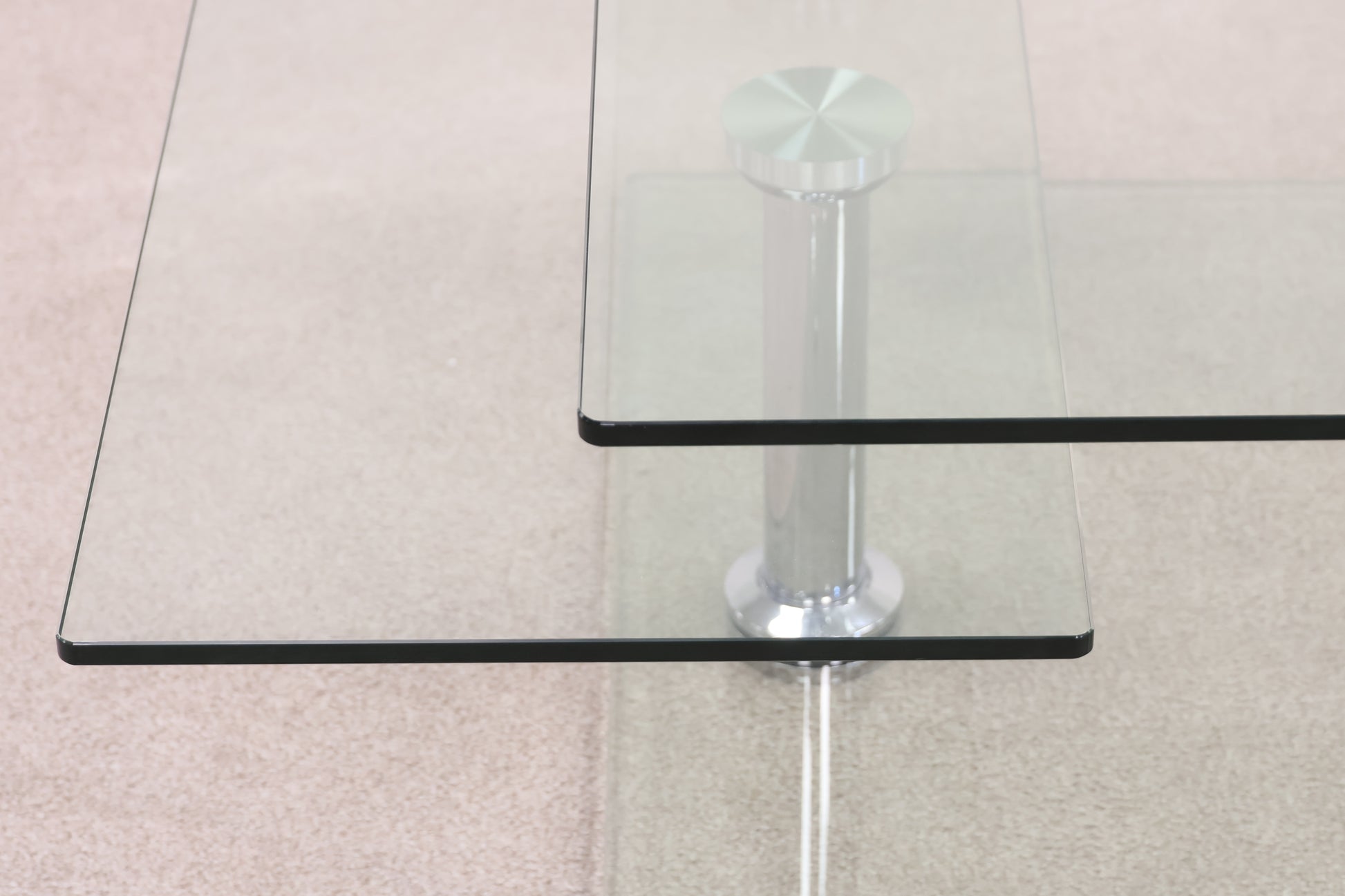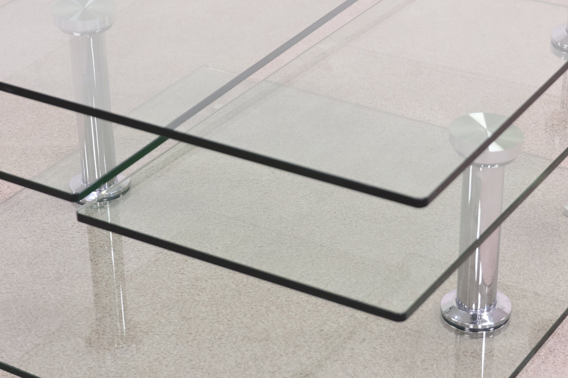 This glass coffee table extends up to 120cm with movable parts, providing adaptable space for your needs. It shows minor scratch marks as pictured but no other visible wear or tear.