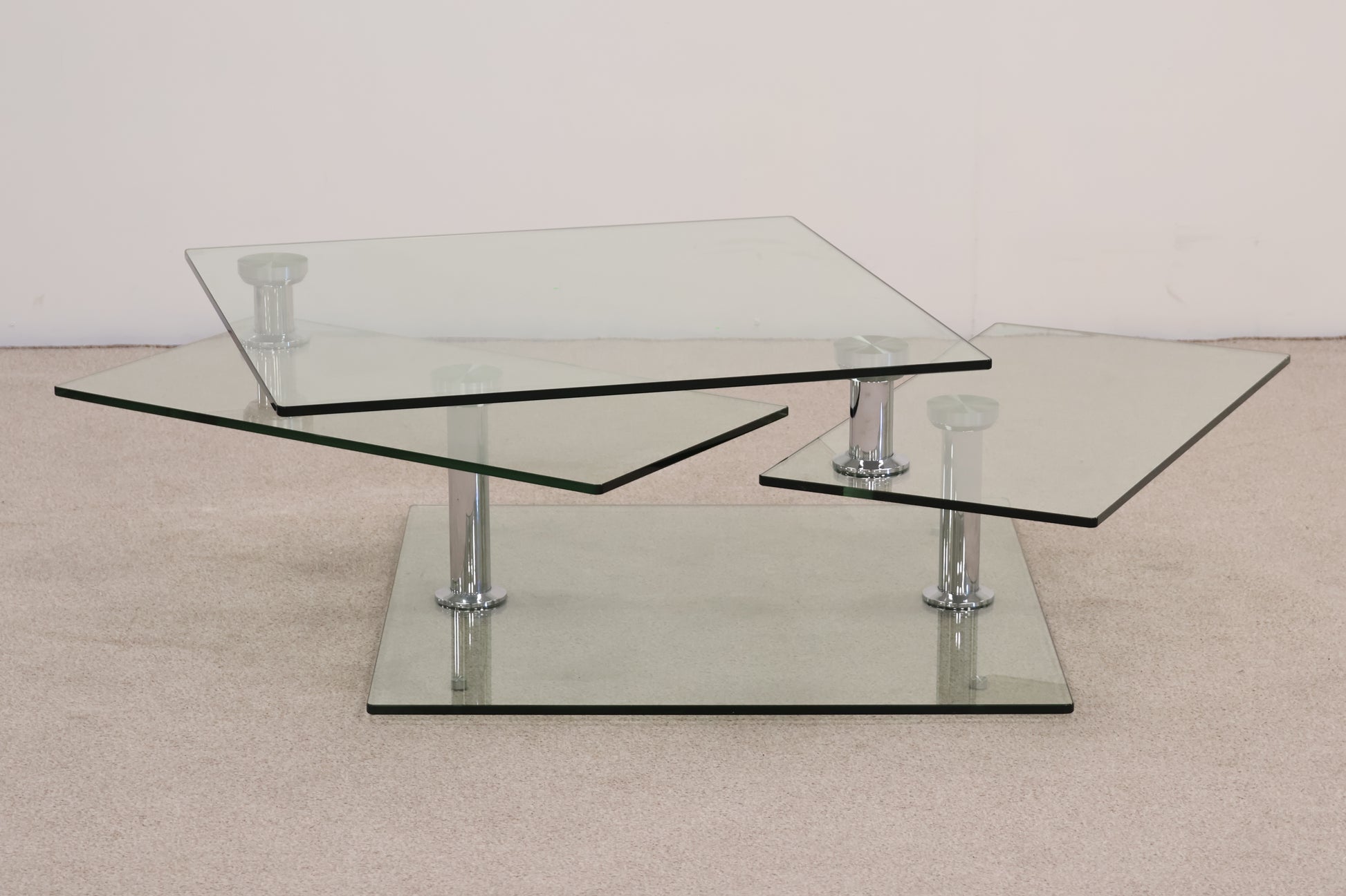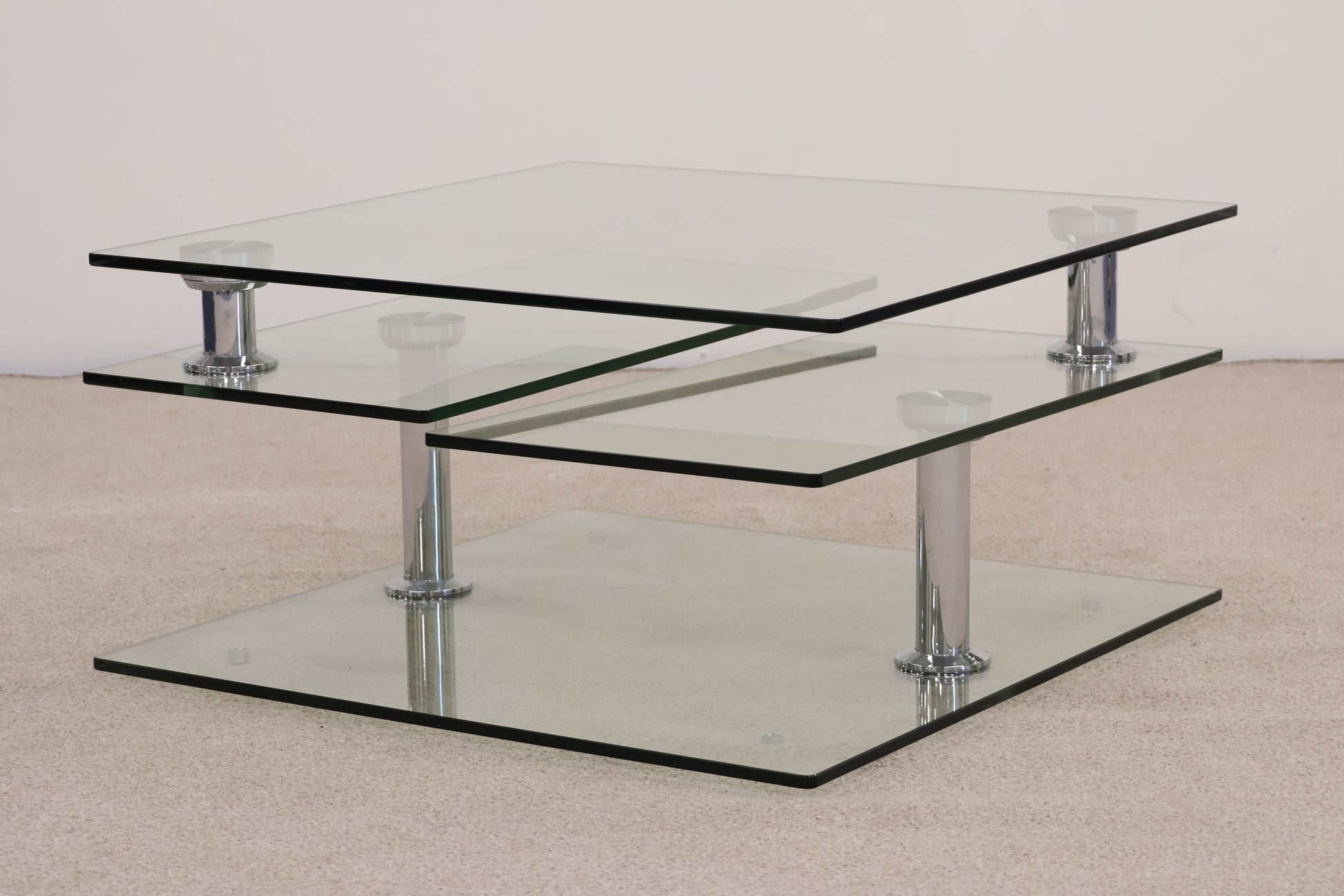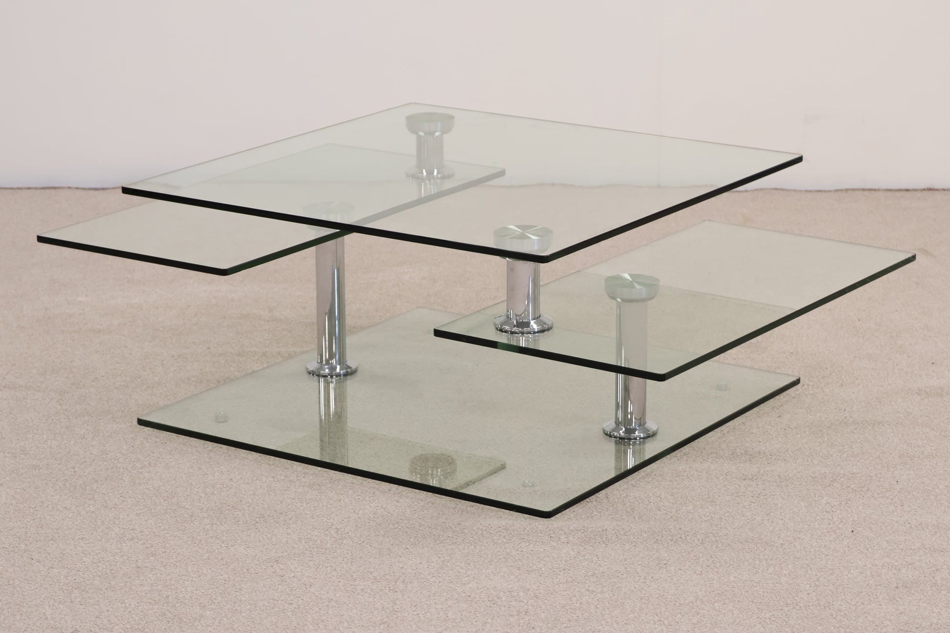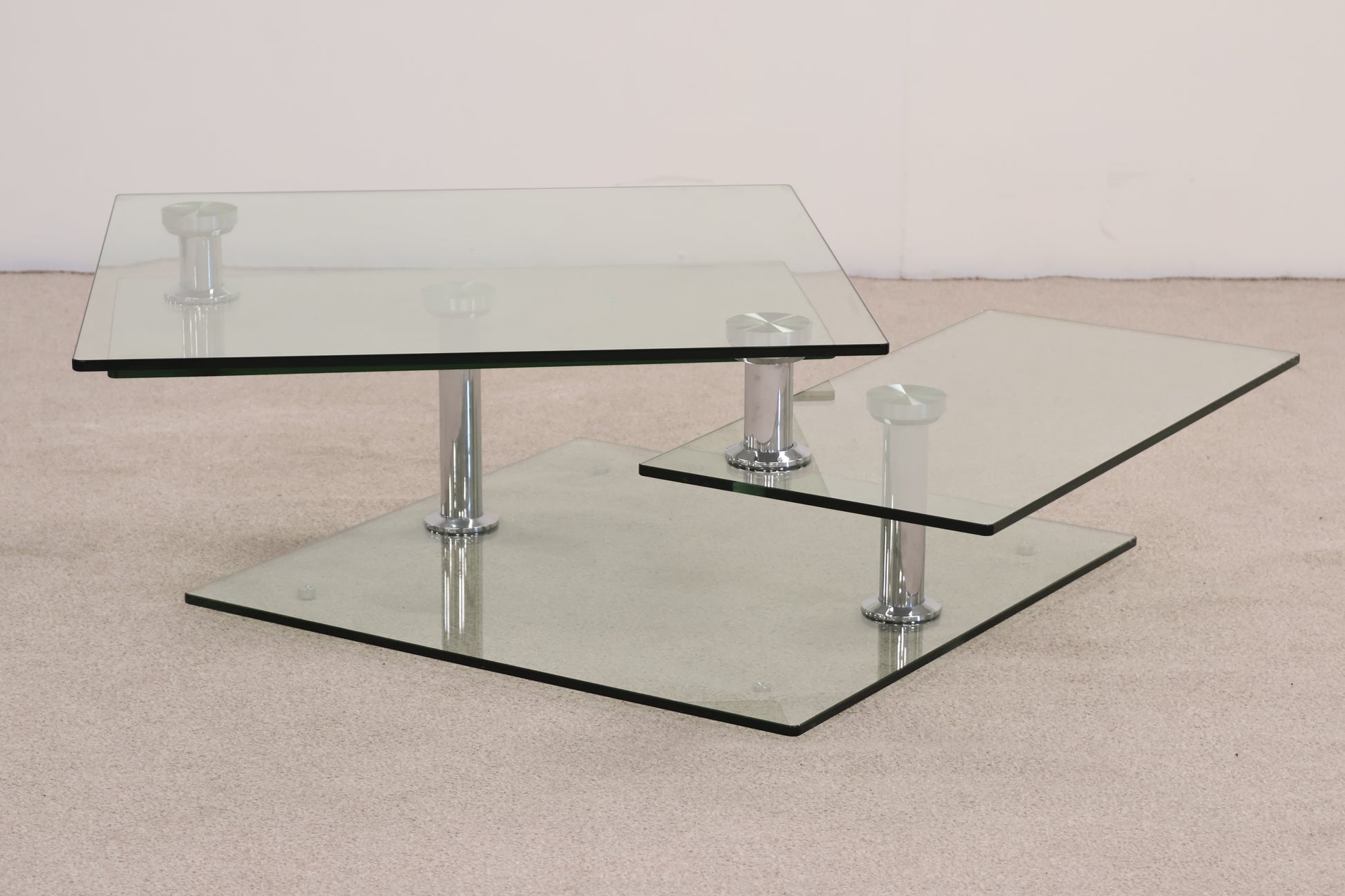 This glass coffee table extends up to 120cm with movable parts, providing adaptable space for your needs. It shows minor scratch marks as pictured but no other visible wear or tear.