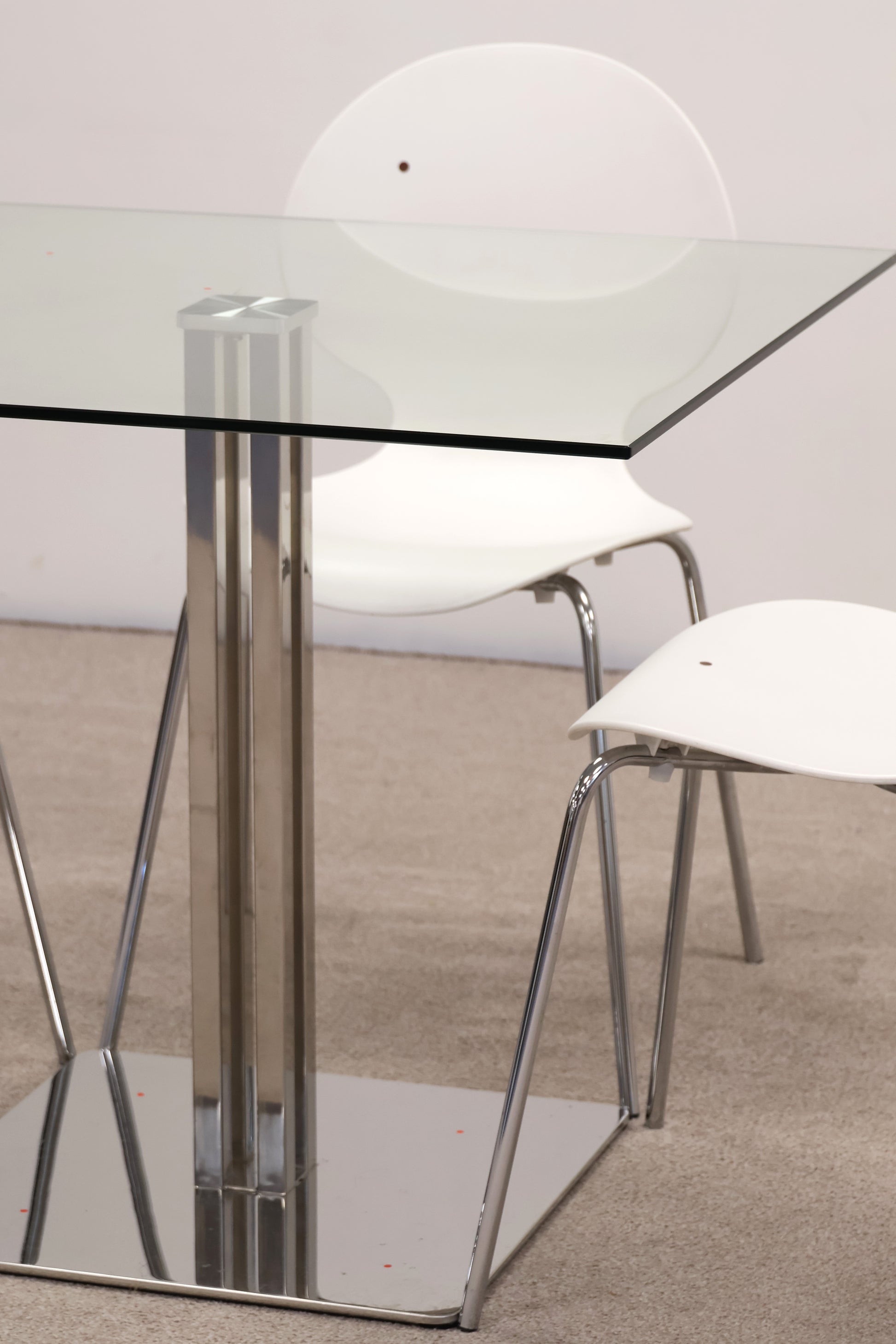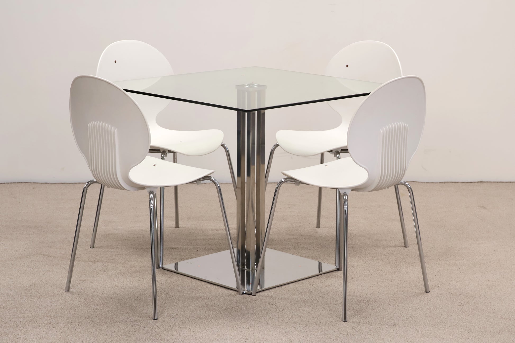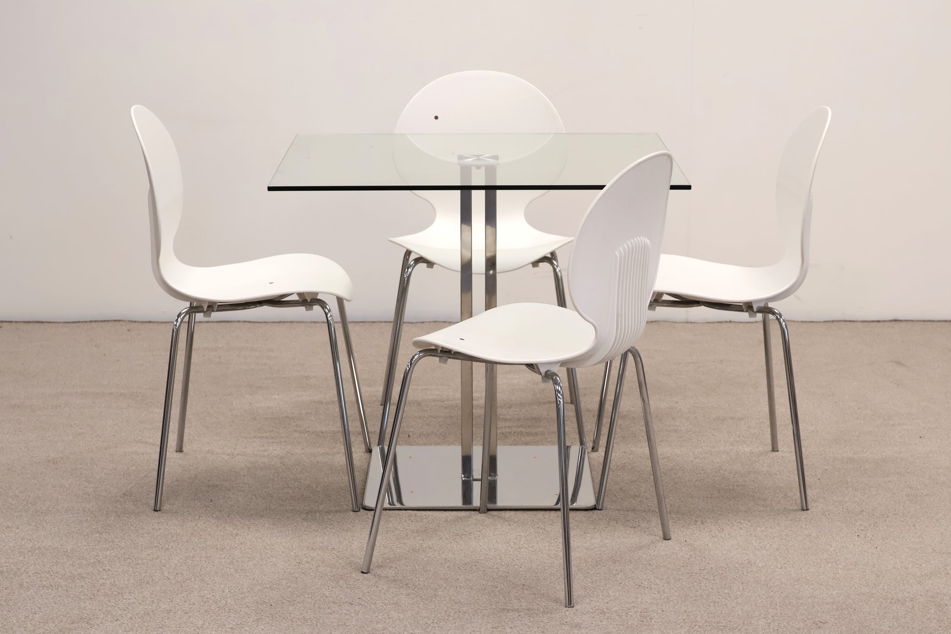 This glass dining table set includes four plastic chairs, offering a complete solution for your dining space. The table shows surface scratches reflecting regular use, while the chairs have some dark stains. Please note that some assembly is required upon delivery.