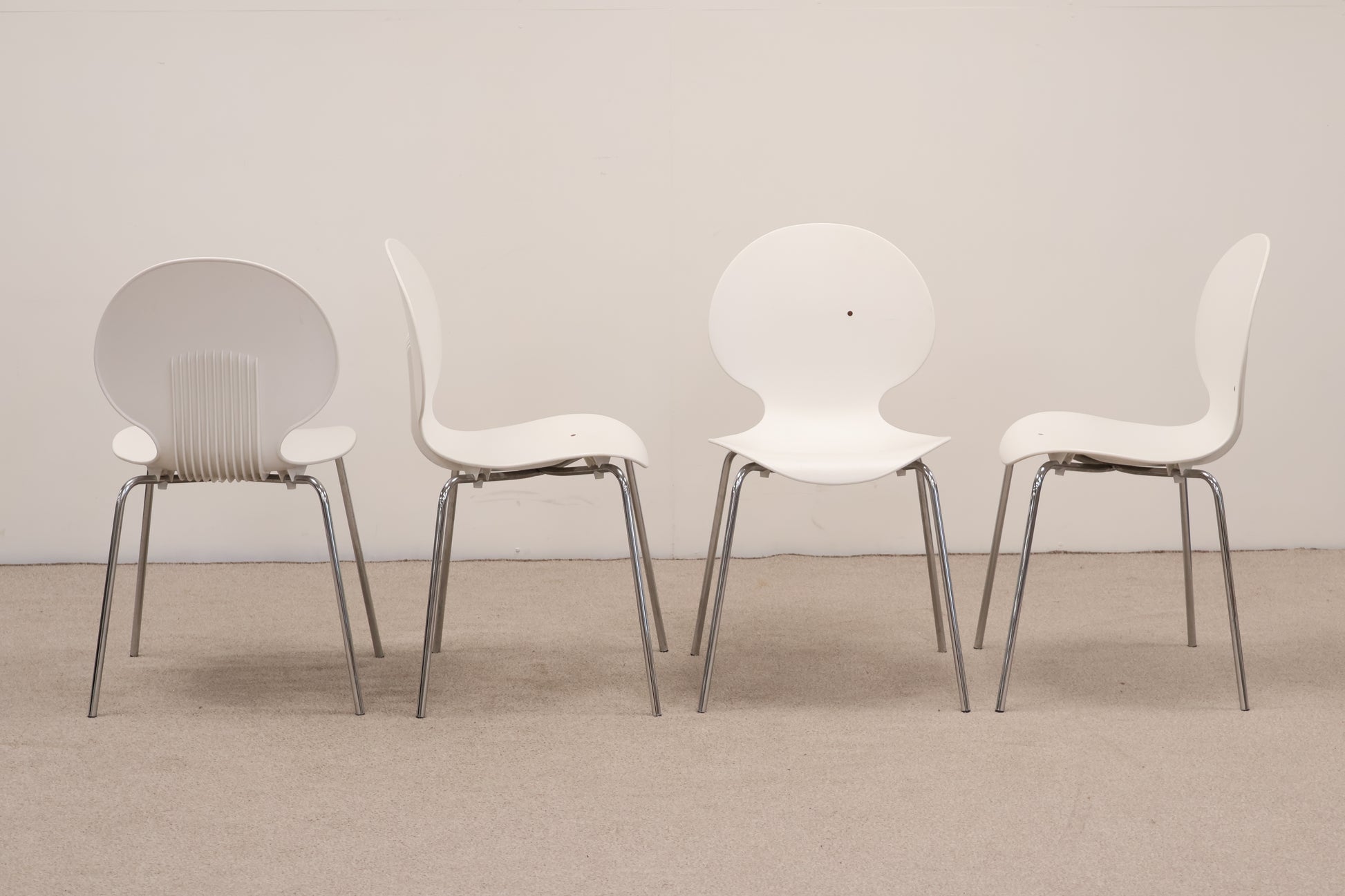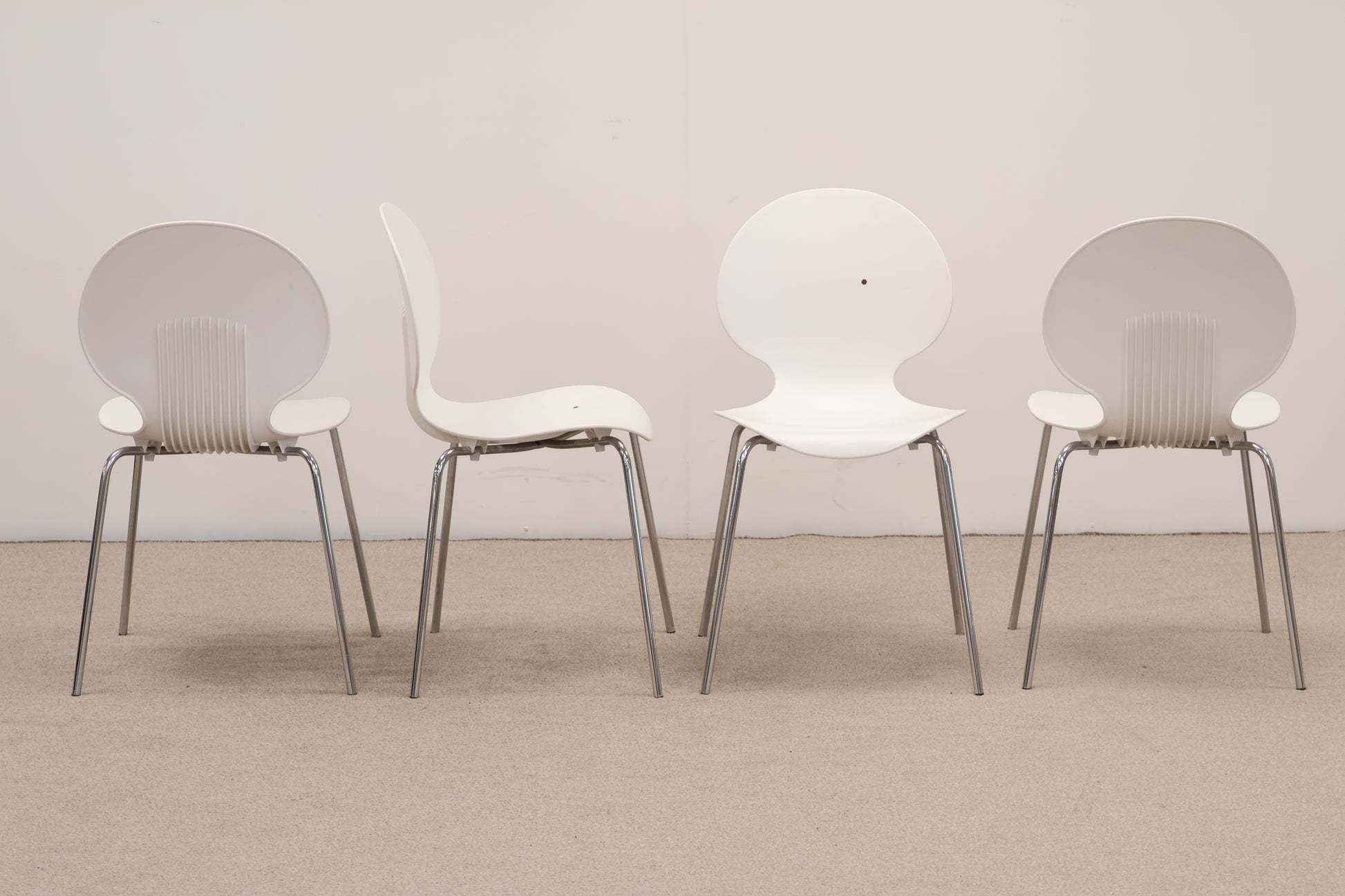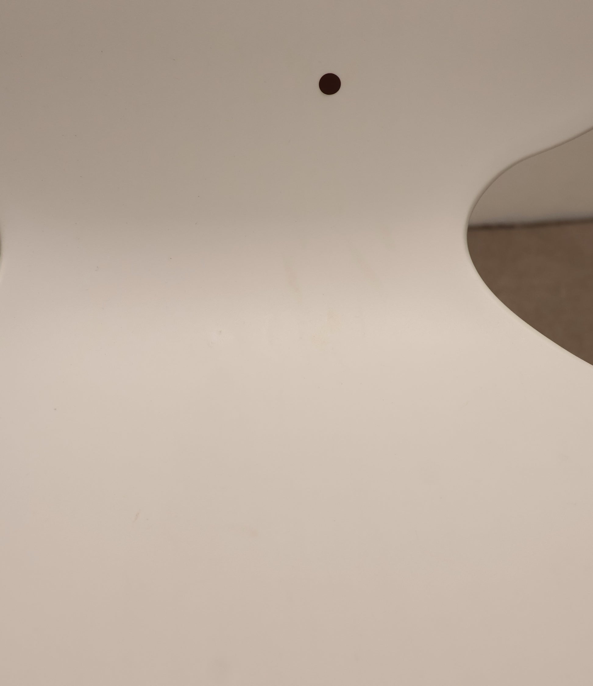 This glass dining table set includes four plastic chairs, offering a complete solution for your dining space. The table shows surface scratches reflecting regular use, while the chairs have some dark stains. Please note that some assembly is required upon delivery.