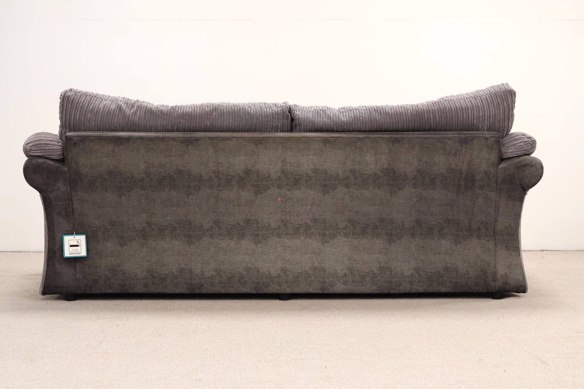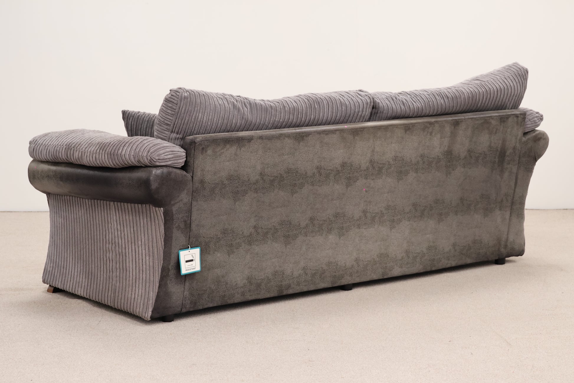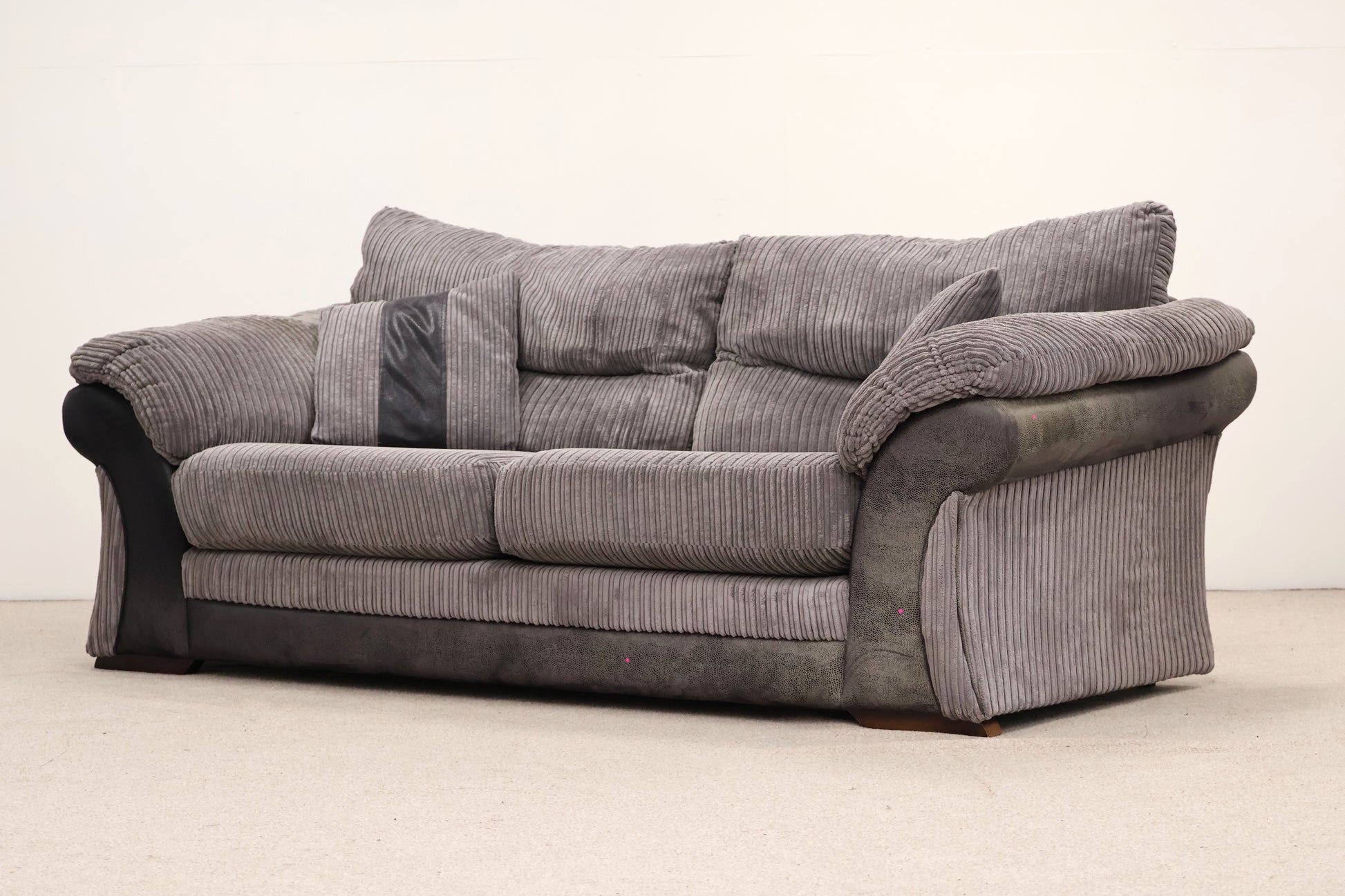 This preloved Grey Cord Sofa combines grey and black leather with cord fabric to offer a comfortable seating experience. Its mixed materials add subtle texture and durability, making it a practical and cosy choice for your living space.