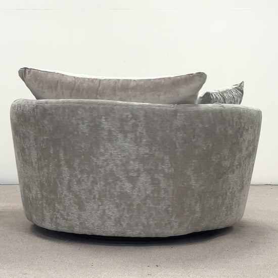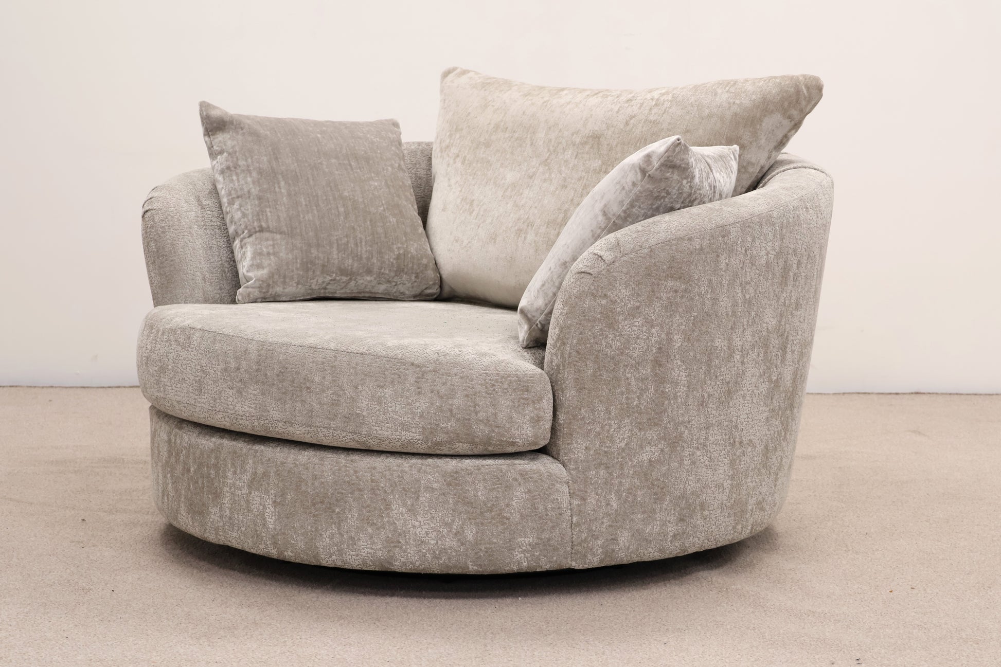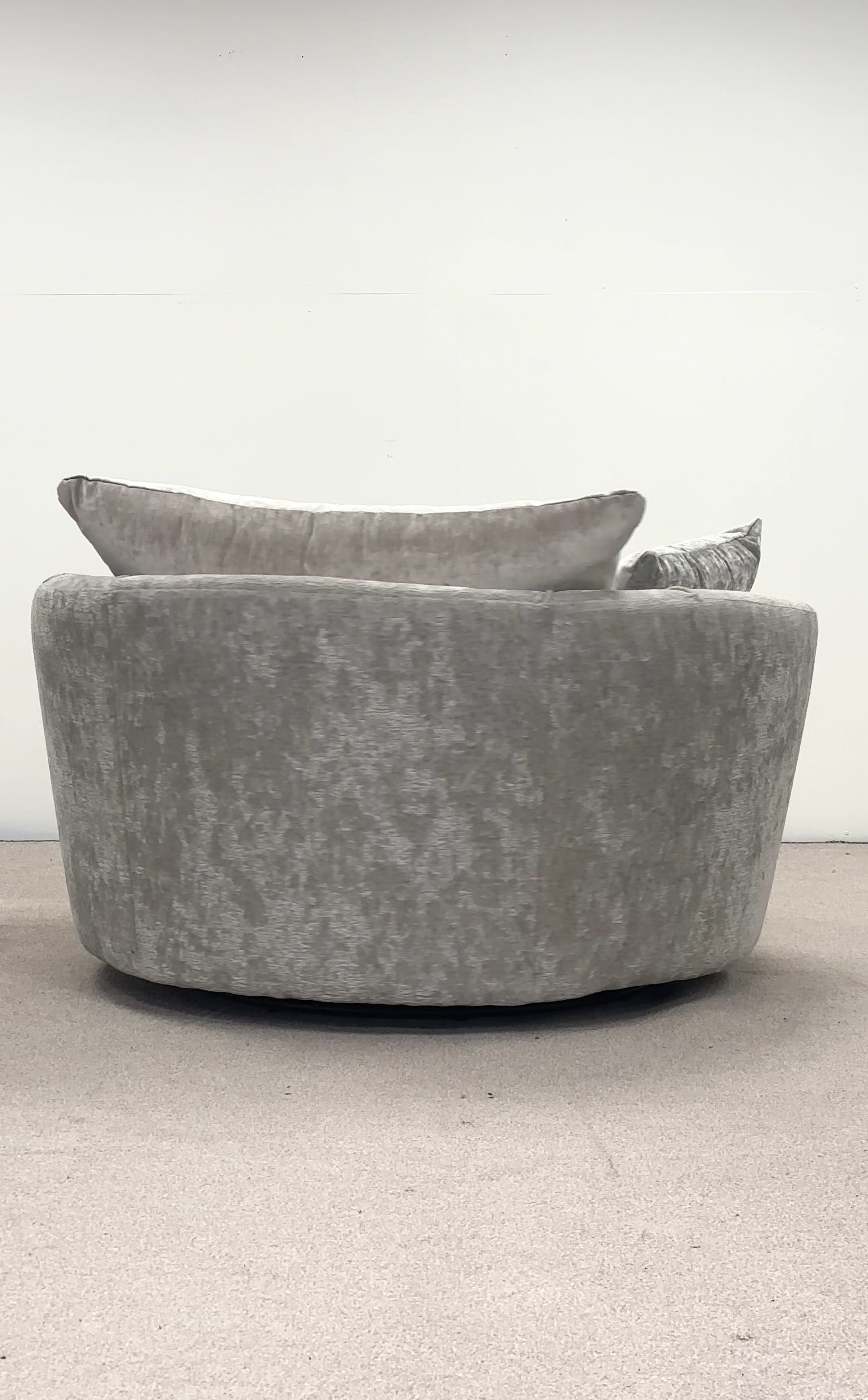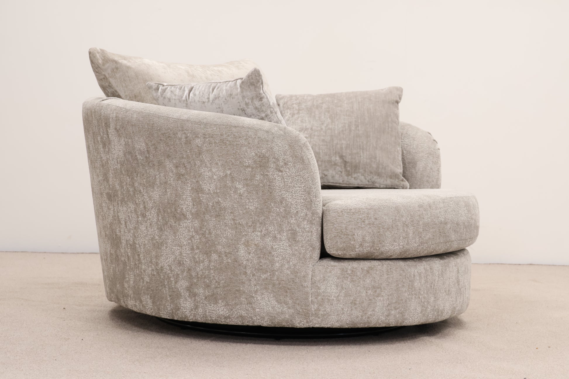 This grey armchair comes with a matching footstool for added comfort and convenience. The chair rotates a full 360 degrees, allowing easy movement and versatility in your space. Its neutral grey tone blends seamlessly with various décor styles, making it a practical and cosy addition to any room.
