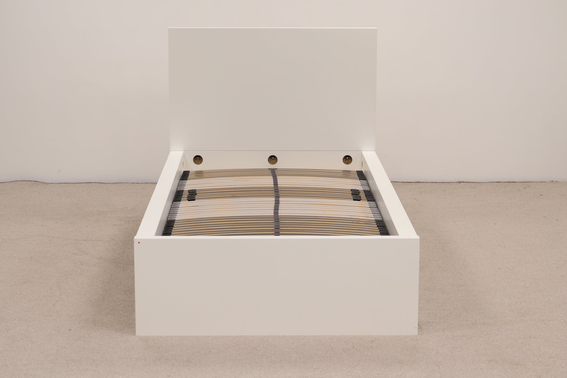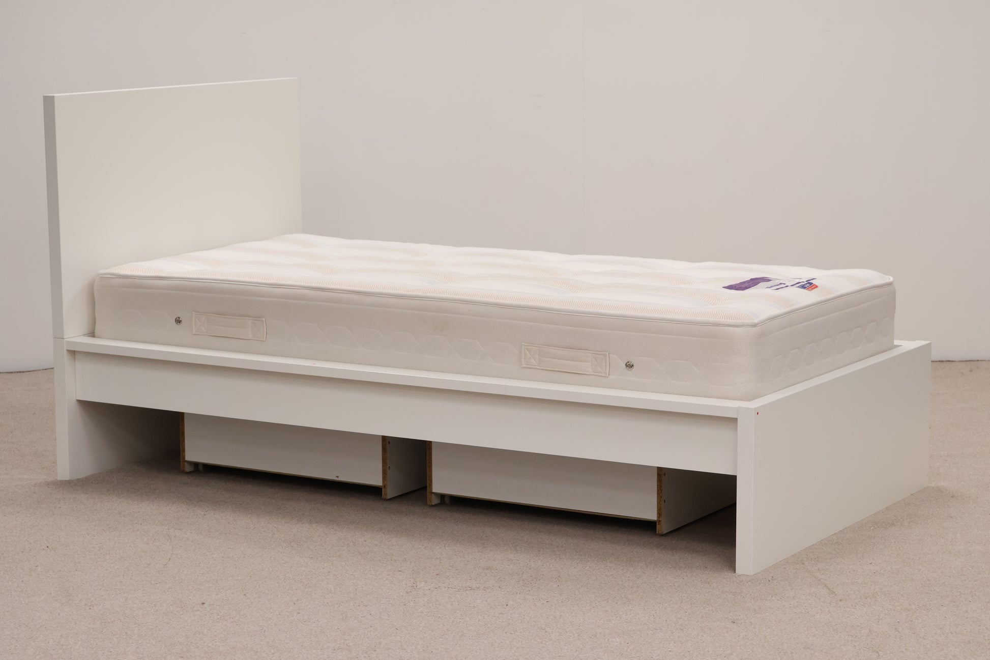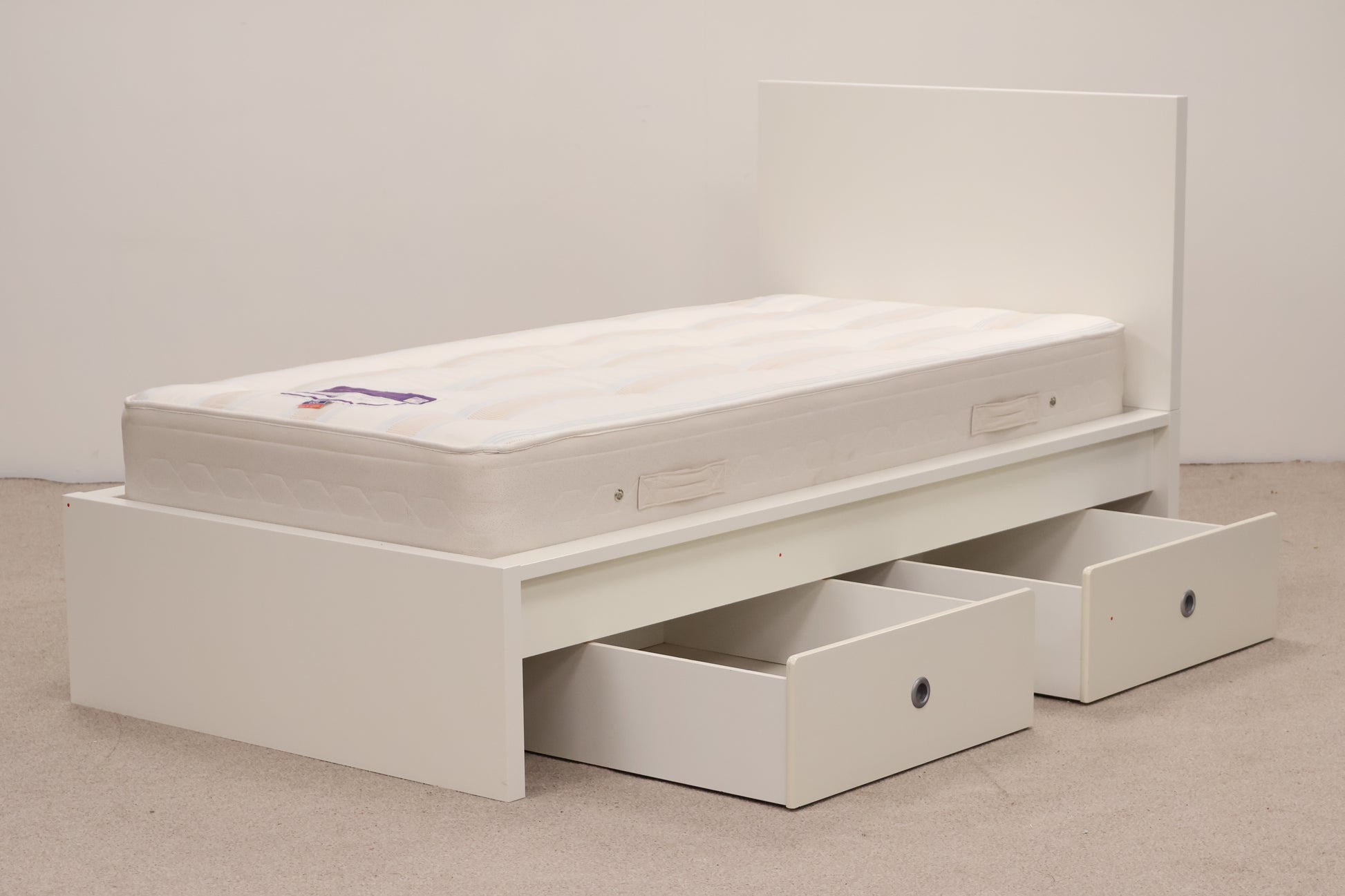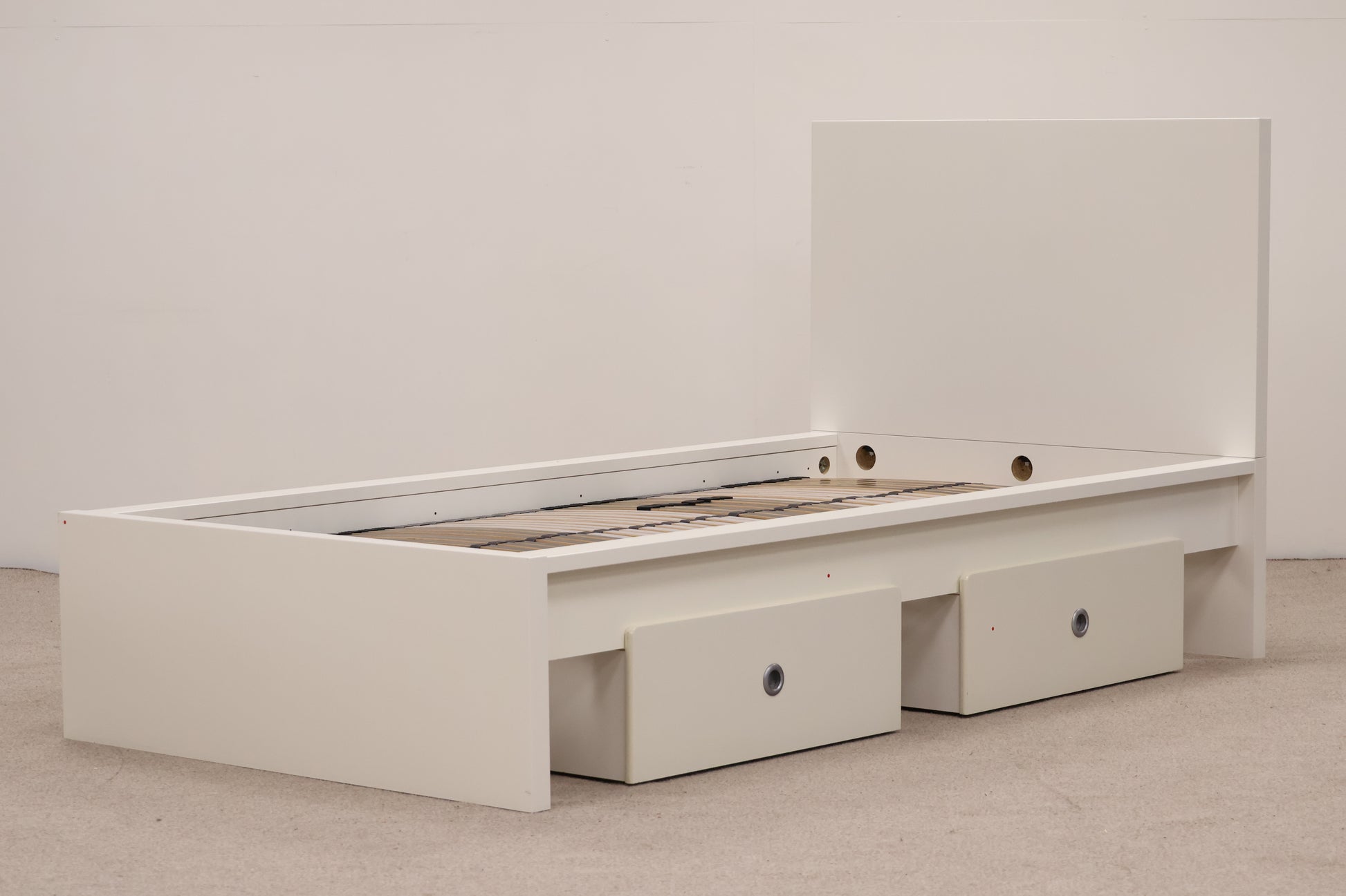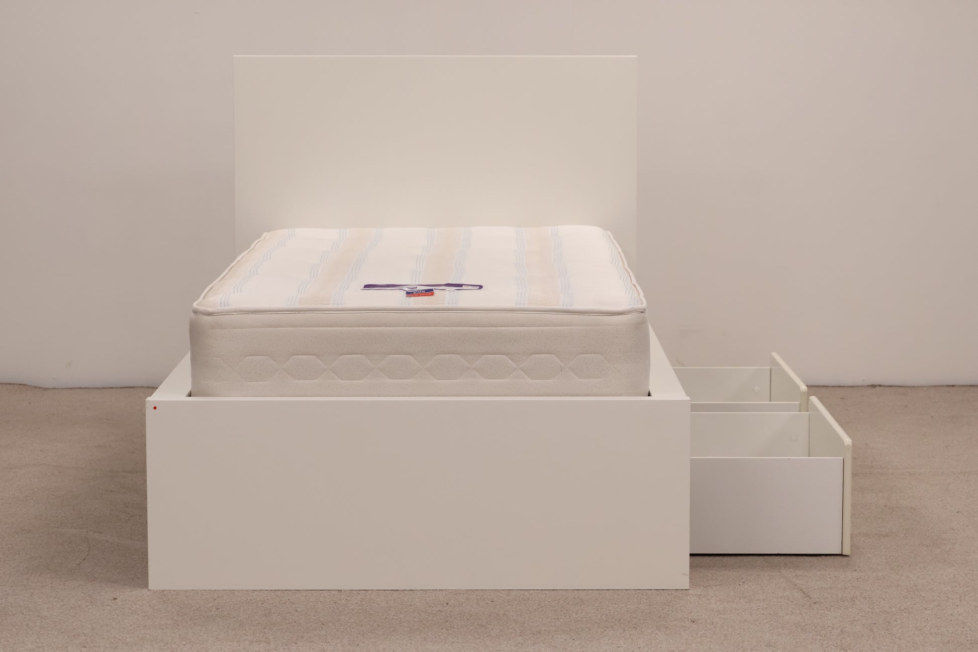 A practical single bed solution from Ikea, complete with a firm mattress included. This straightforward combination offers reliable support for a restful night's sleep. We added two storage drawers which easily pull out for storage.