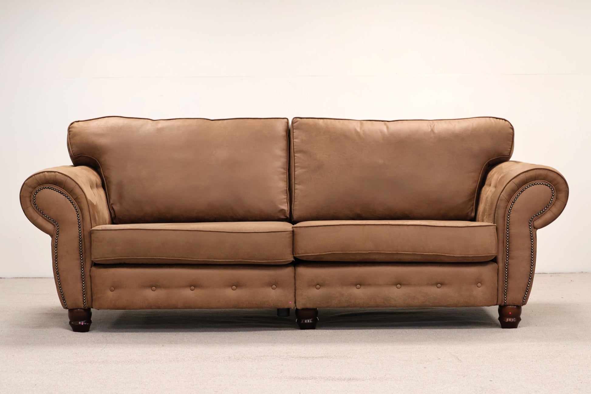 This brown suede sofa features a soft, inviting fabric and offers ample space for multiple people to sit comfortably. Designed for everyday use, it provides a cosy spot to relax or gather with family and friends.