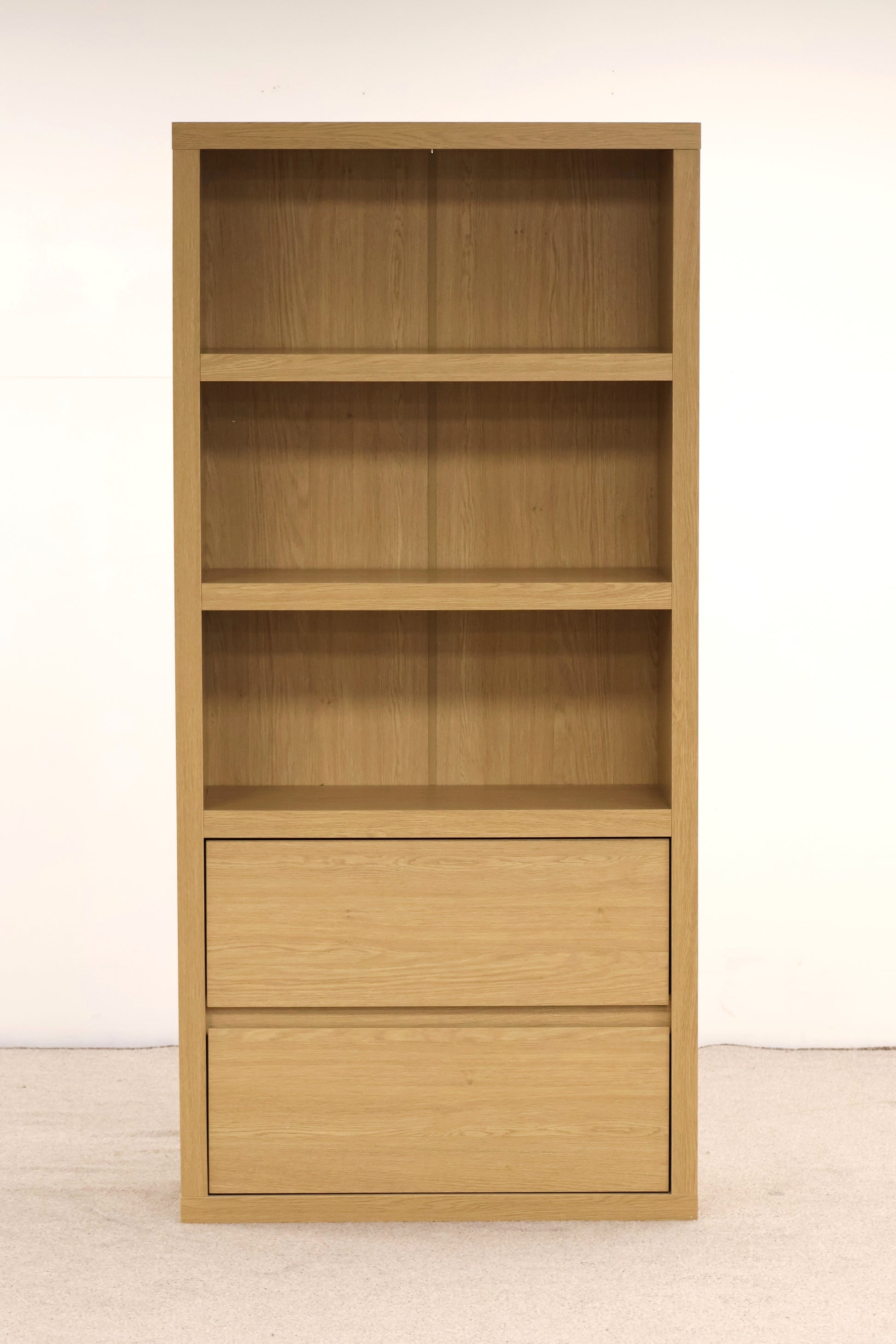 This bookcase features two spacious storage drawers alongside open shelving, offering versatile organisation for books, décor, and essentials. Its practical design helps keep your living or workspace tidy, combining functionality with a straightforward style that fits any room.