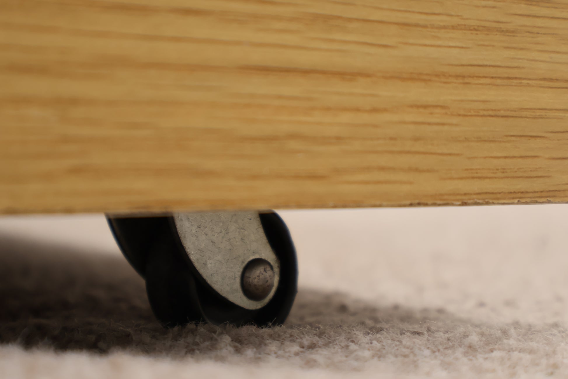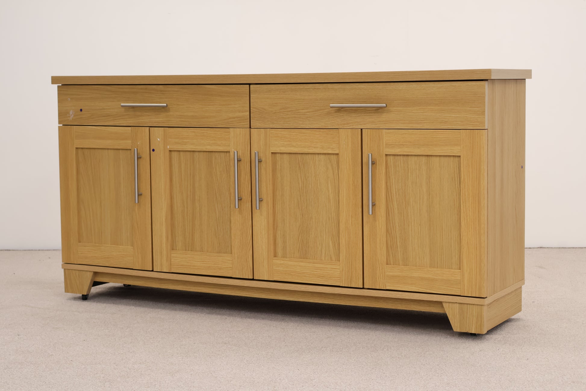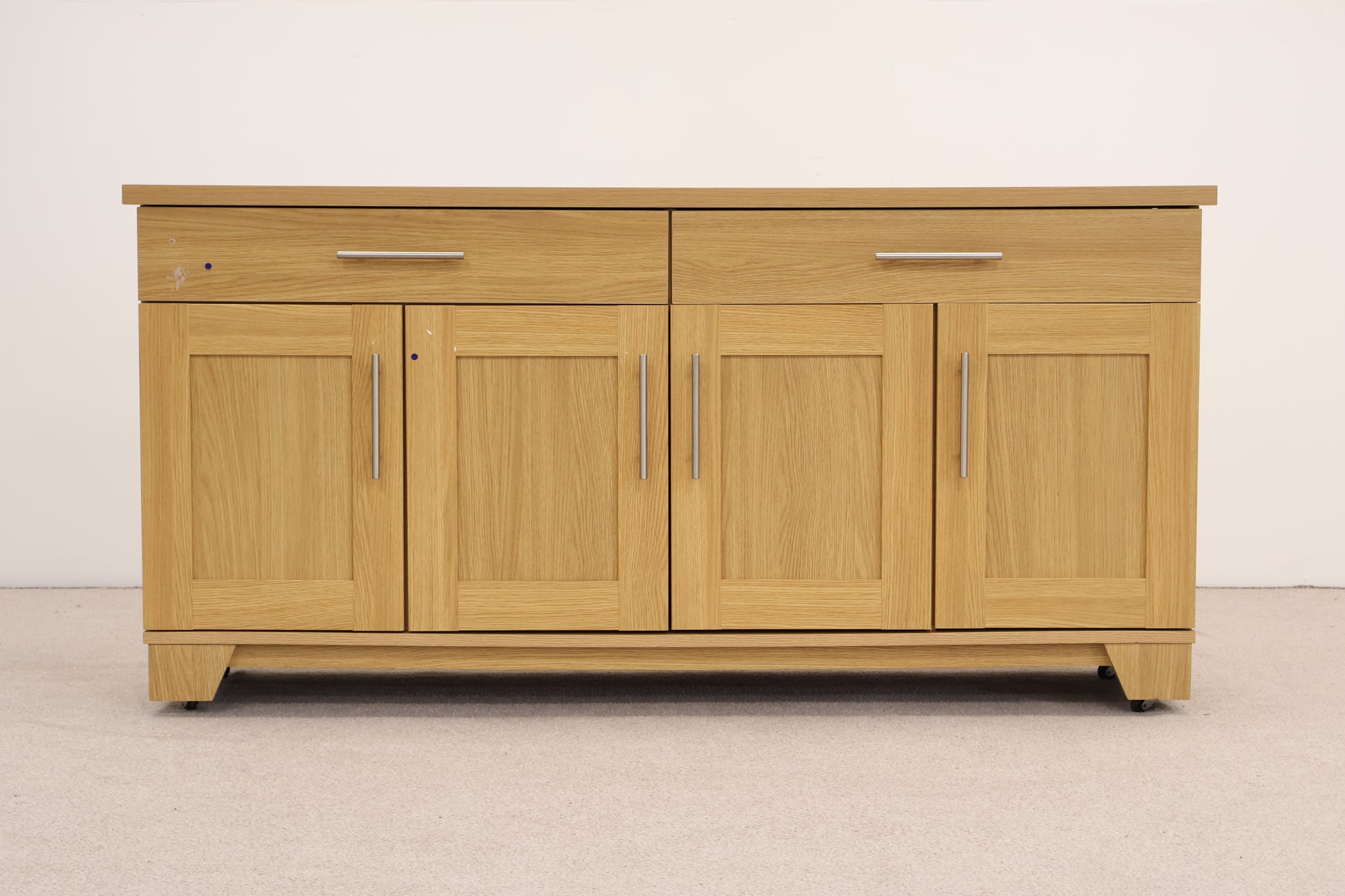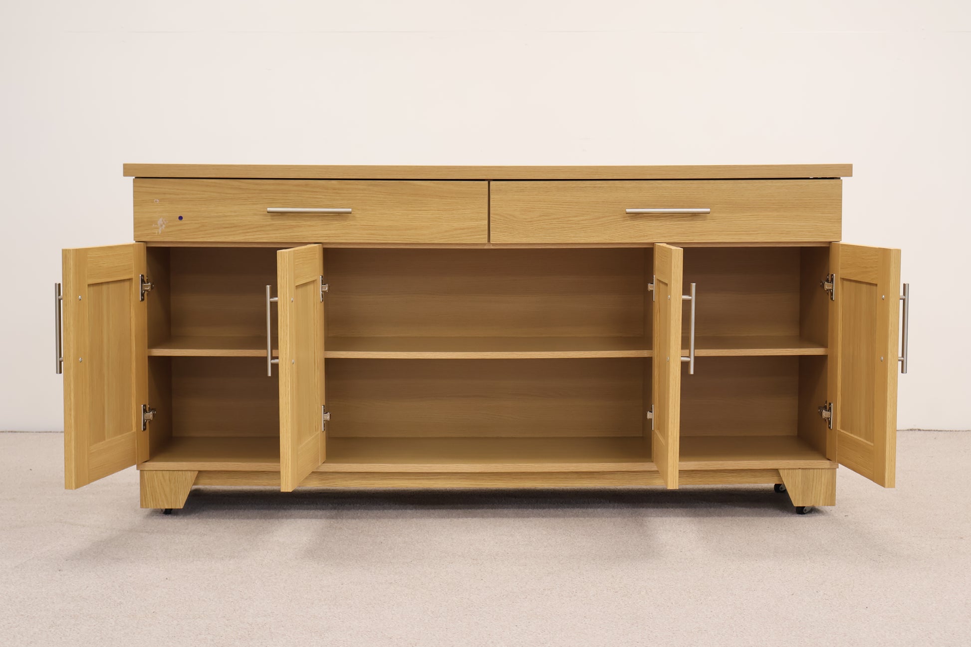 This sideboard offers ample storage with two drawers and four doors revealing shelving, perfect for organising your dining plates and other essentials. Designed on wheels, it allows for easy movement and convenient cleaning, combining practicality with straightforward functionality.