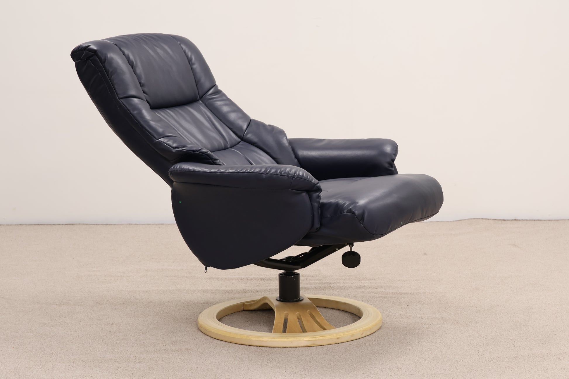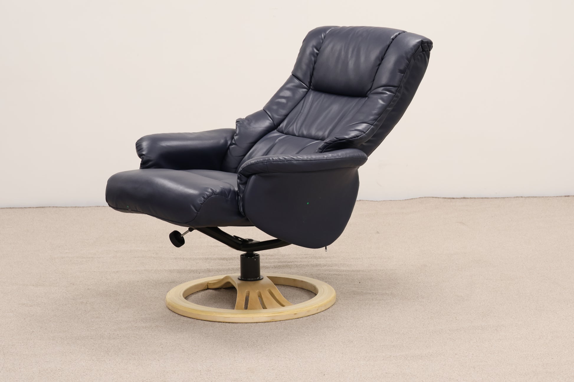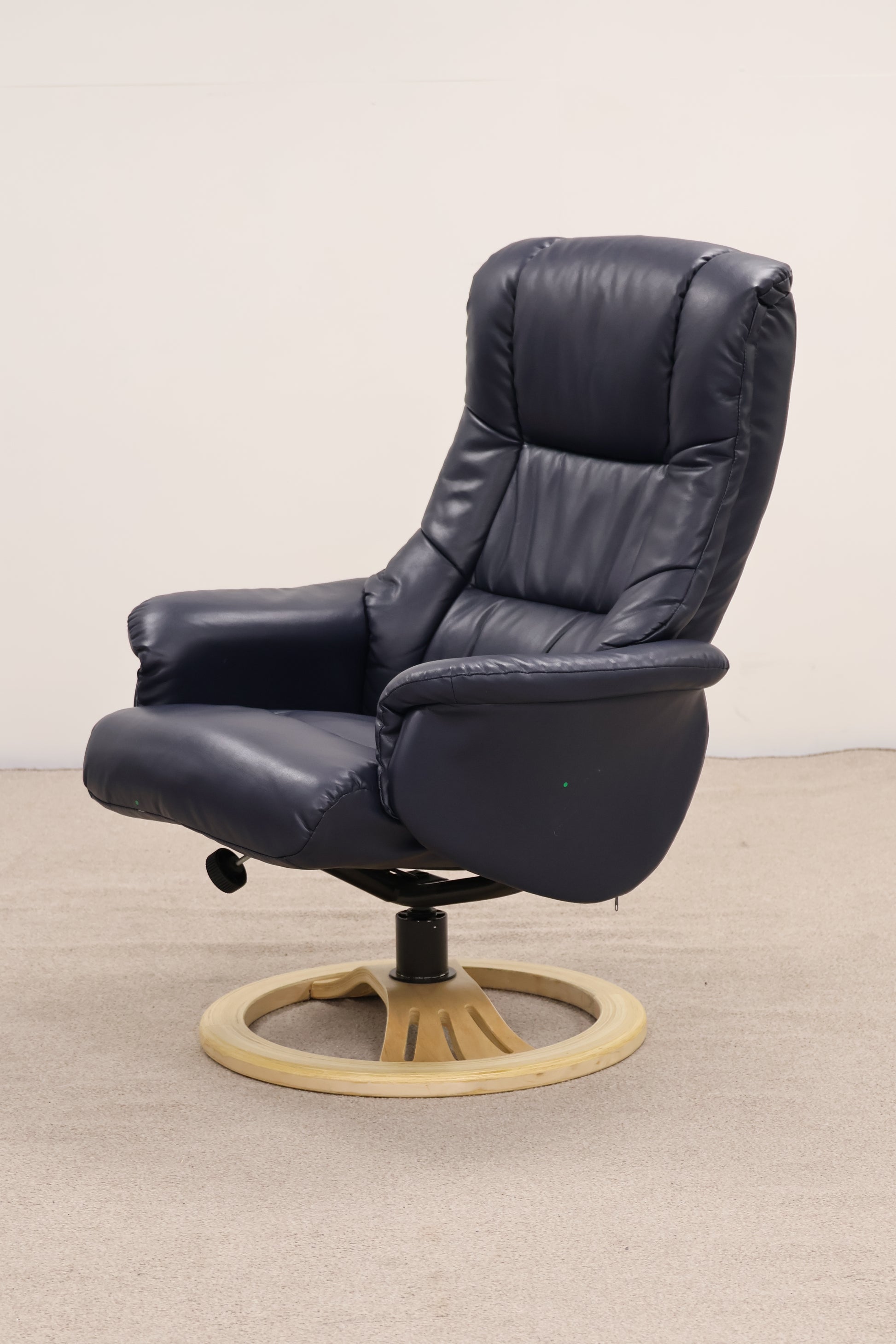 Sink into comfort with this stunning faux leather armchair, expertly crafted for relaxation. Finished in a rich navy tone, this preloved piece is in excellent condition and ready to become your new favourite spot. Enjoy 360-degree rotation for effortless repositioning and a smooth reclining function to find your perfect lounging angle.