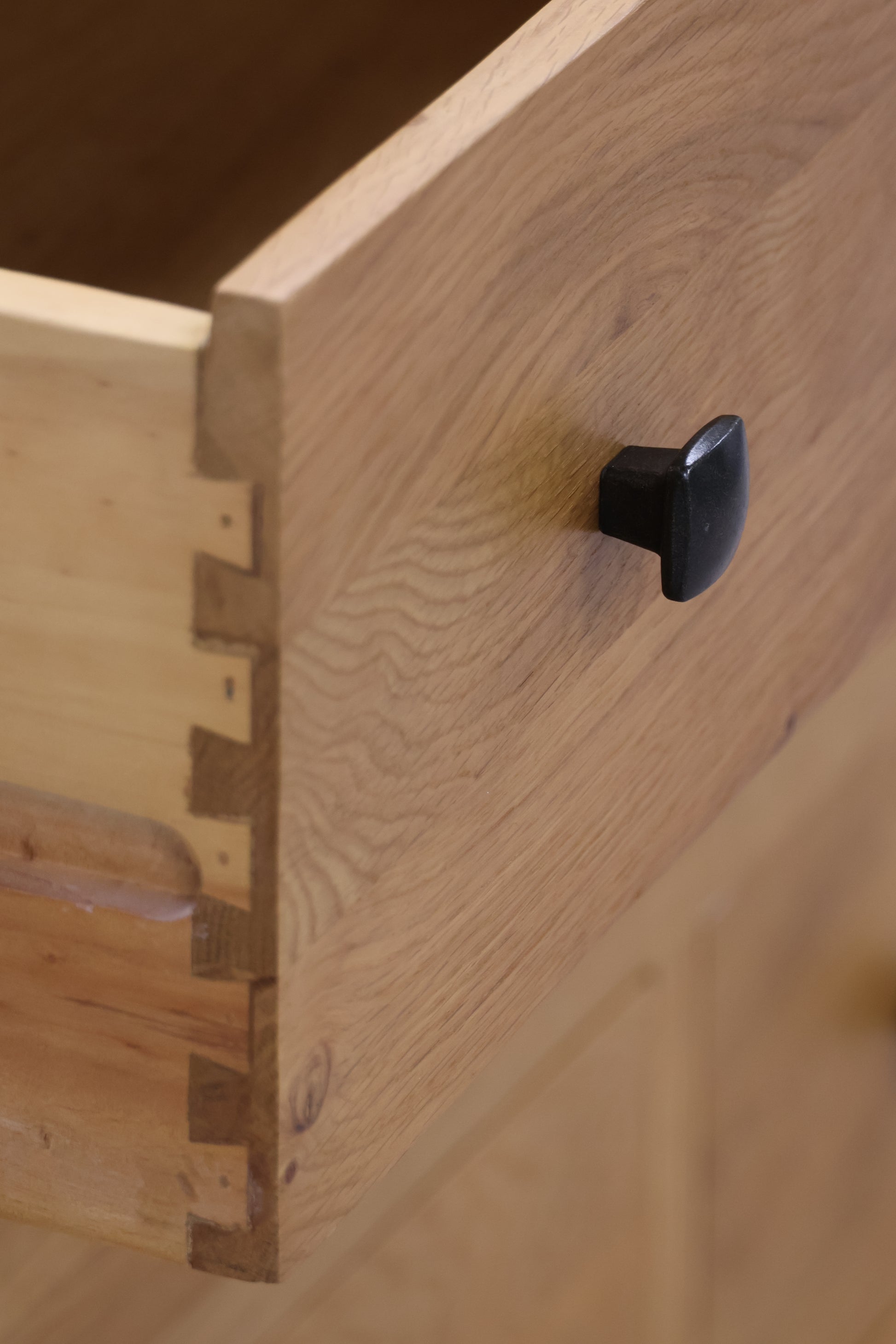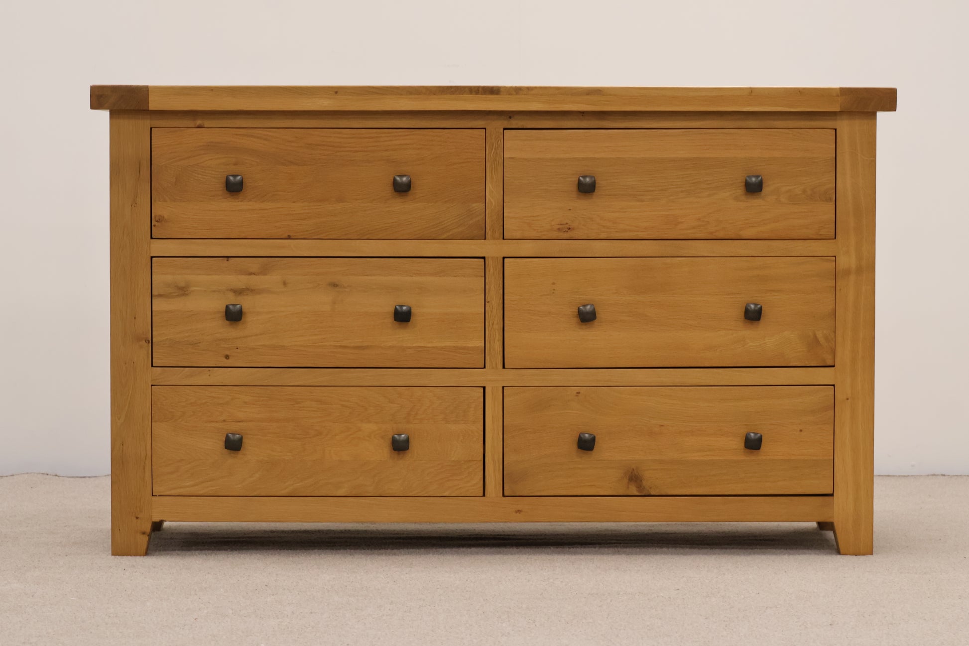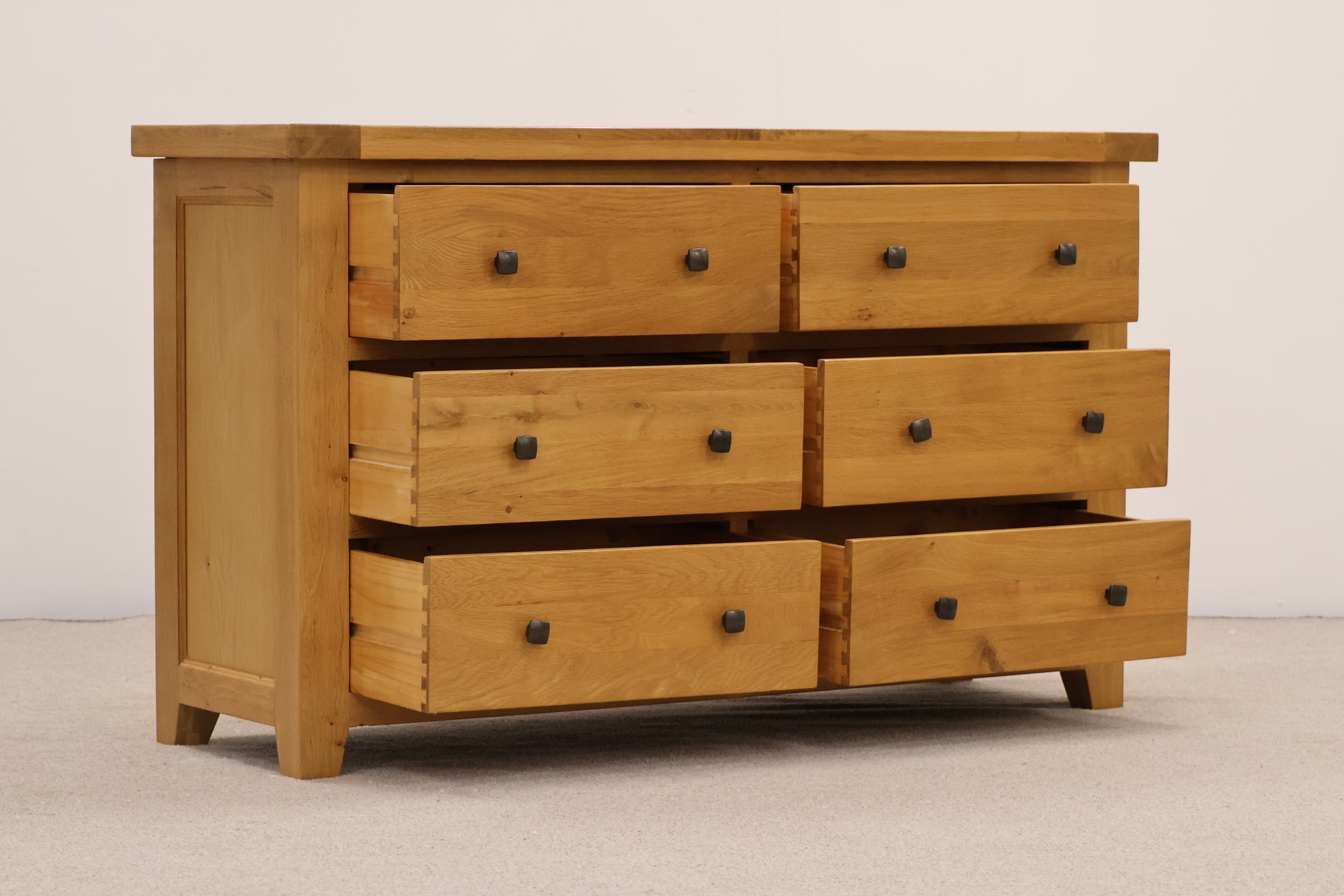 This substantial oak chest of drawers combines timeless elegance with practical storage. Six generously proportioned drawers provide ample space for clothing, linens, and household essentials, whilst the solid oak construction ensures durability for years to come. The natural wood grain and classic design make it a versatile addition to any bedroom, complementing both traditional and contemporary interiors. A reliable piece that balances form and function.