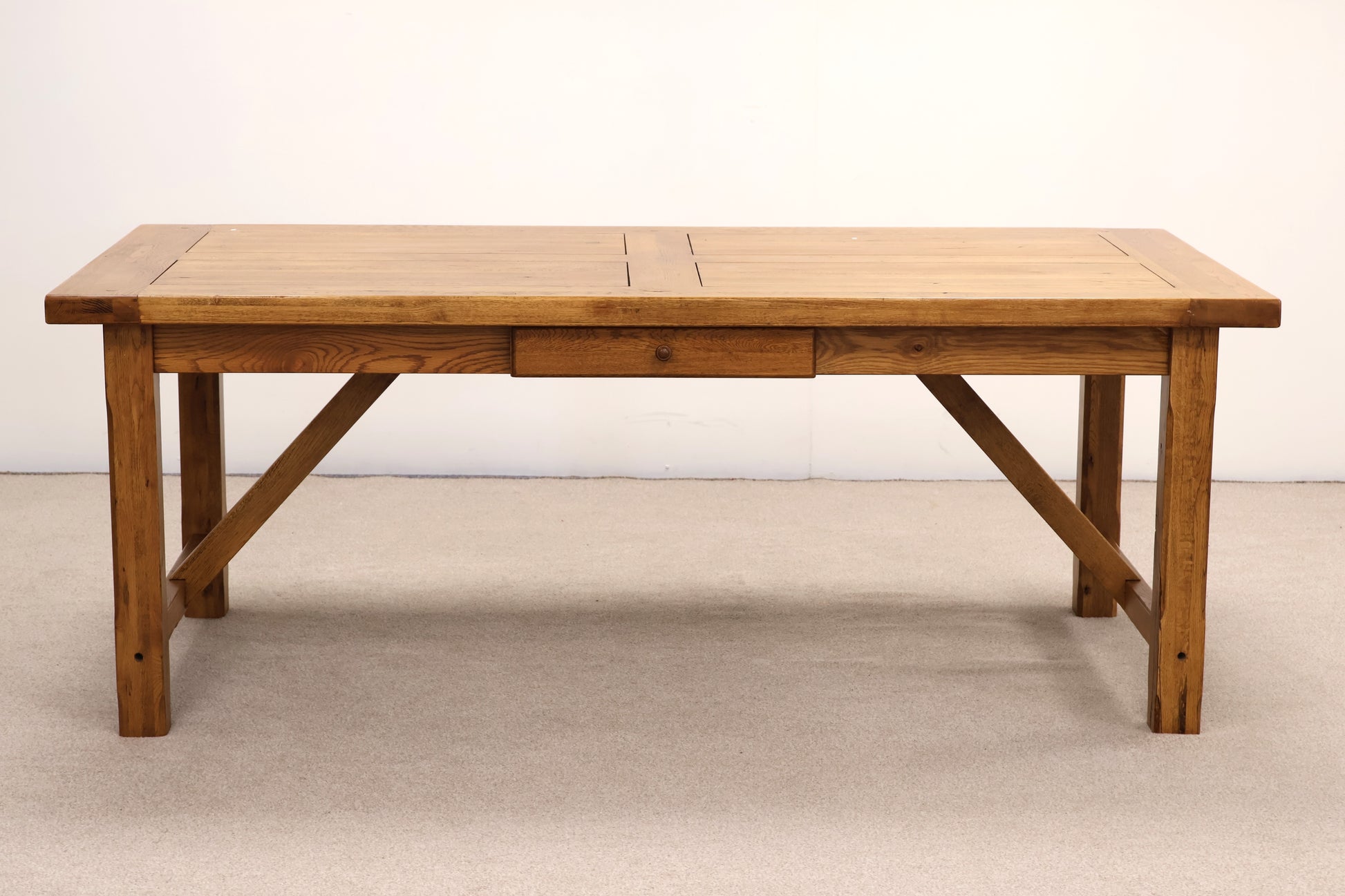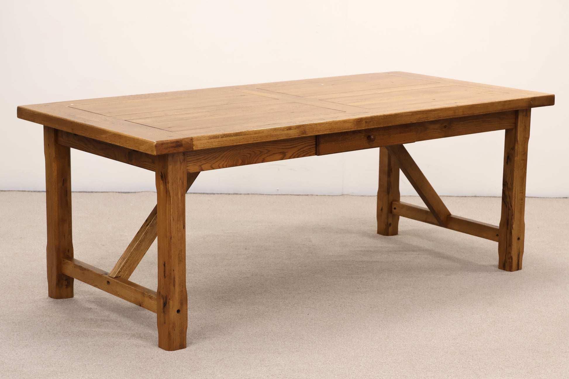 Crafted from solid oak wood, this extendable dining table brings timeless elegance to your home. The table features two convenient drawers for storing table linens and cutlery, whilst the extending mechanism accommodates 6-10 guests, making it perfect for family gatherings and entertaining. The sturdy construction ensures durability for years to come.