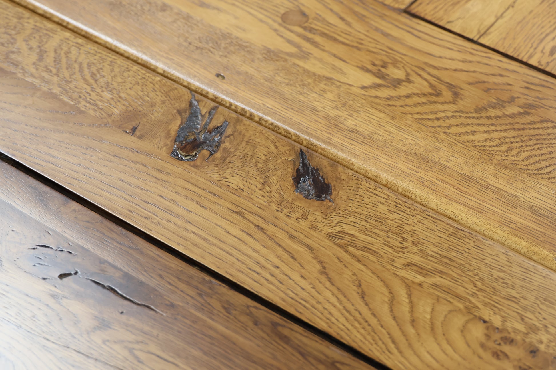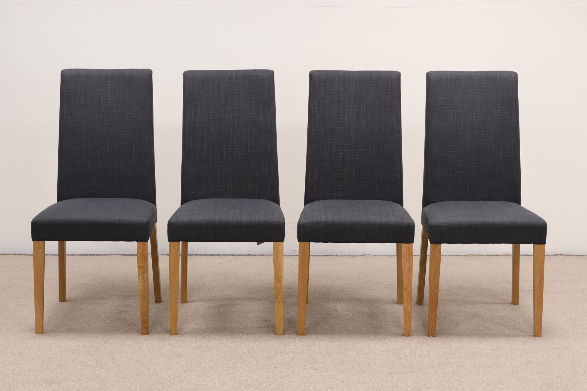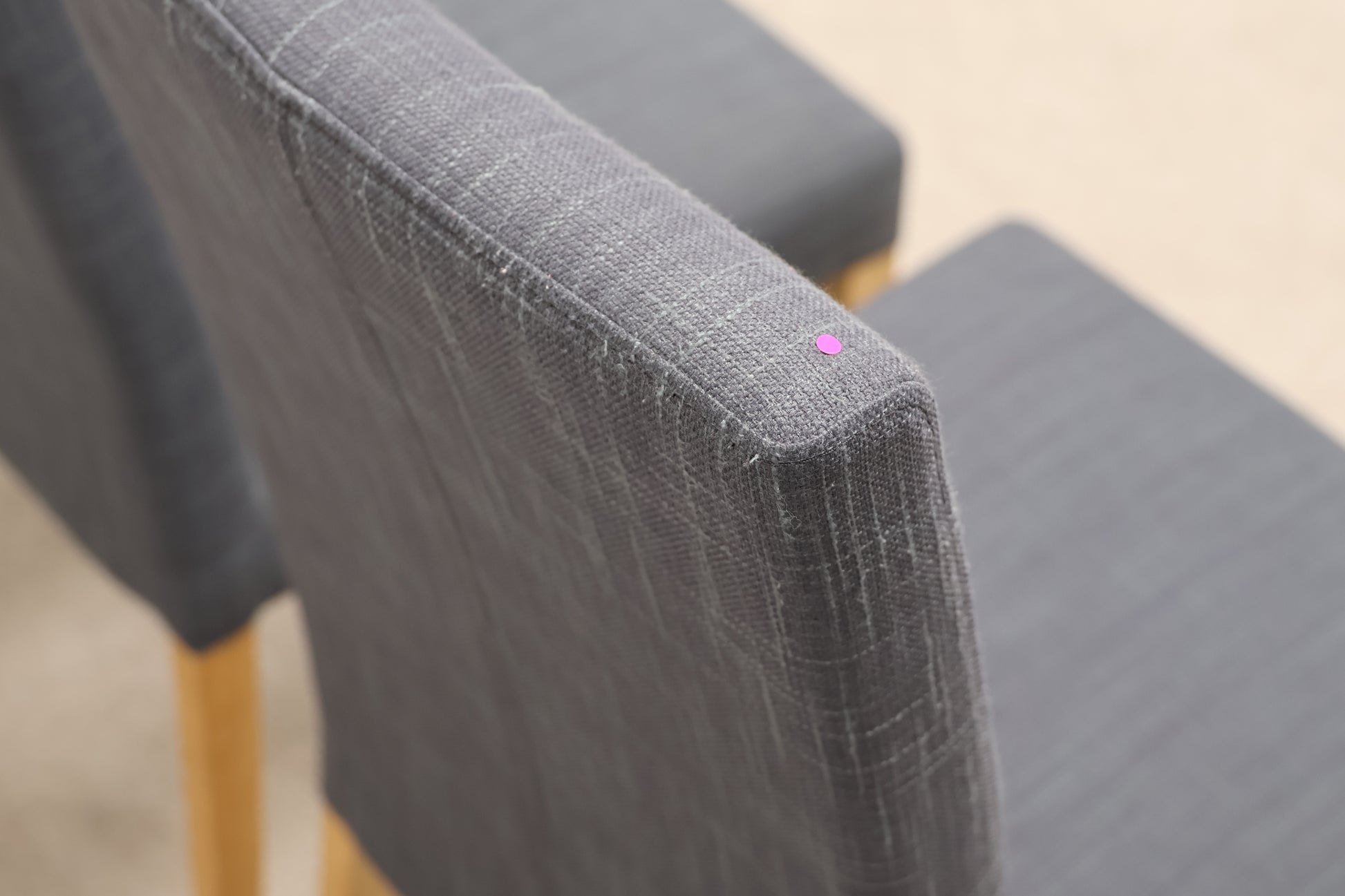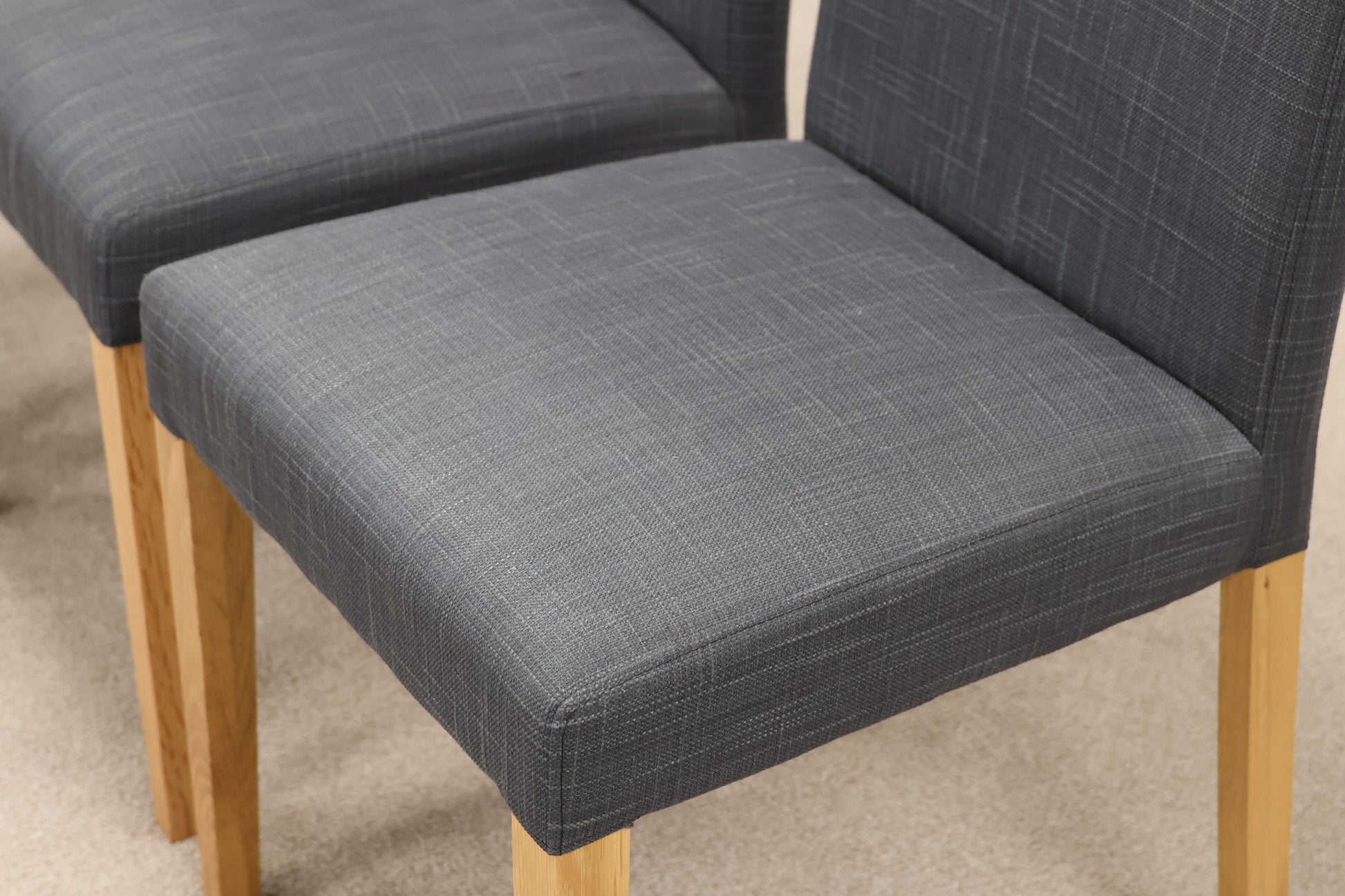 Wear and Tear: Oak wood in excellent condition, some small blemishes, shown in our pictures with honesty dots. Chair set has slight fabric wear with use, otherwise in great preloved condition. The extendable leaves easily slide in and out of each table side.
