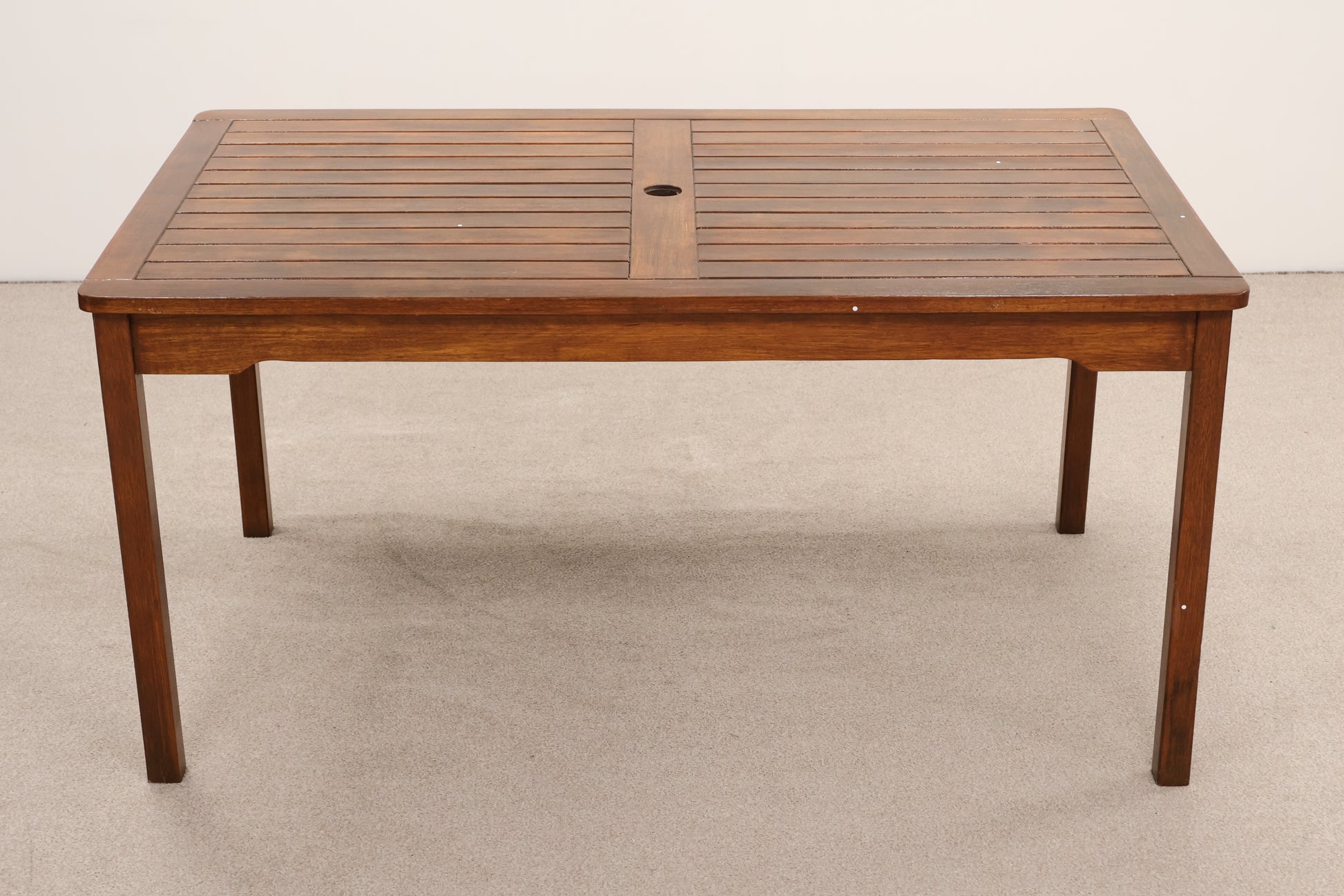 This sturdy outdoor dining table is crafted from durable wood to withstand the elements while providing a natural, timeless look. It includes a convenient parasol hole, allowing you to add shade easily for comfortable outdoor dining. Perfect for garden or patio use, it offers a practical and attractive gathering spot for family and friends.