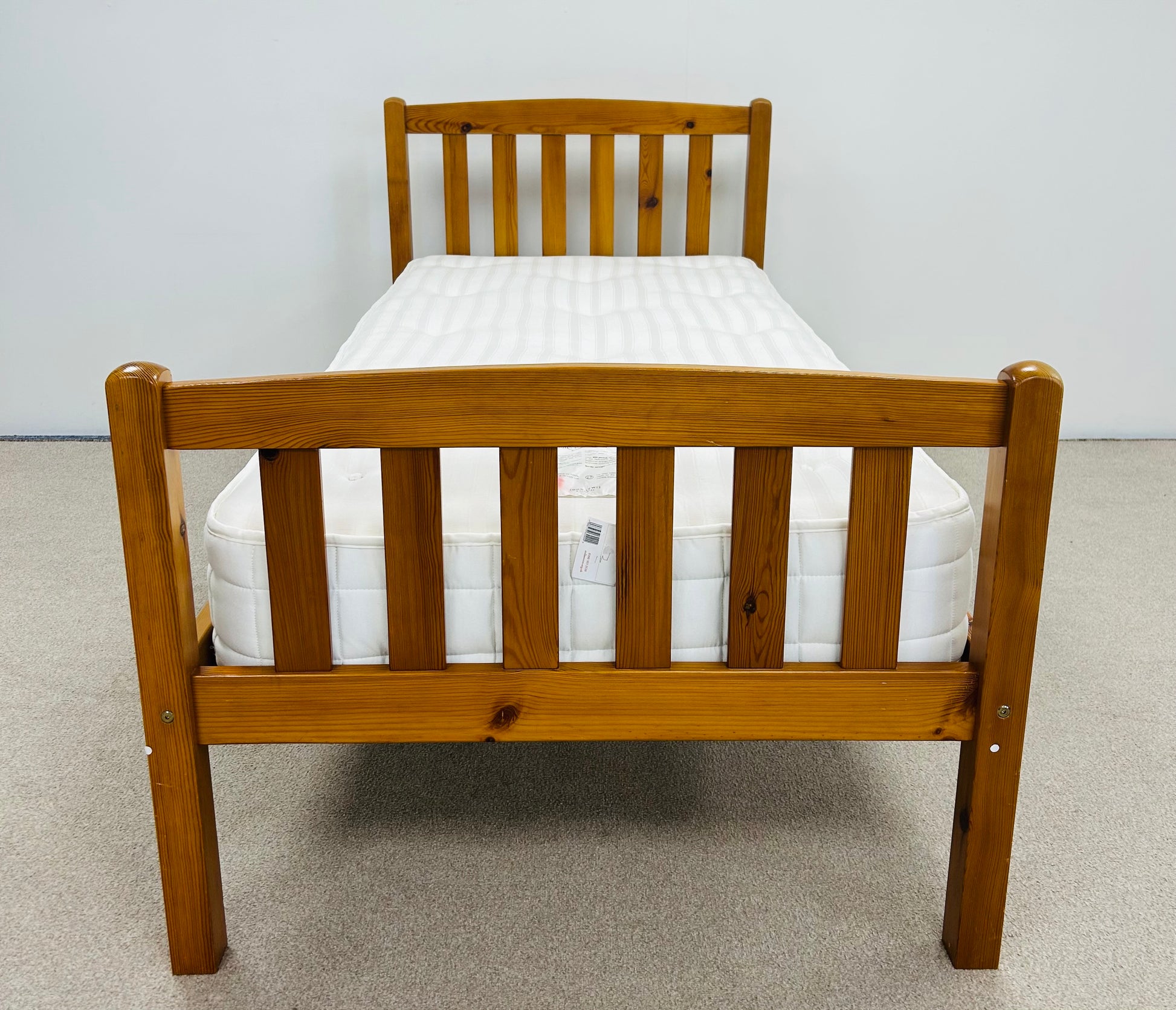 This sturdy, single, pine bed is both practical and sustainable. Made from solid pine this bed frame is matched with a John Lewis mattress, sanitised through our mattress project making this the ideal all-in-one purchase!