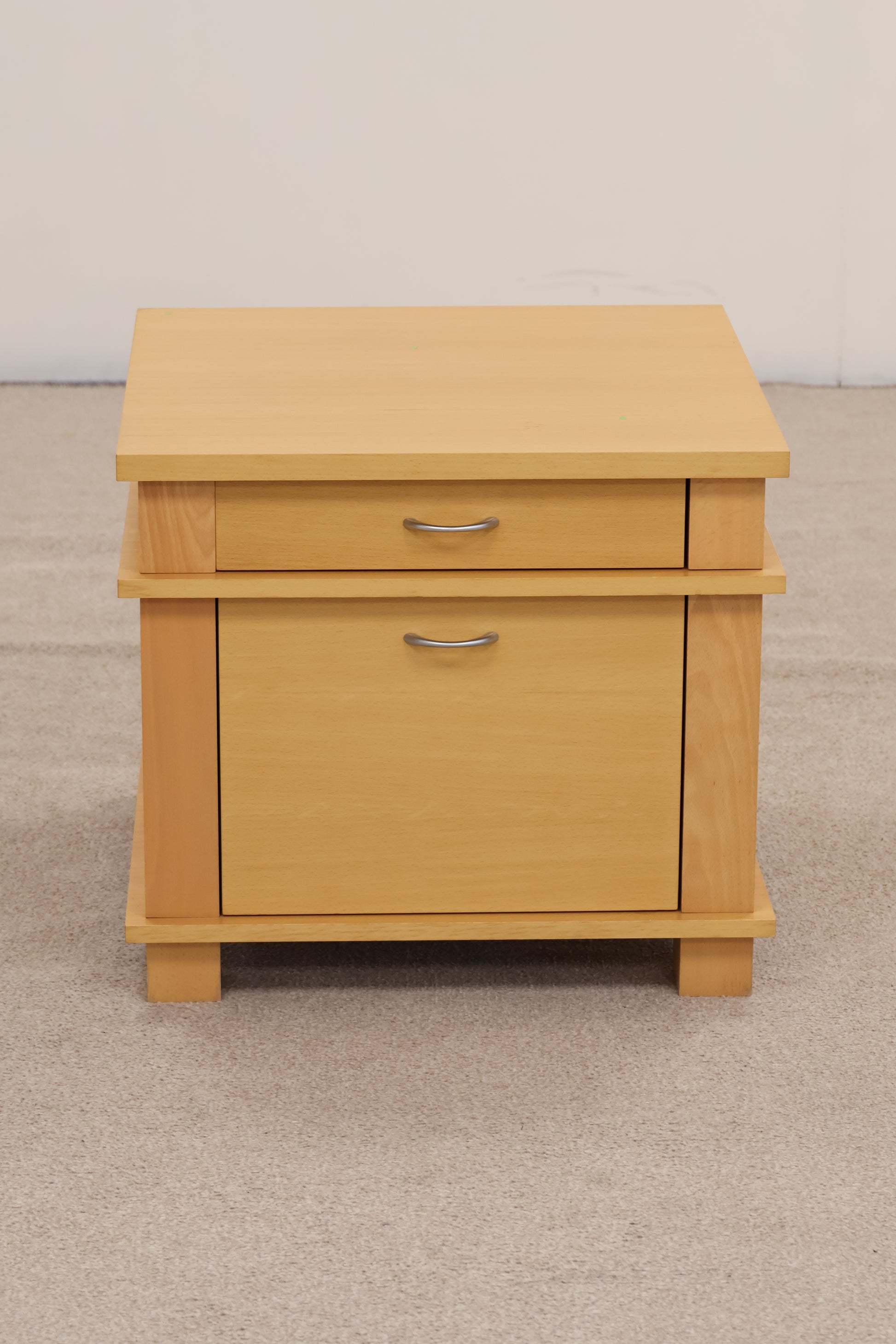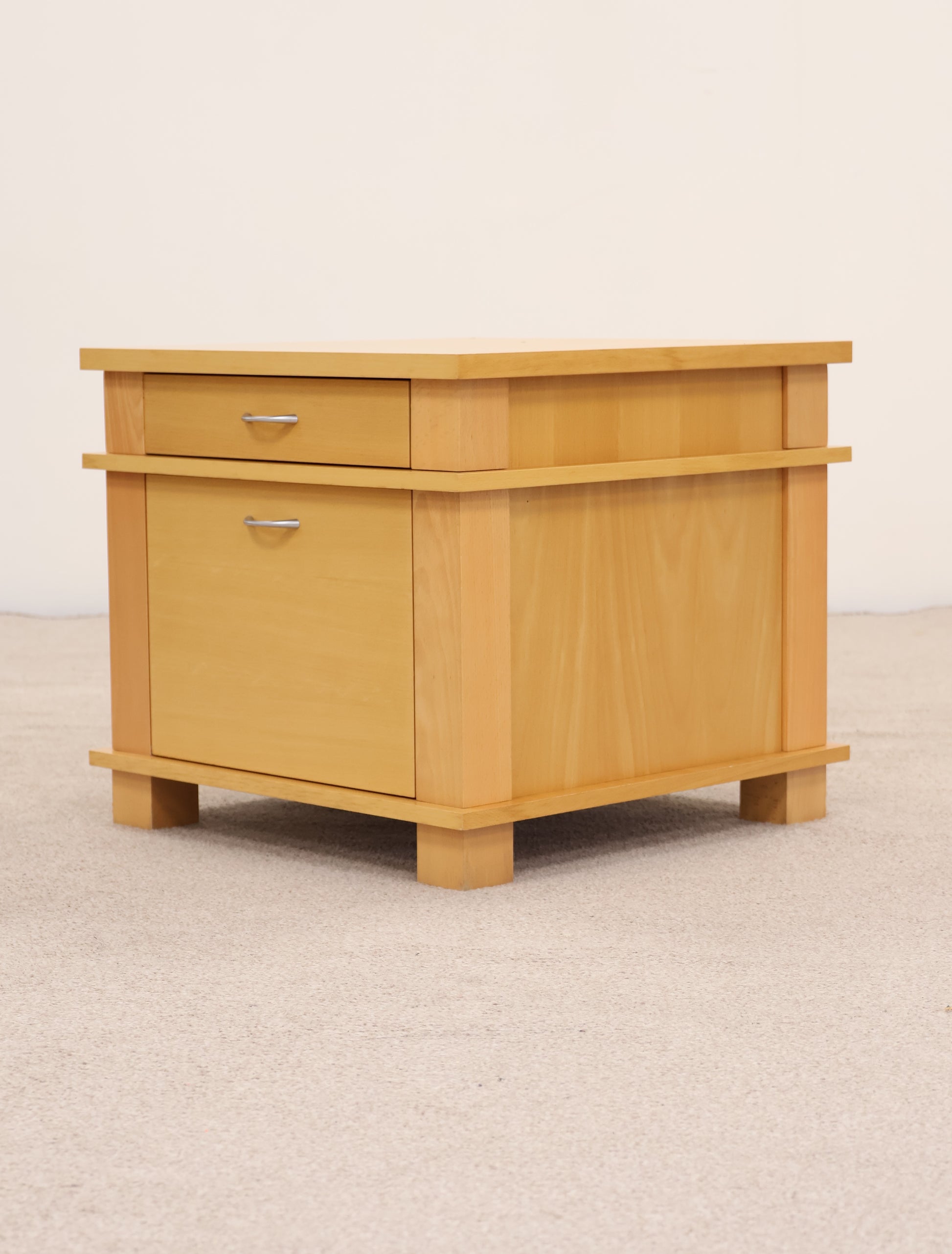 This light brown side cabinet offers practical storage with two drawers: a shallow top drawer and a deeper bottom drawer for larger items.