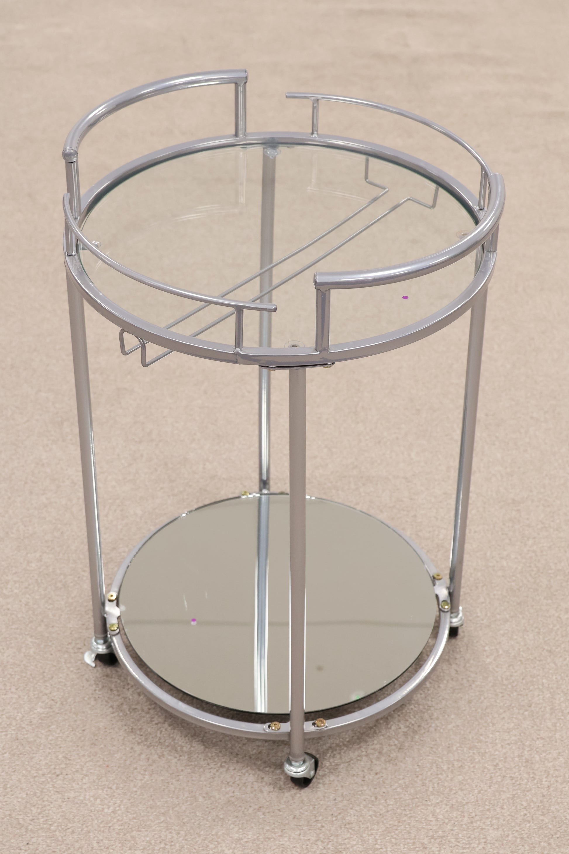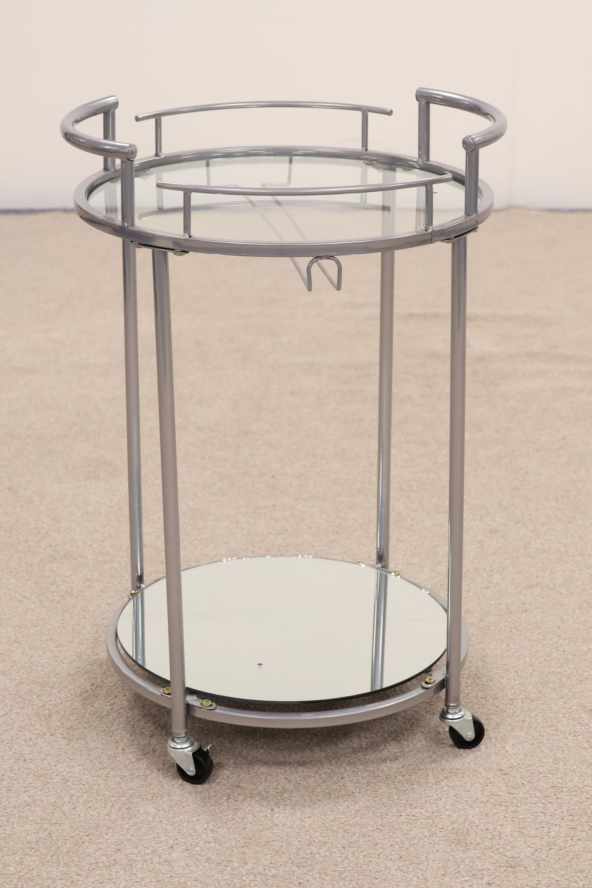 A silver, mirrored drinks trolley on wheels for easy movement around your dining room or living-room. Set up nicely in the corner this item would look great as part of your hosting.