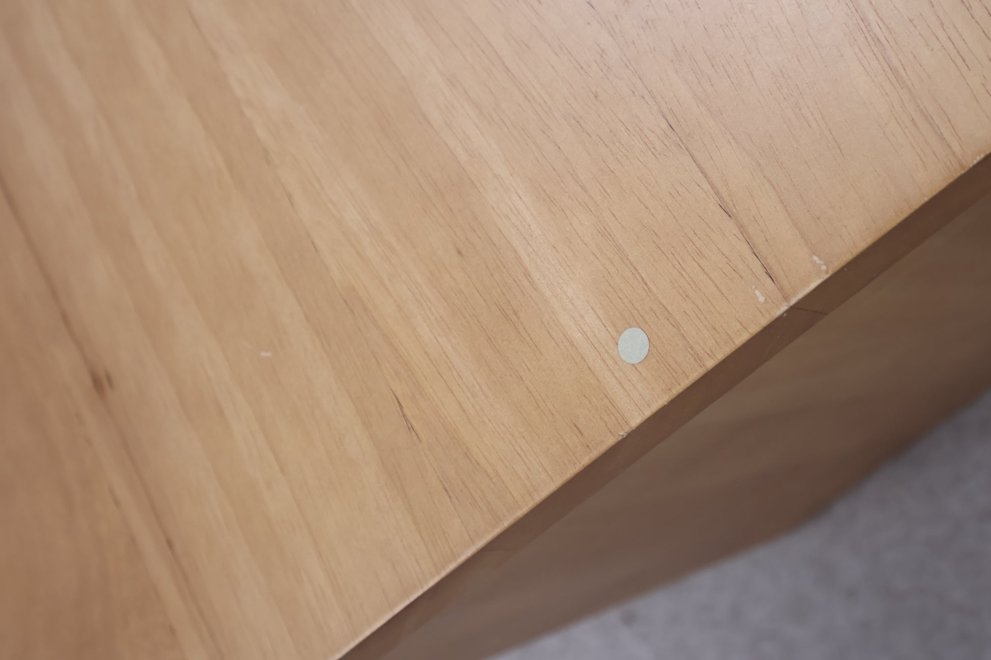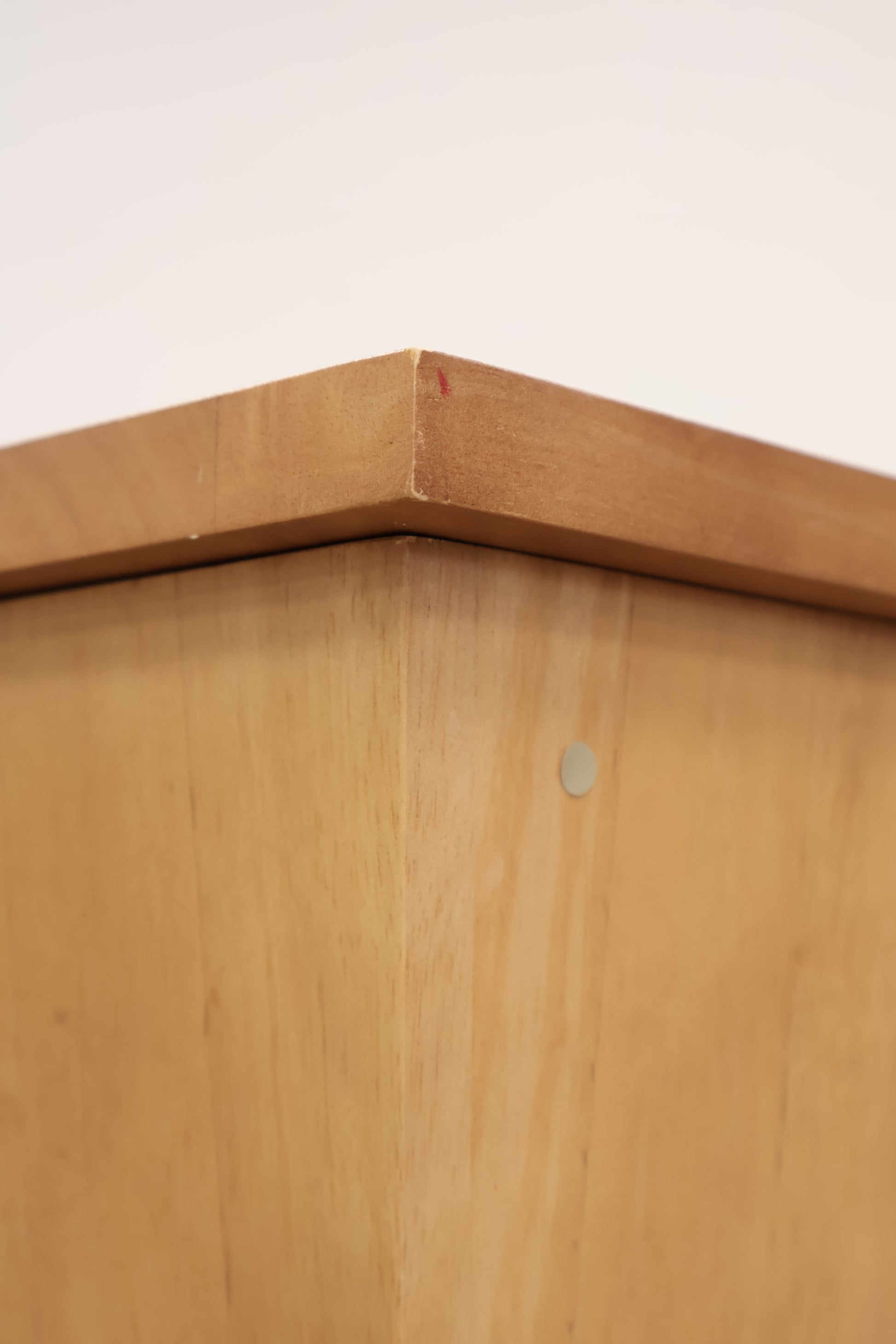 This light brown wood seat features a convenient storage compartment inside, perfect for keeping items tidy. It is in good condition with no major wear, aside from a single scratch mark on the top as shown.