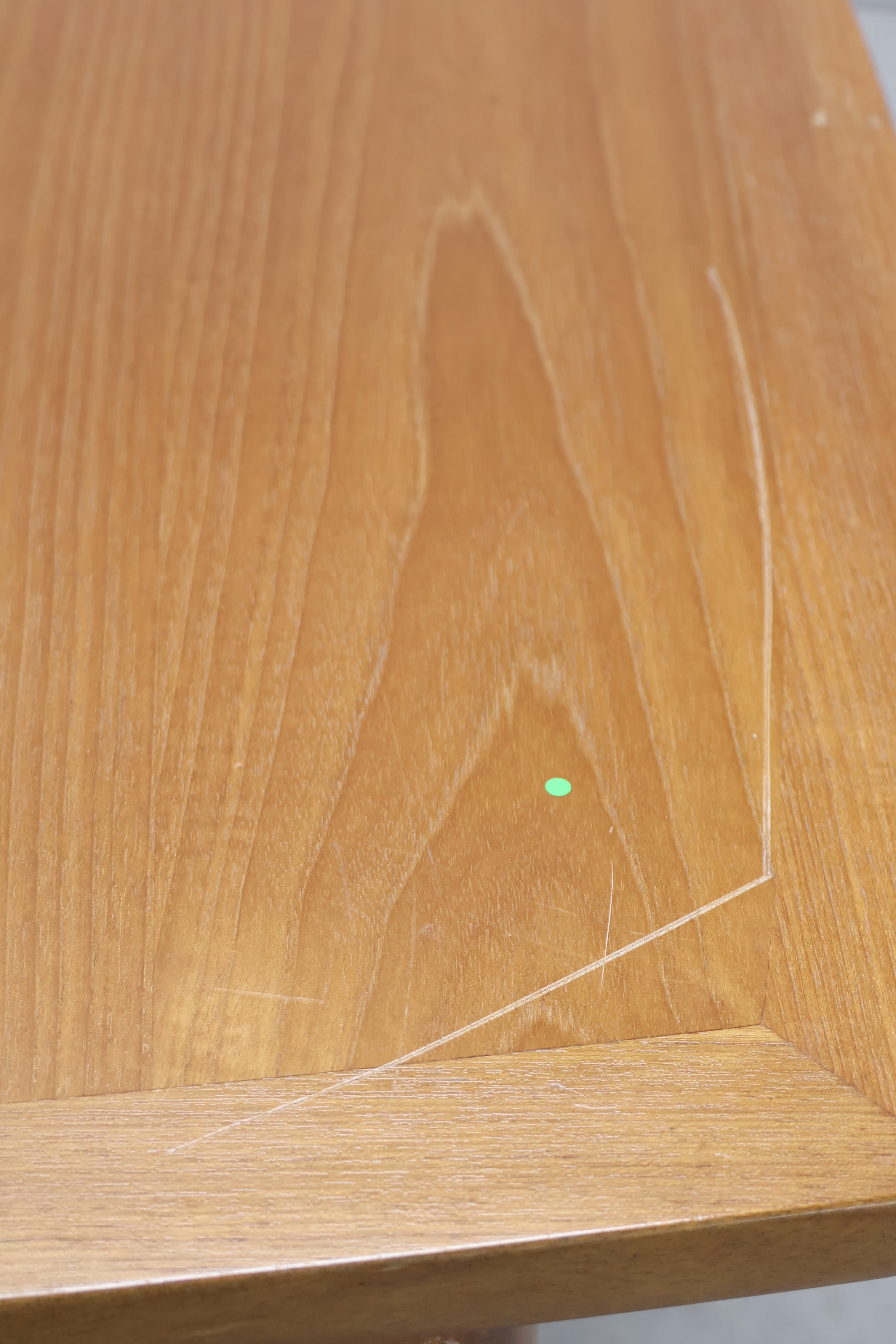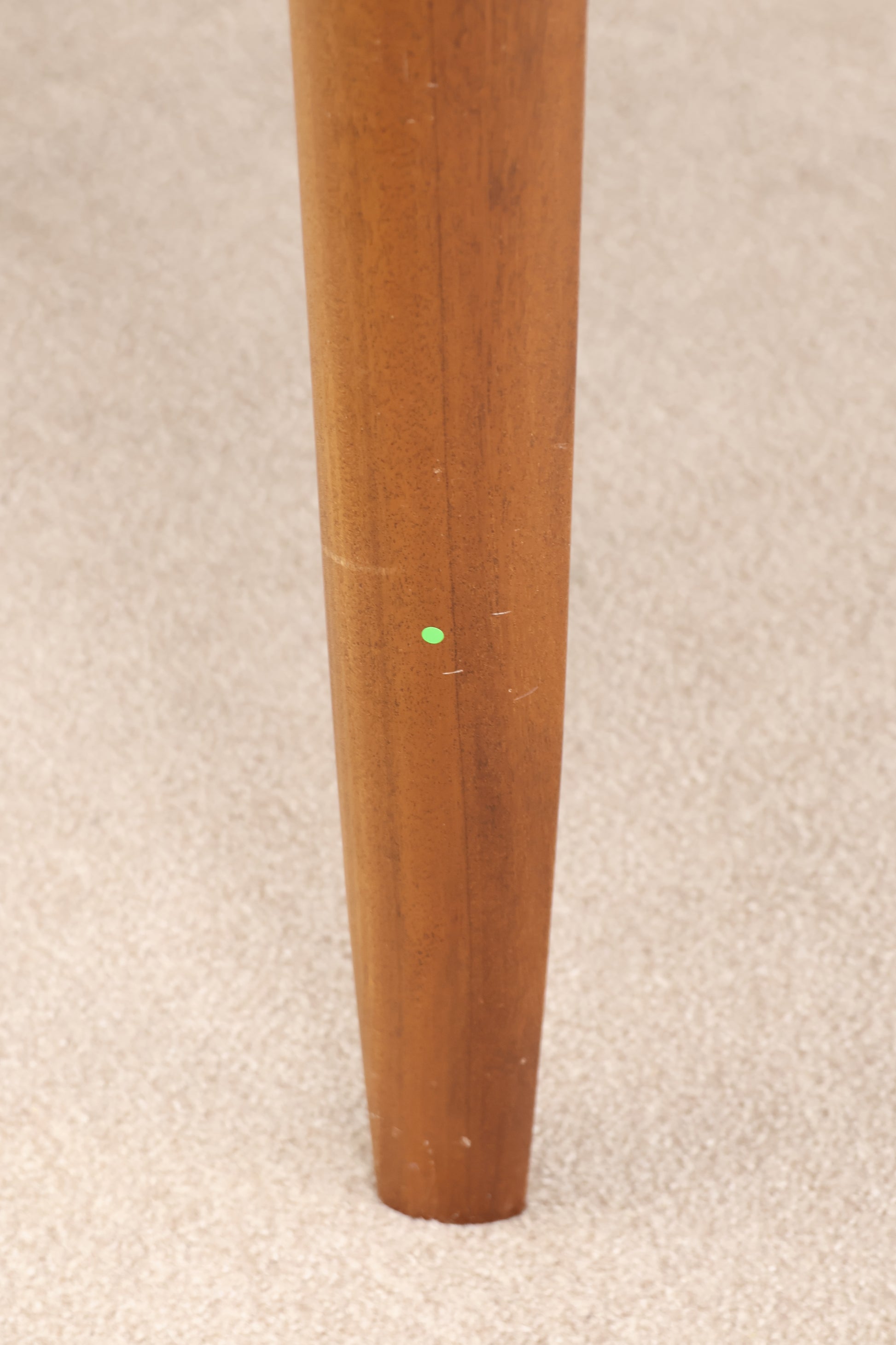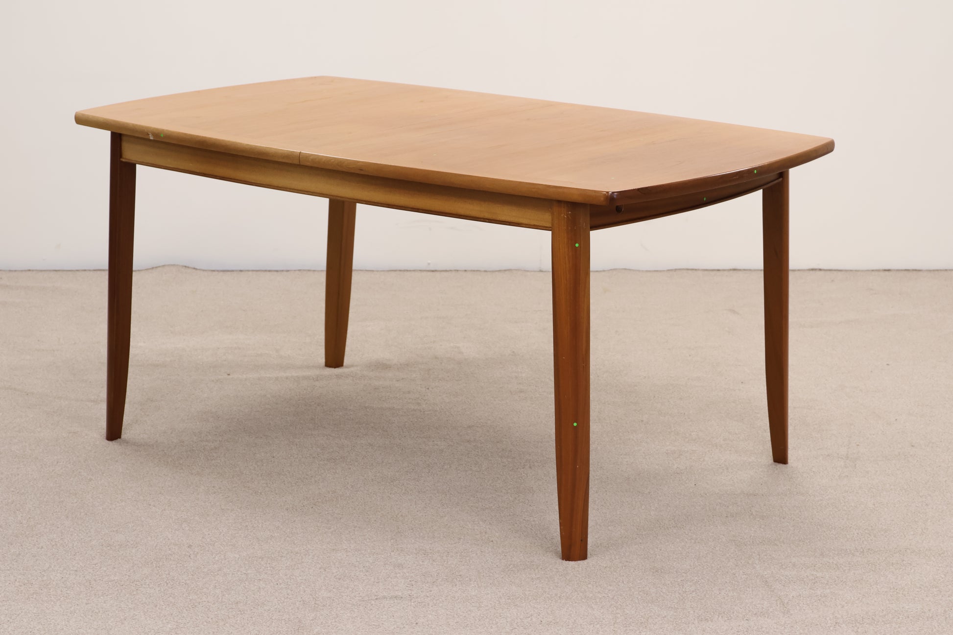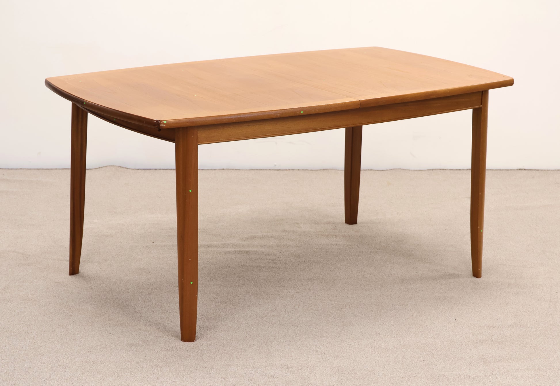 This teak wood table features natural durability and a warm finish. It has some scratch marks and dents that reflect its use and character. Please note, the table requires assembly upon arrival.