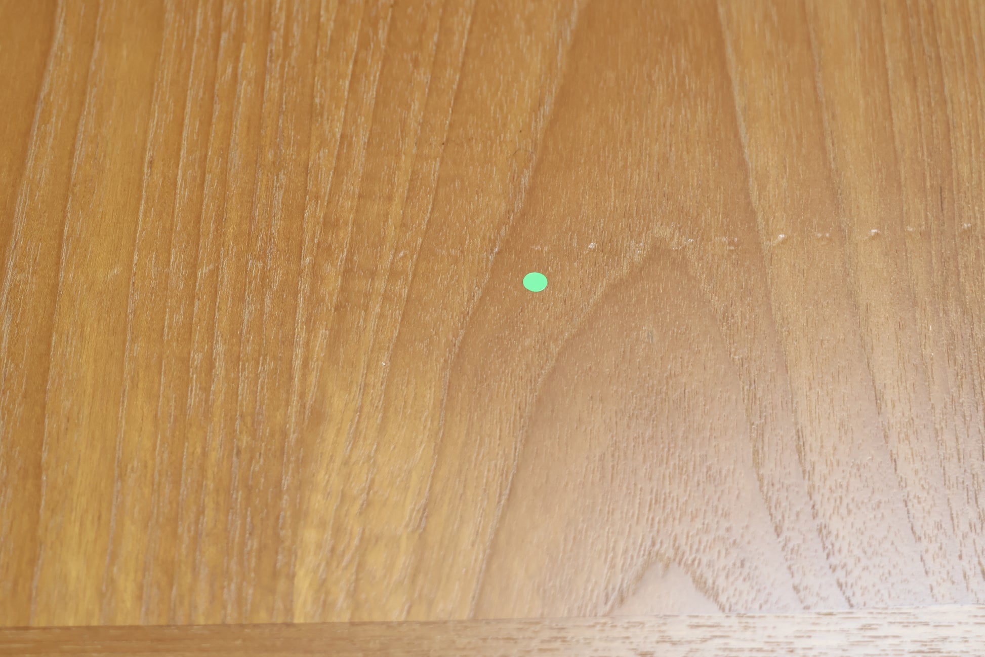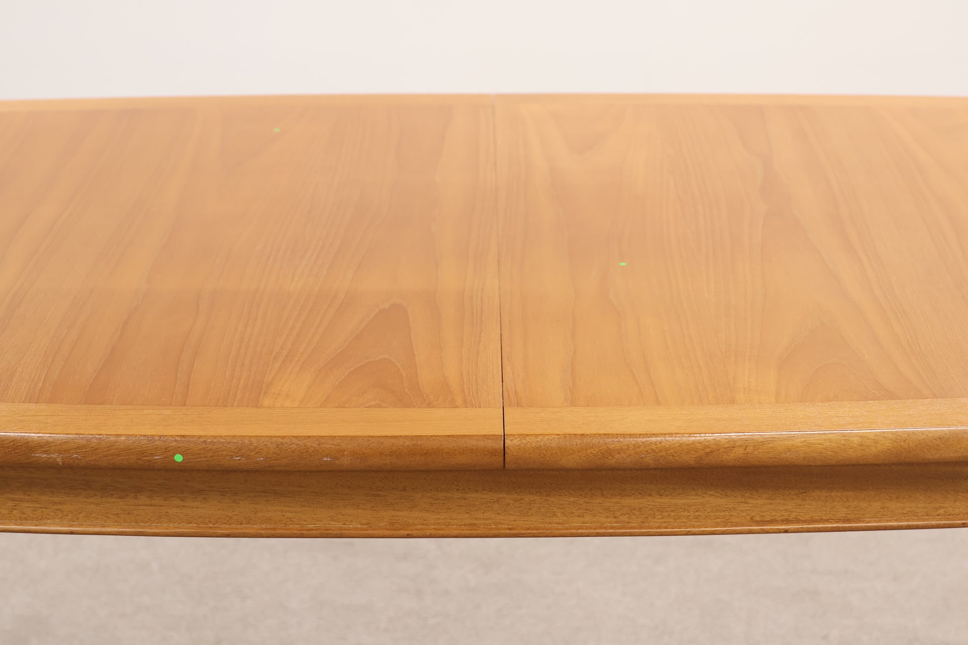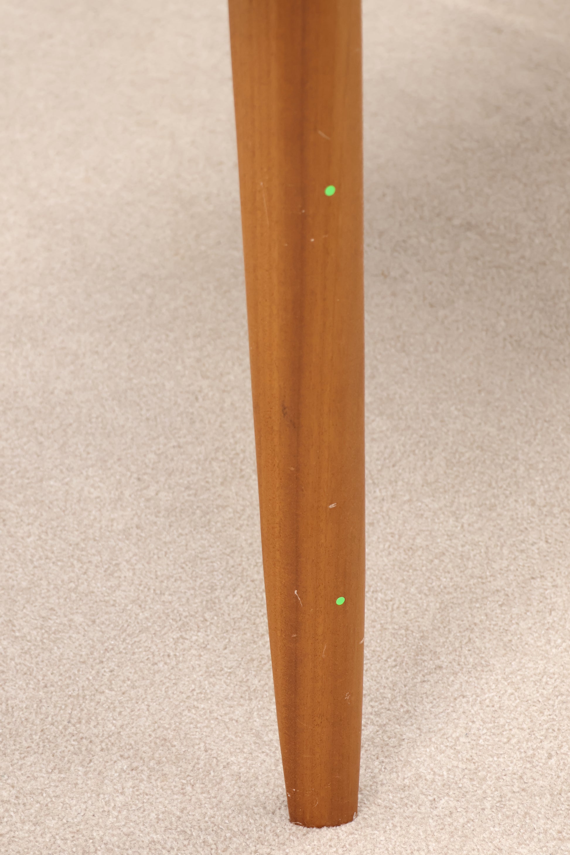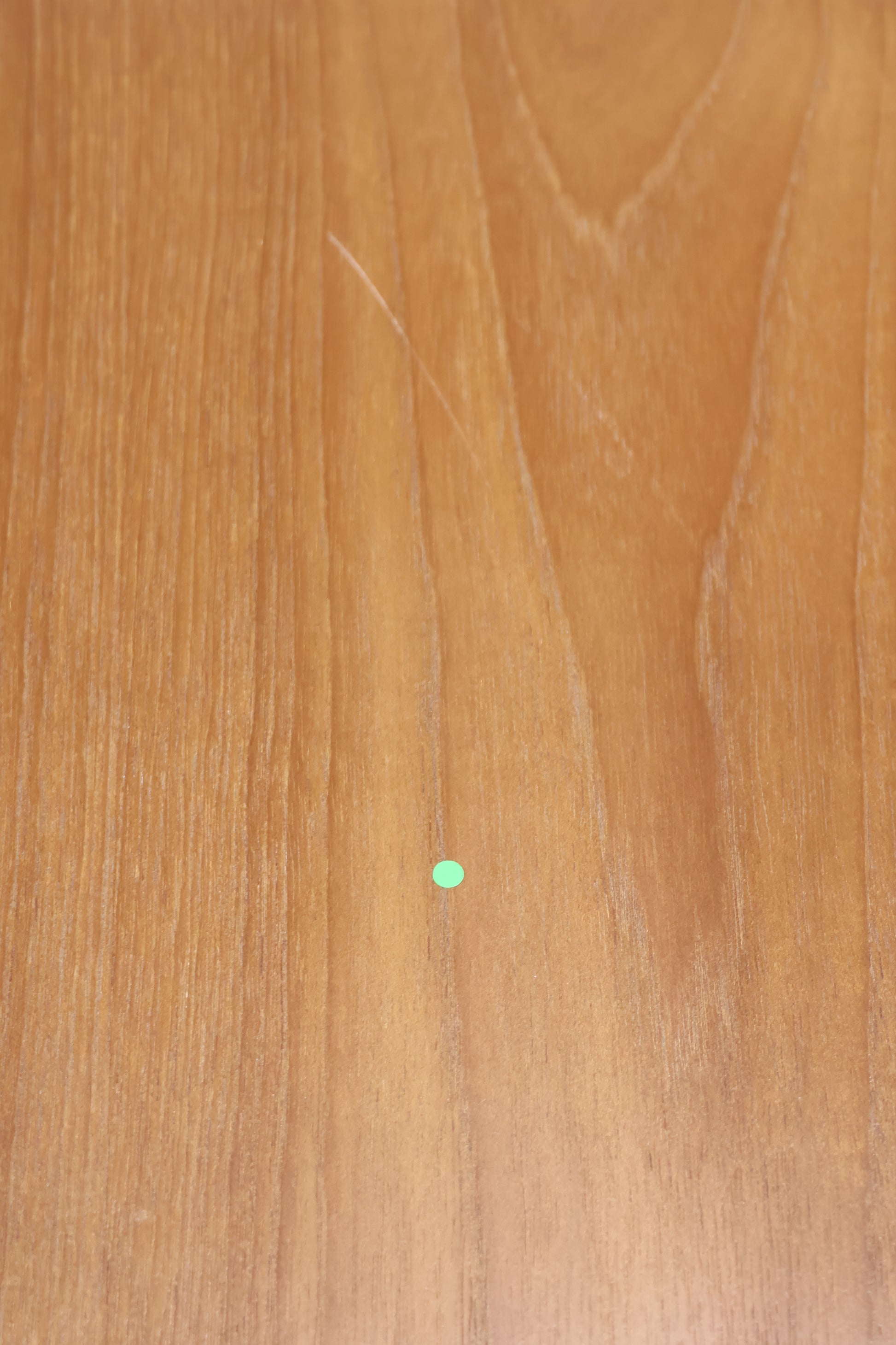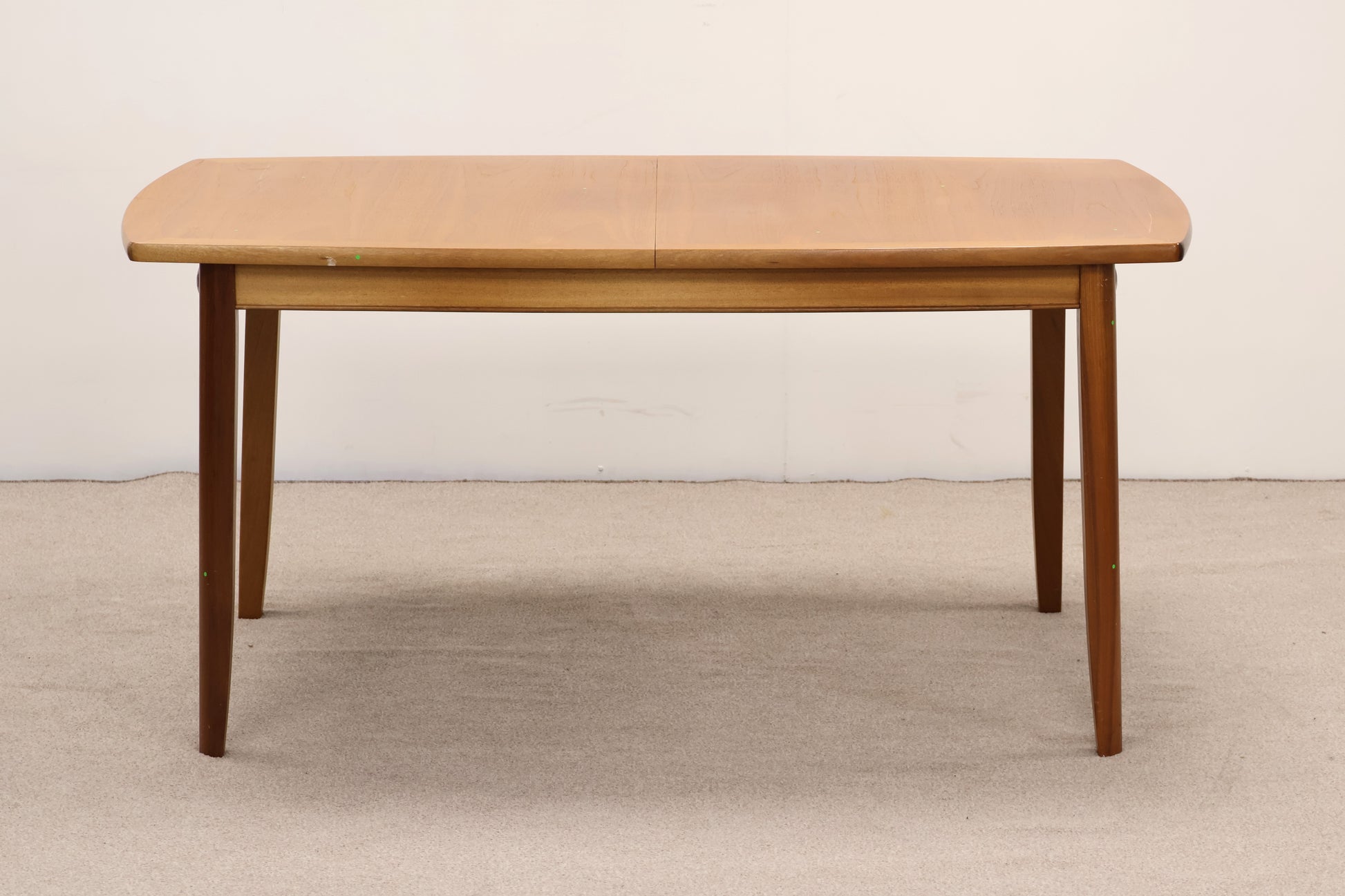 This teak wood table features natural durability and a warm finish. It has some scratch marks and dents that reflect its use and character. Please note, the table requires assembly upon arrival.