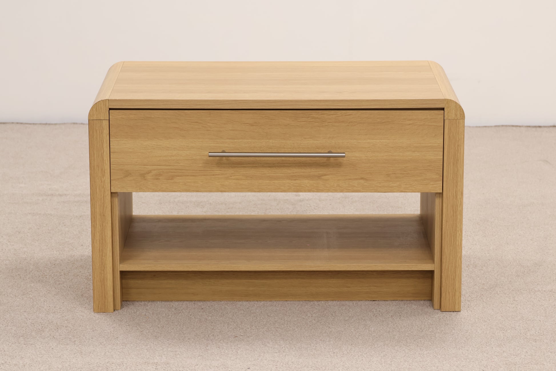 Compact TV unit featuring a practical drawer for storing remotes, cables, and media accessories. The streamlined design fits neatly into smaller living spaces without compromising on functionality.