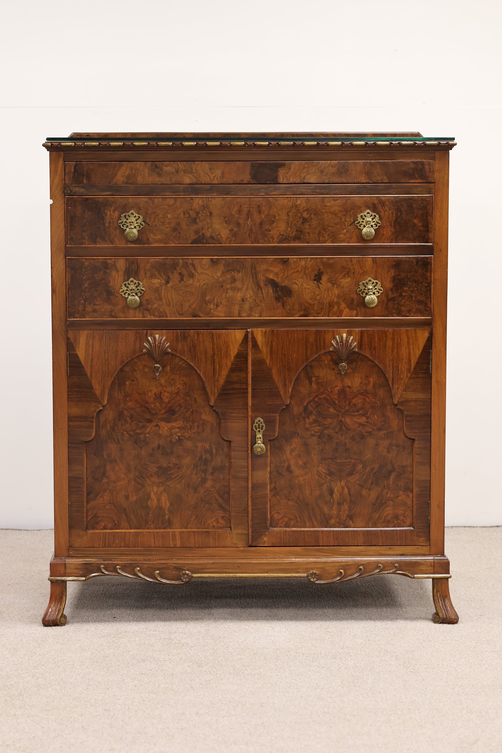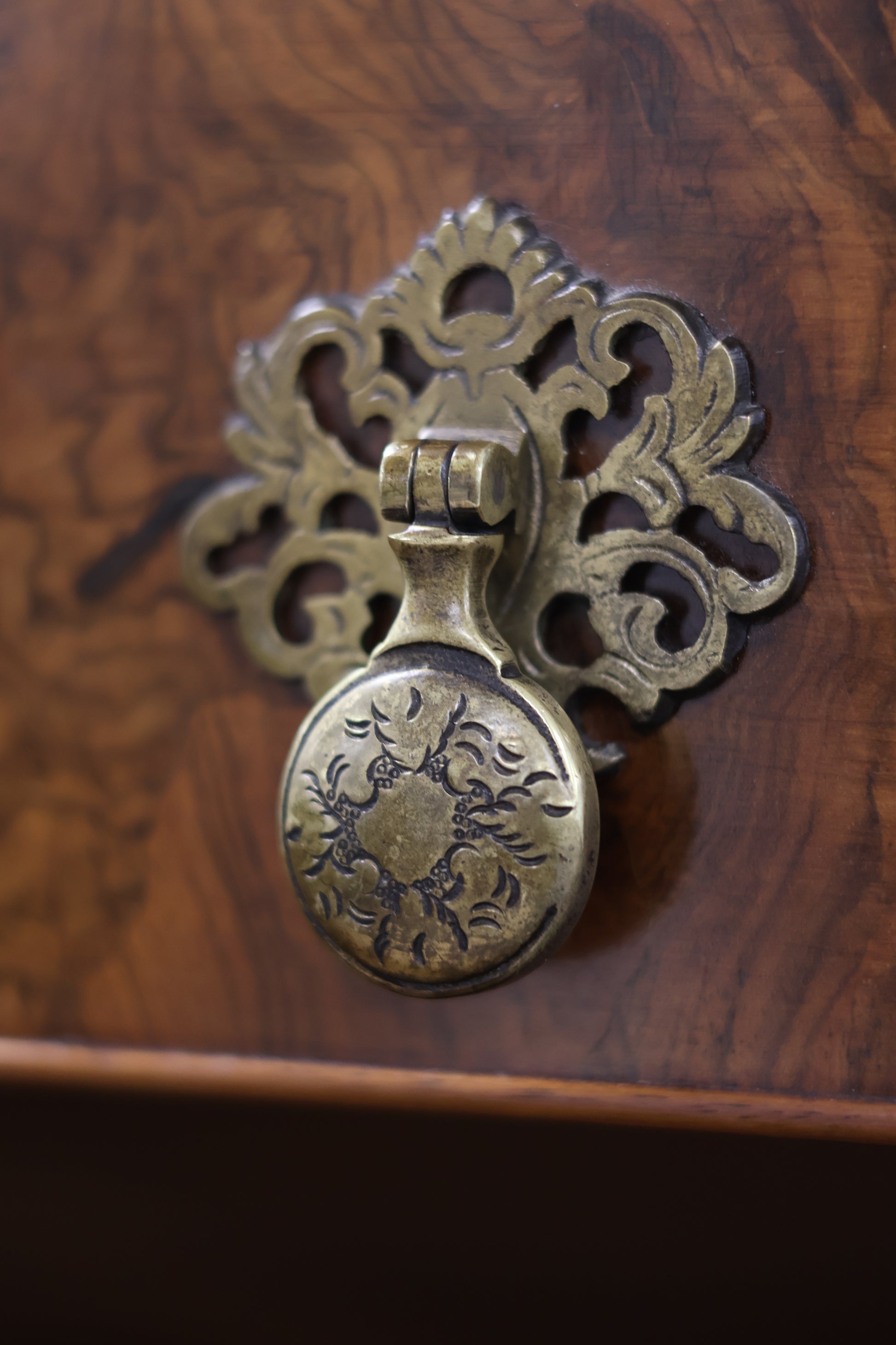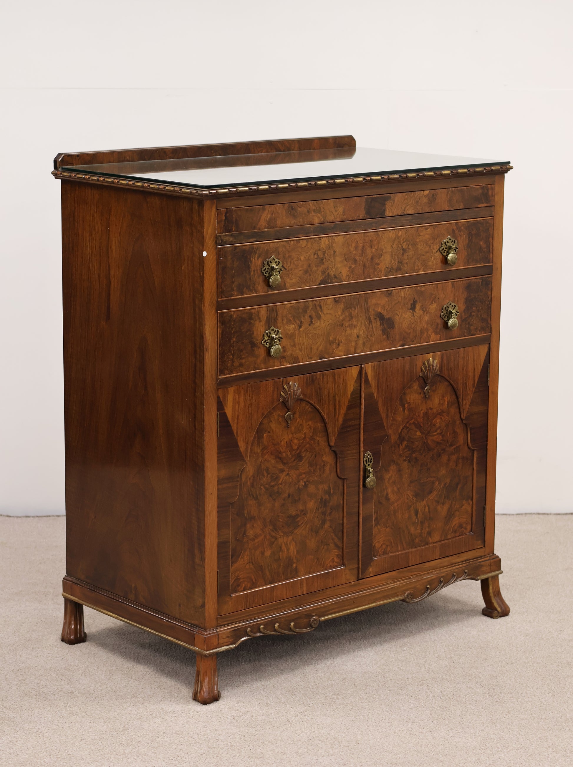 This vintage piece, likely from the Edwardian or Art Deco era, is crafted from rich walnut wood, showcasing its natural color and grain. It features elegant swan neck and foliate drop handles, along with a discreet hidden jewellery drawer accessed by a button inside. A charming addition, it brings authentic period character to any room.