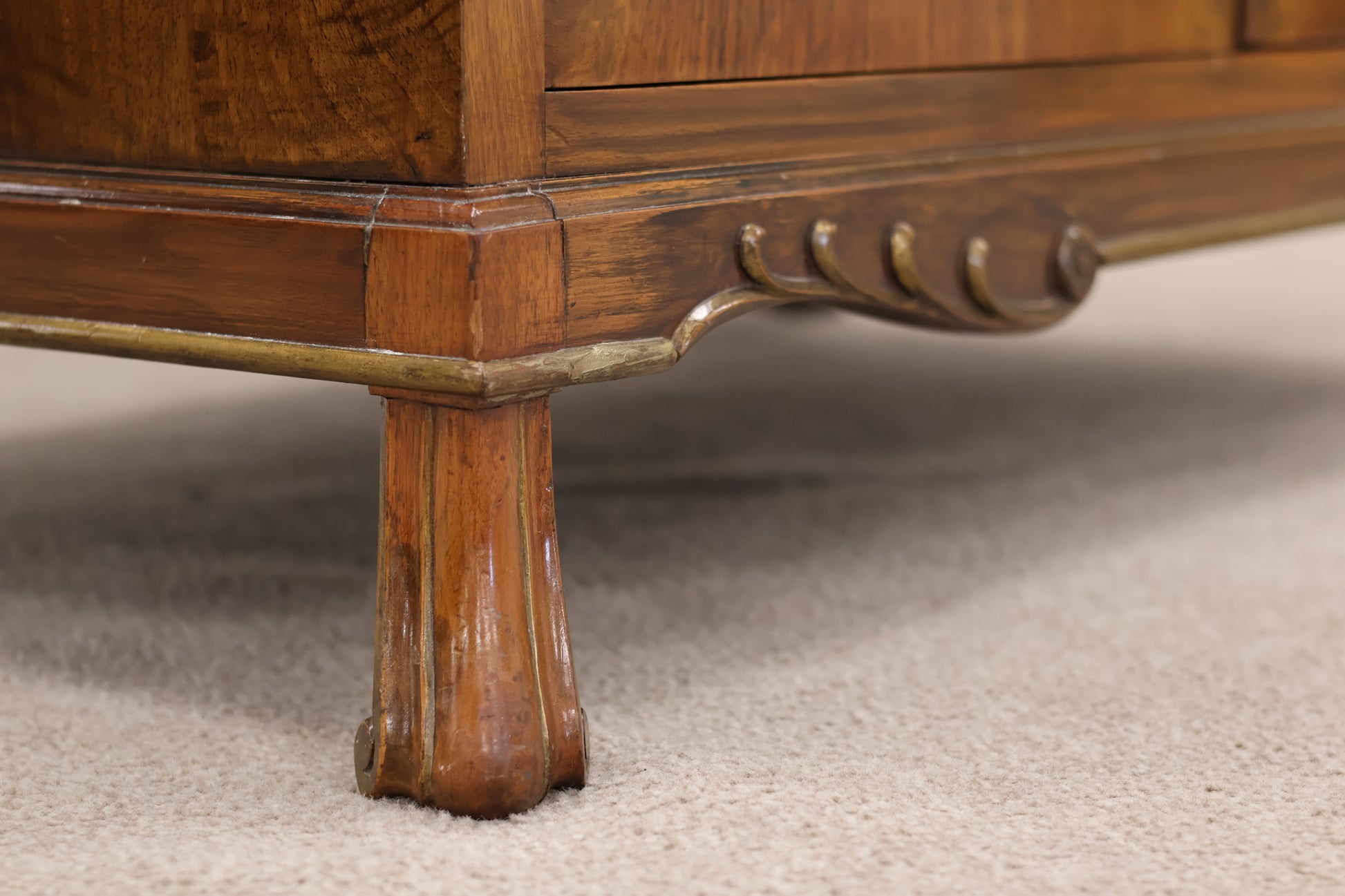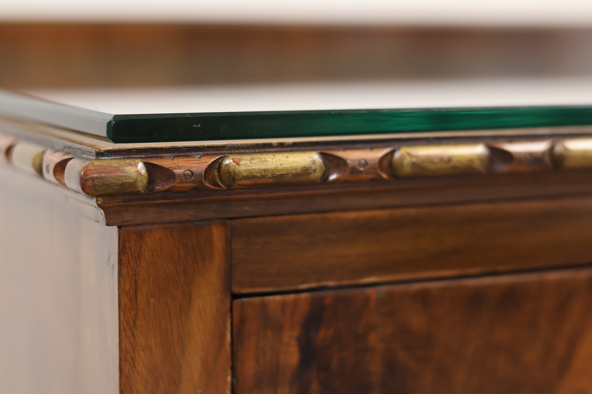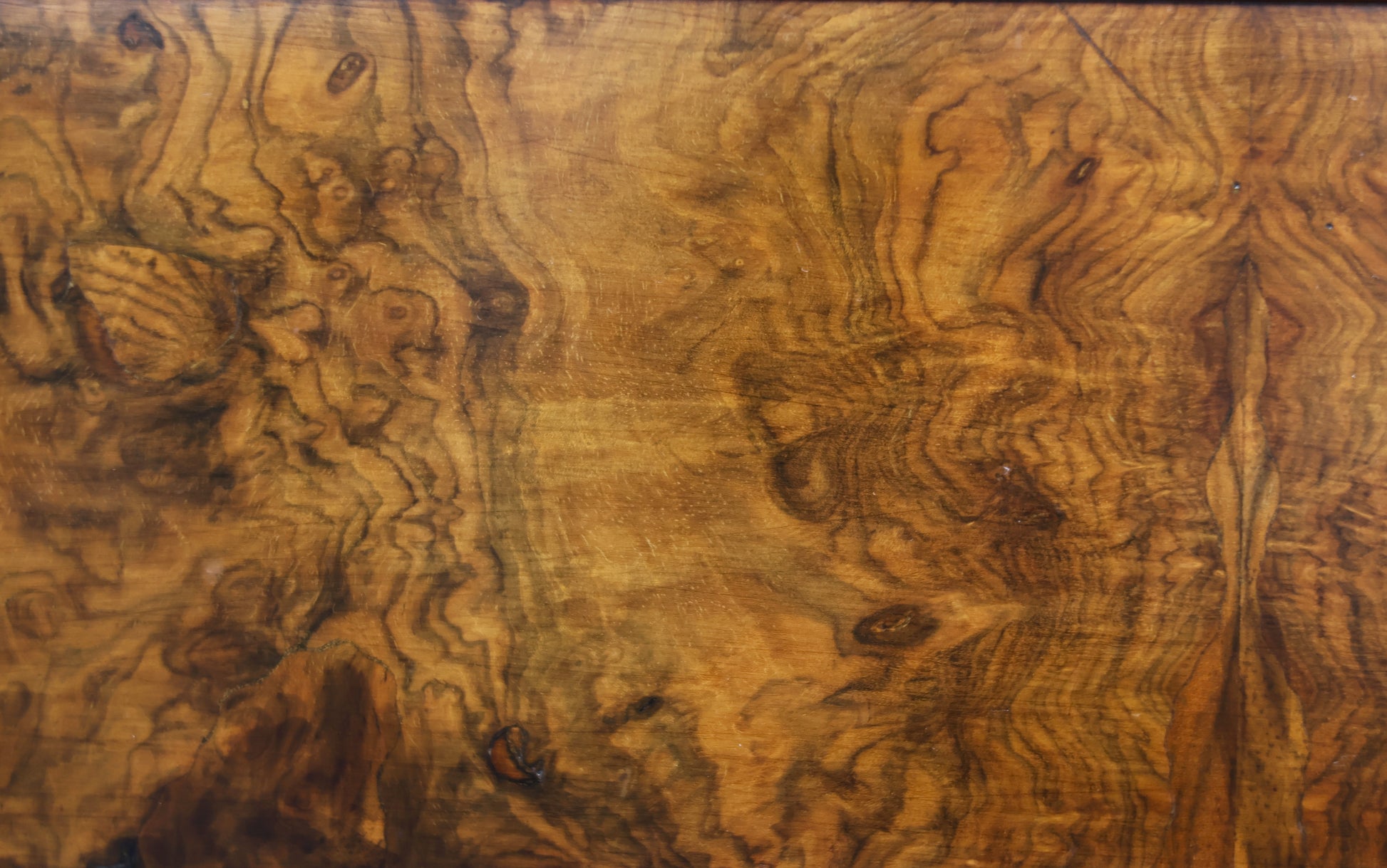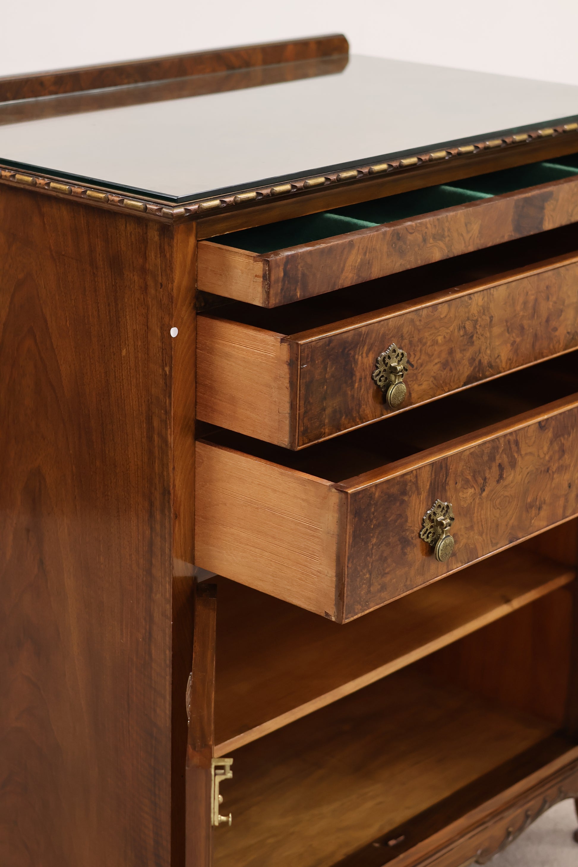 This vintage piece, likely from the Edwardian or Art Deco era, is crafted from rich walnut wood, showcasing its natural color and grain. It features elegant swan neck and foliate drop handles, along with a discreet hidden jewellery drawer accessed by a button inside. A charming addition, it brings authentic period character to any room.