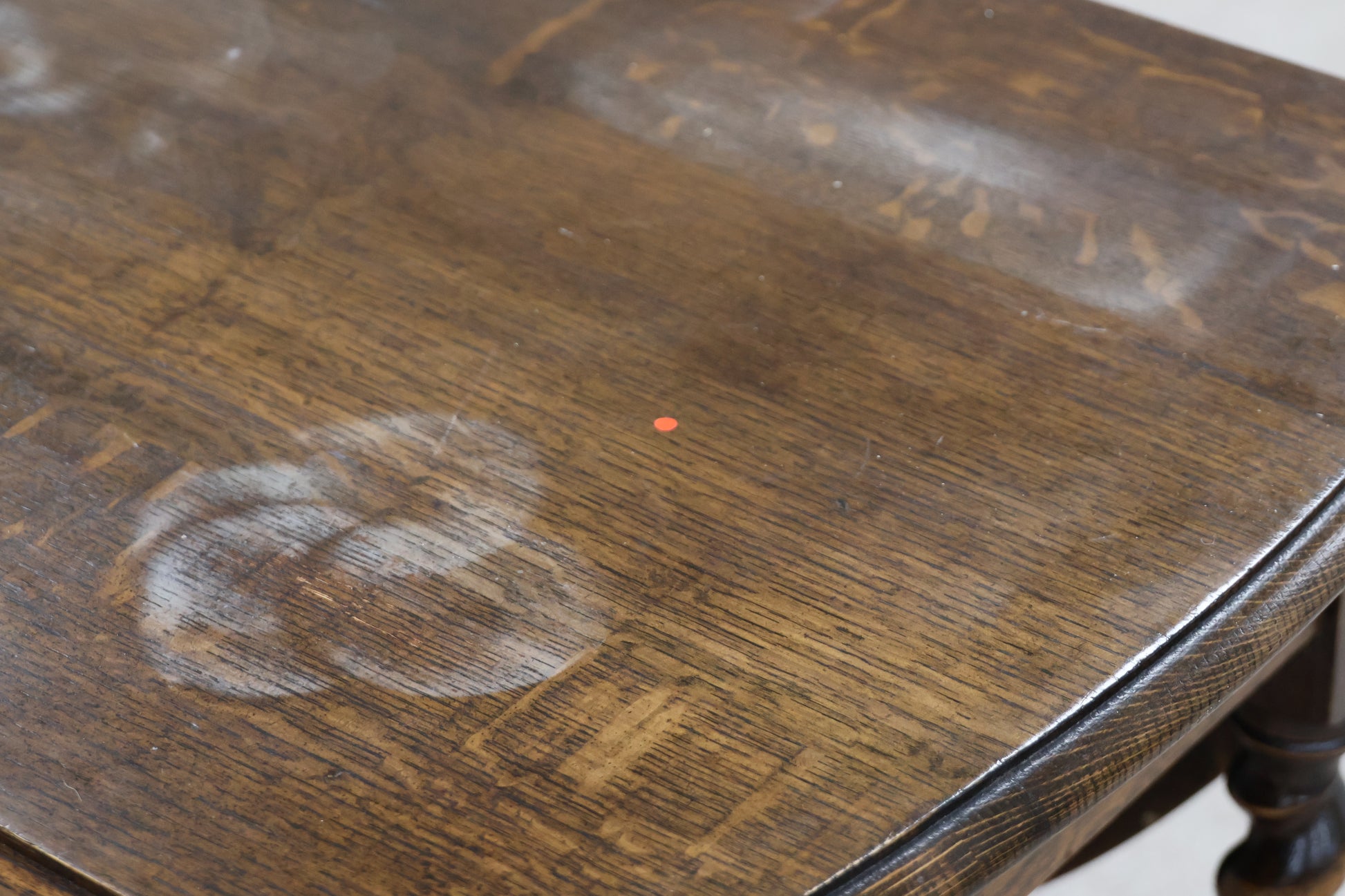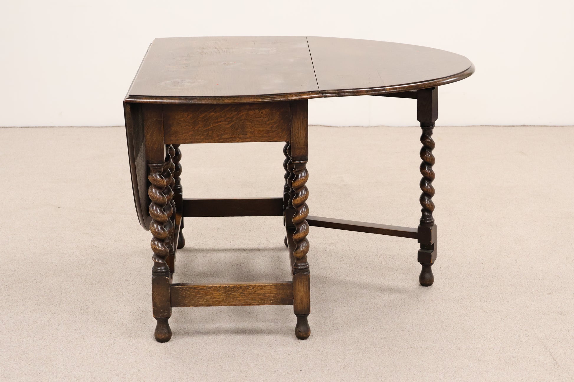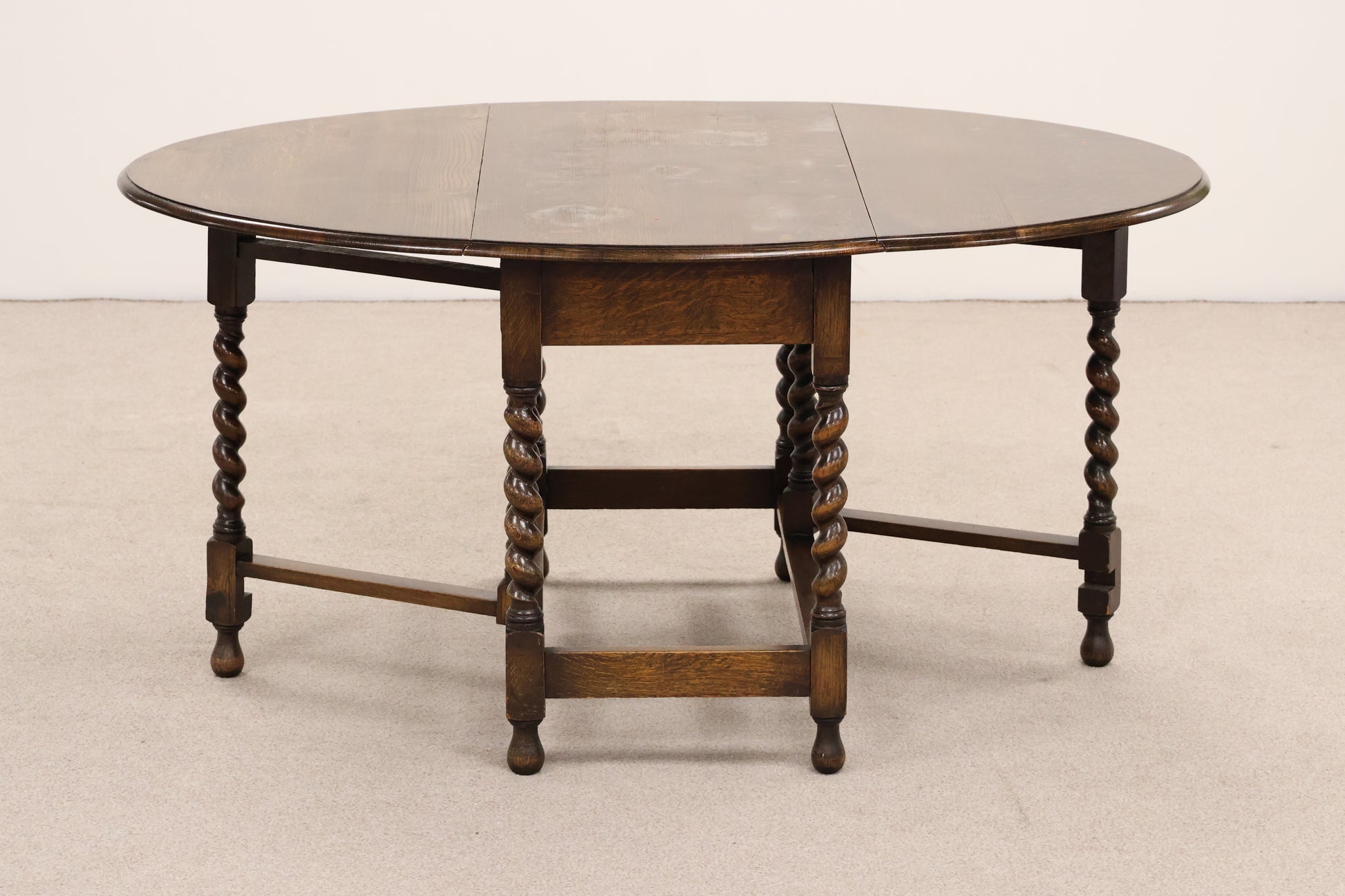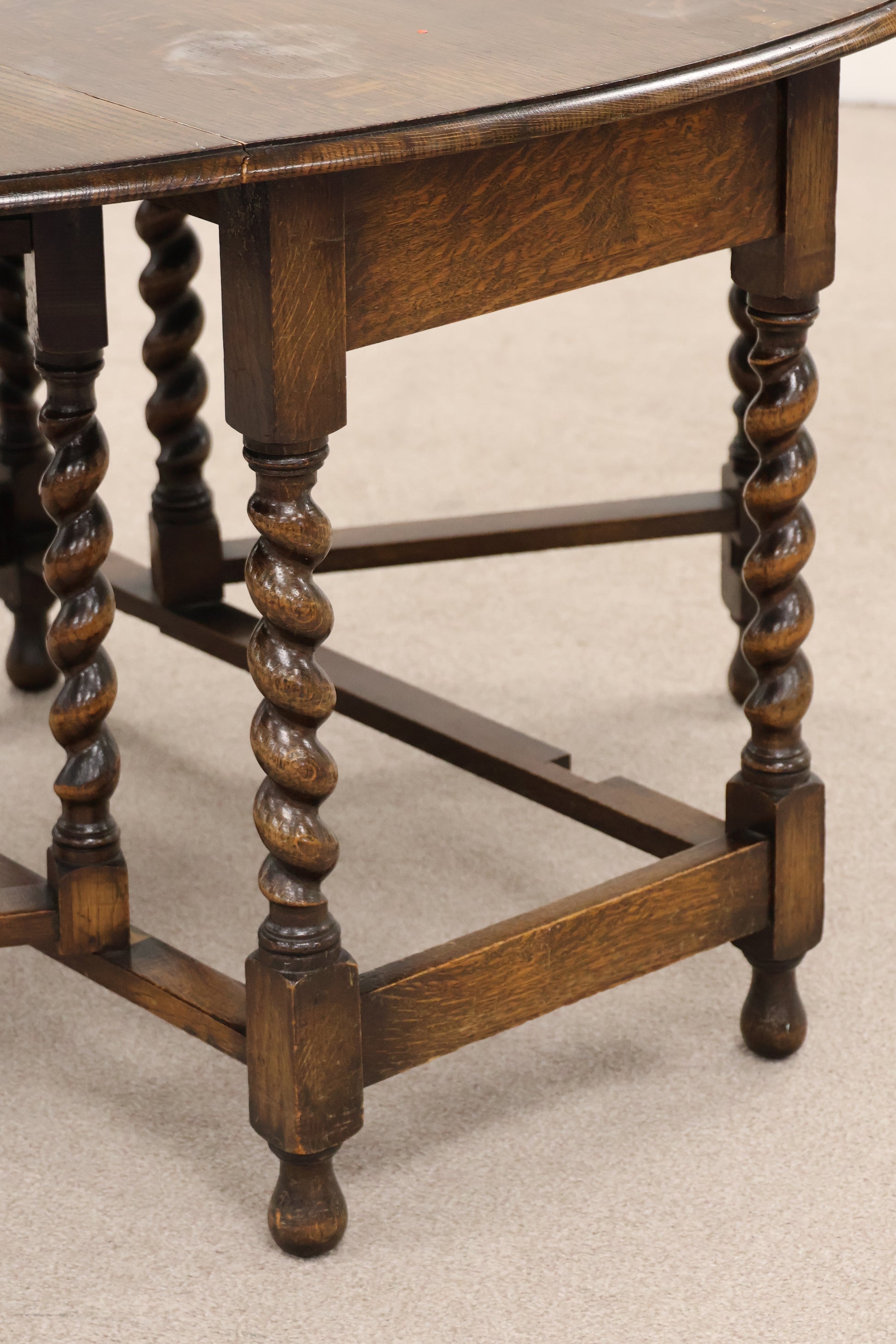 This charming vintage oak table features a practical drop-leaf design, perfect for adapting to your space. The distinctive barley twist legs add authentic character and period appeal, whilst the gateleg mechanism allows you to expand the surface when needed and tuck it away when you don't. Crafted from solid oak, it's built to last and brings warmth to any room. An ideal piece for those who appreciate traditional furniture with genuine functionality.
