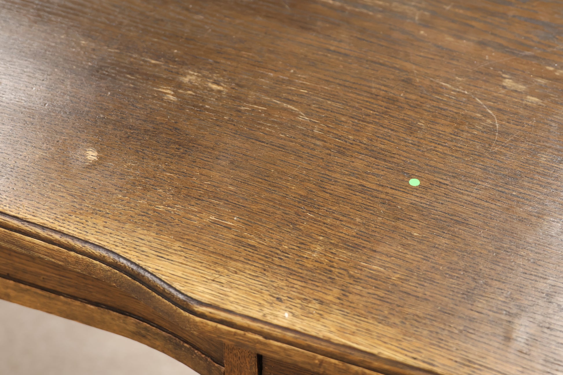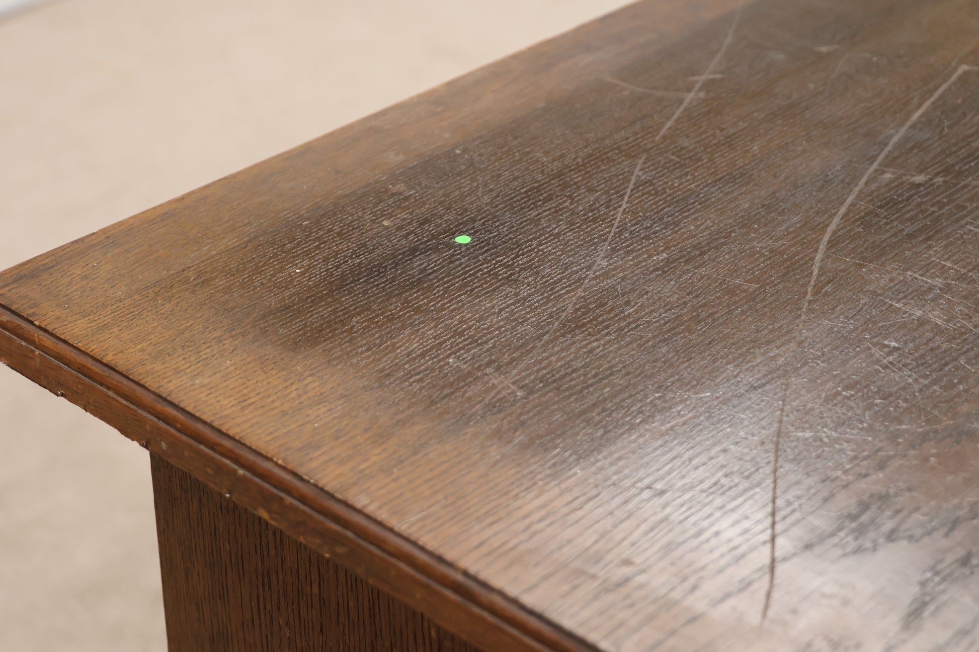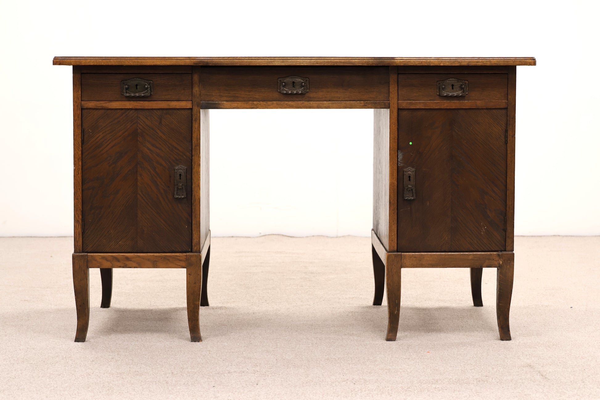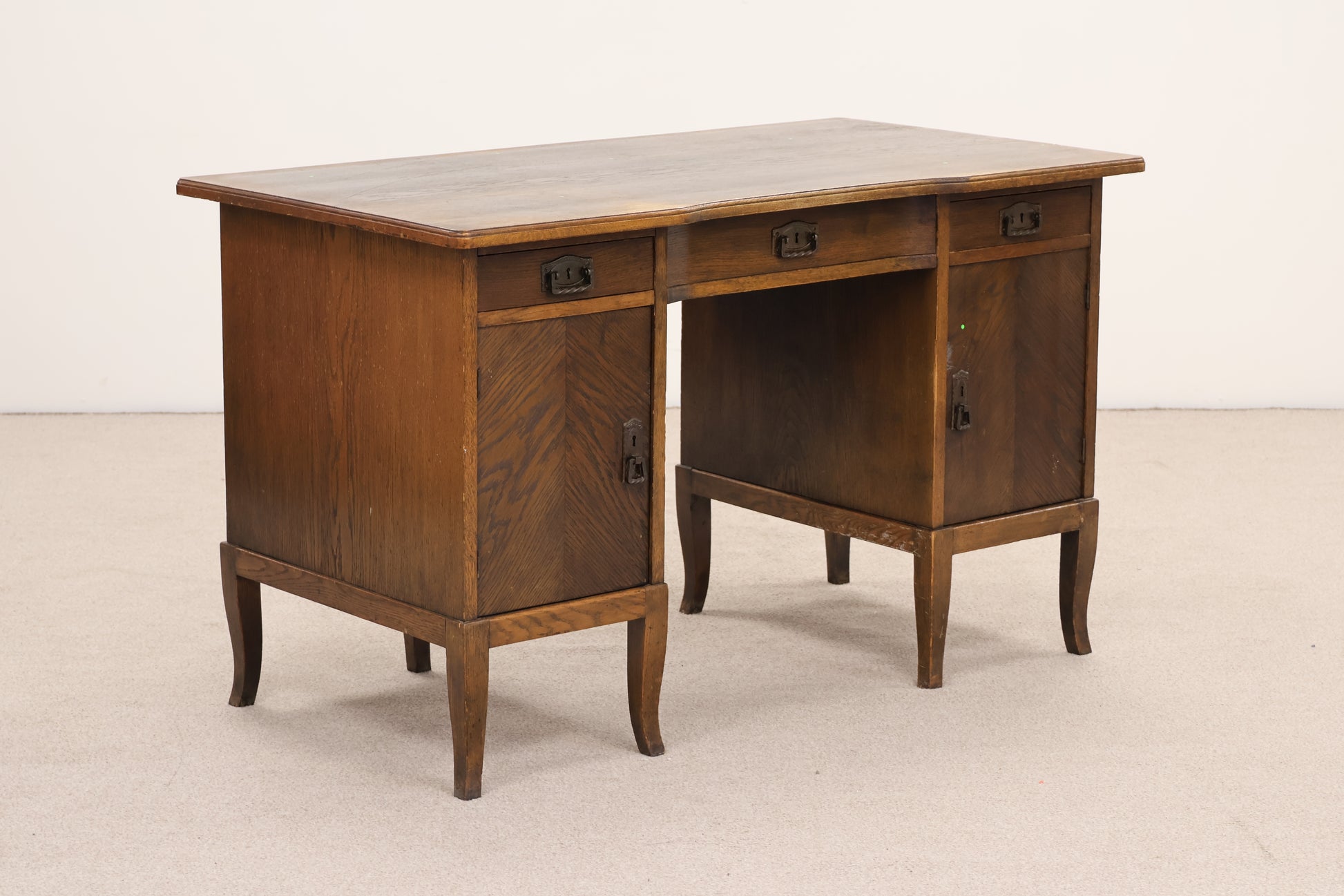 Elegant vintage writing desk featuring a practical three-drawer configuration paired with a cupboard that cleverly conceals additional document storage. Perfect for those seeking authentic period charm without sacrificing functionality.