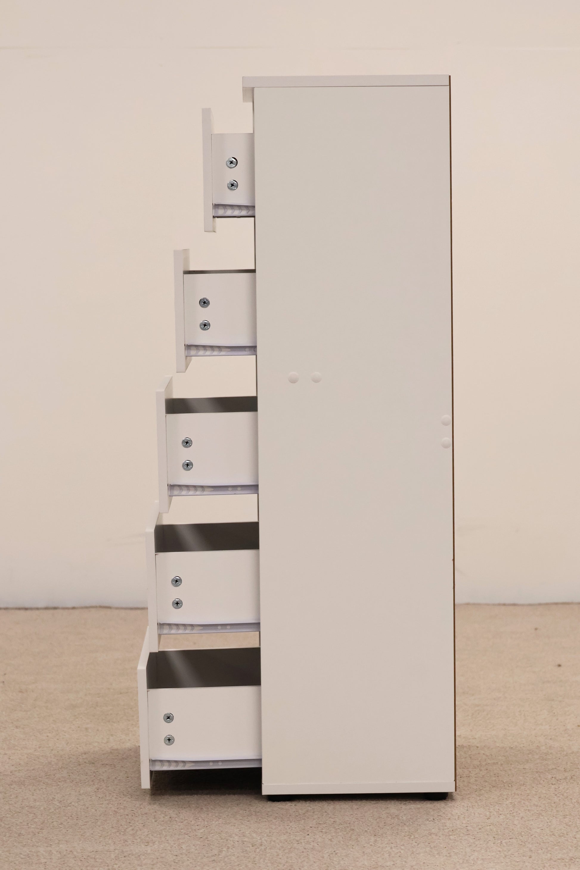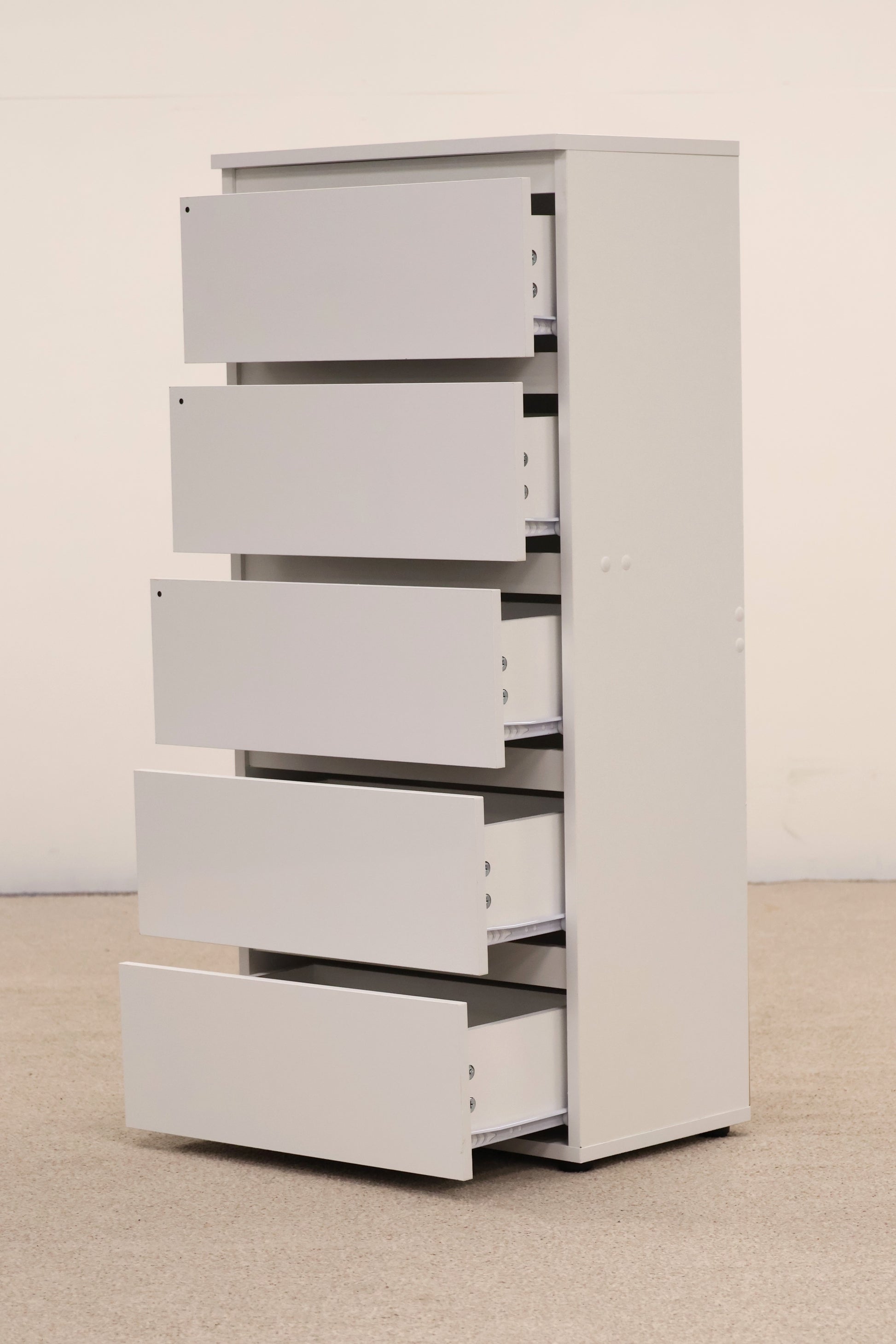 This sleek white tallboy chest offers practical storage without consuming floor space. Five generously sized drawers provide ample room for clothing, linens, and household essentials, while the vertical design makes it ideal for bedrooms or compact living areas.