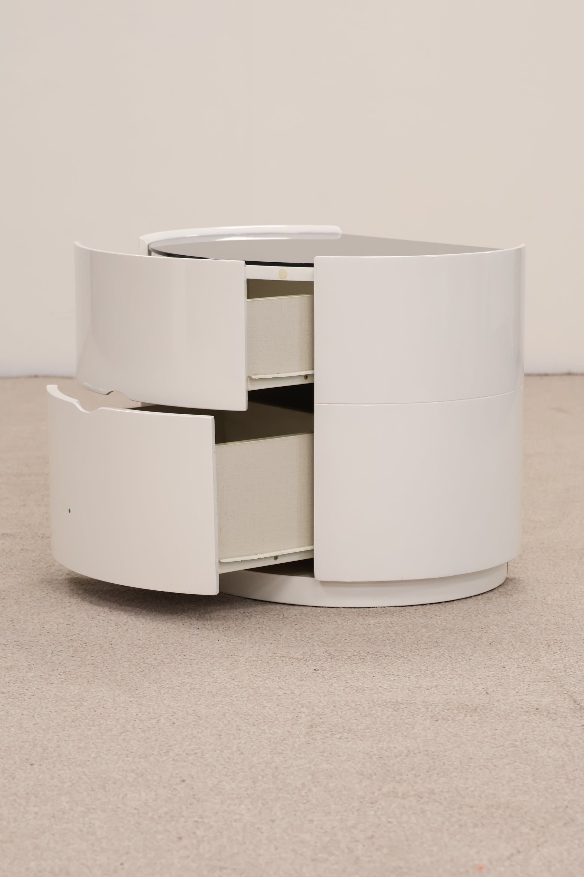 Sleek white gloss bedside table featuring two spacious drawers for storing bedding essentials, books, and personal items. The contemporary finish adds a clean, modern touch to any bedroom décor whilst the compact design fits neatly beside your bed.